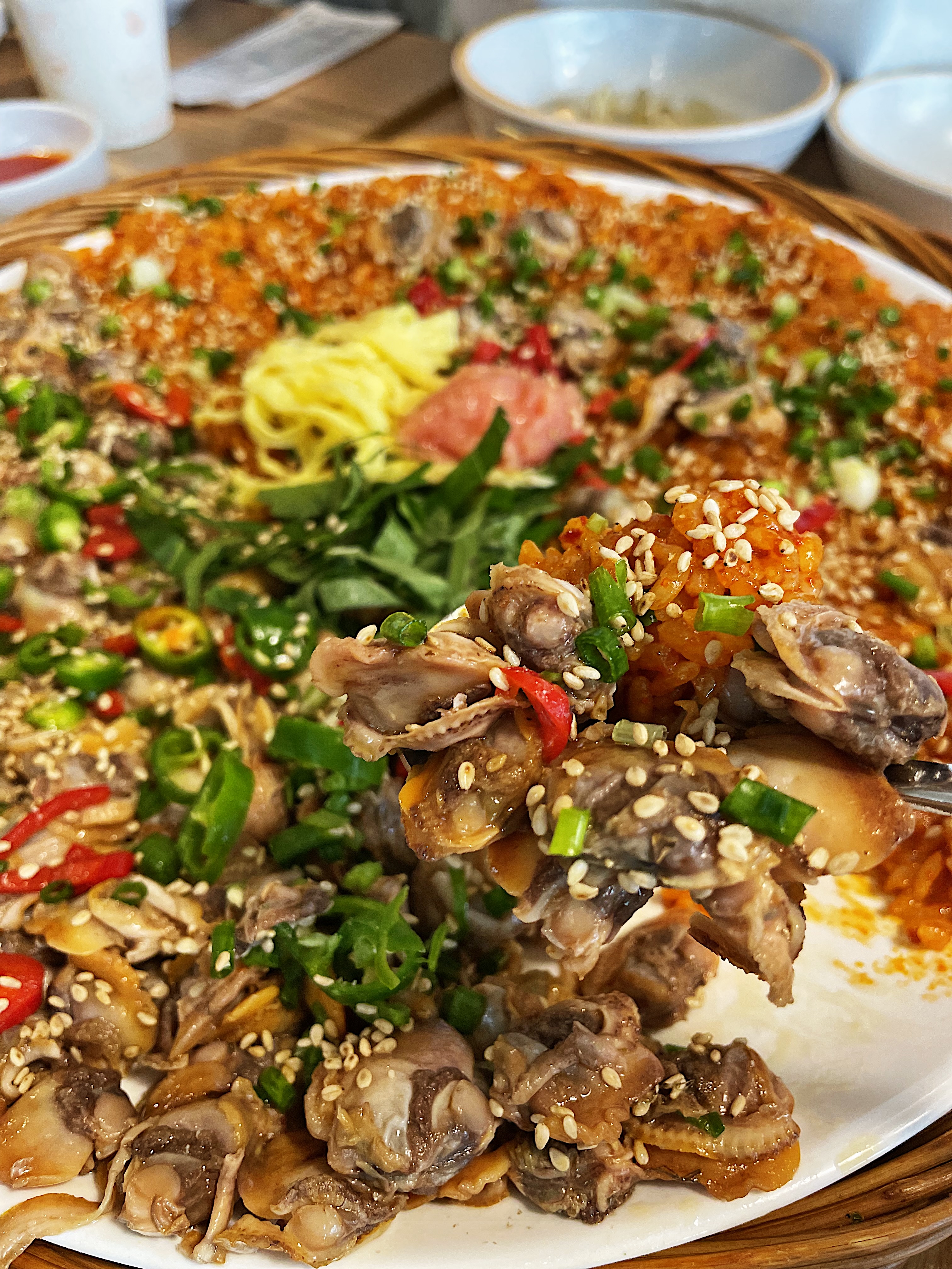 양념된 비빔밥에 꼬막 올리고 명란젓도 콕! 올려서 먹으니