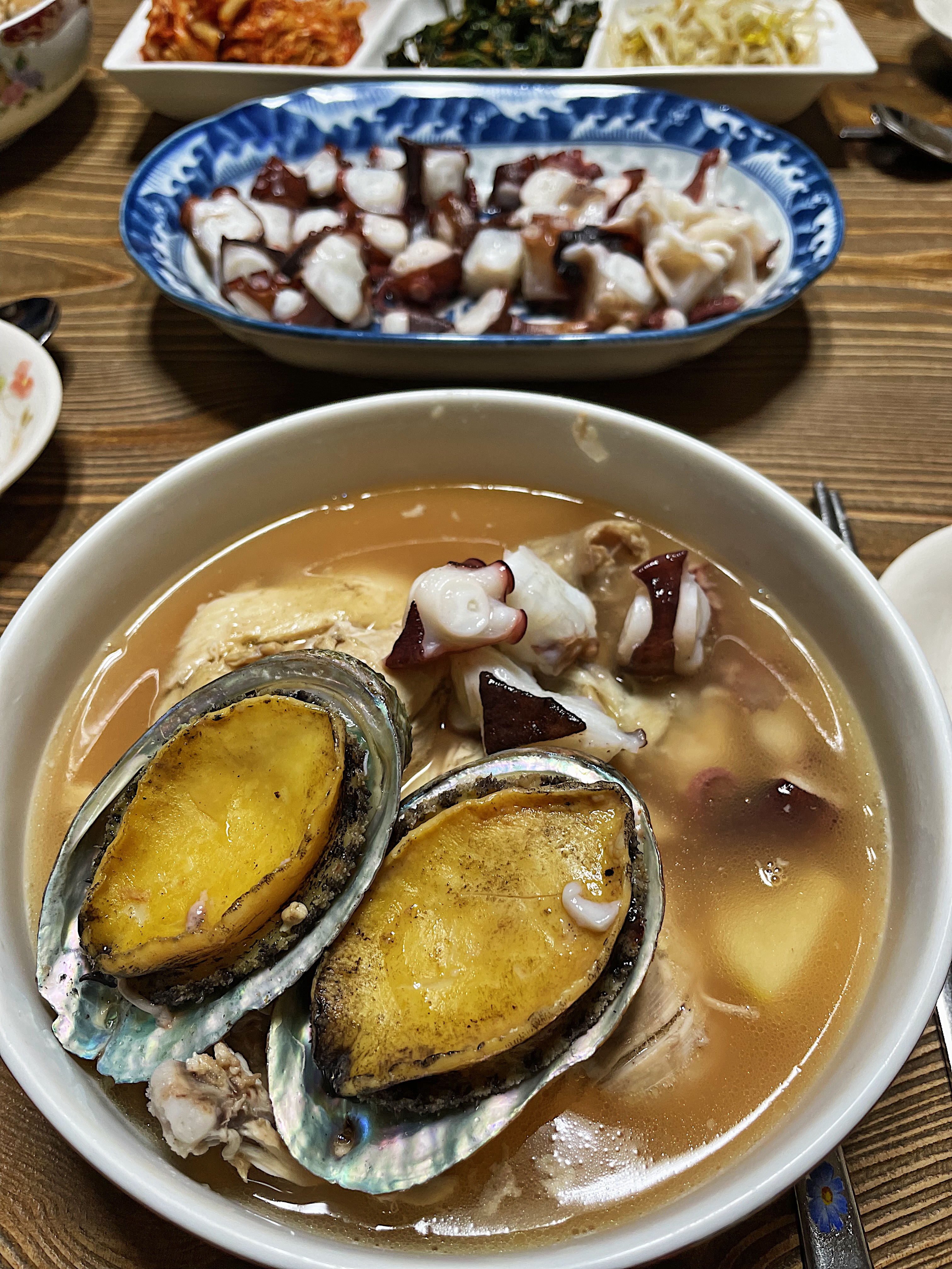 닭 한 마리 삶아서 전복에 문어까지 든든하게 잘 먹었네요.
