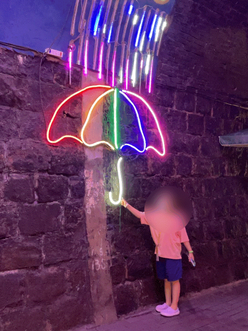 보리밭을 지나자 천정에는 무지갯빛 우산이 매달려 있고, 그 아래 벽면에는 갑자기 로보트 태권V 가 나타났습니다.