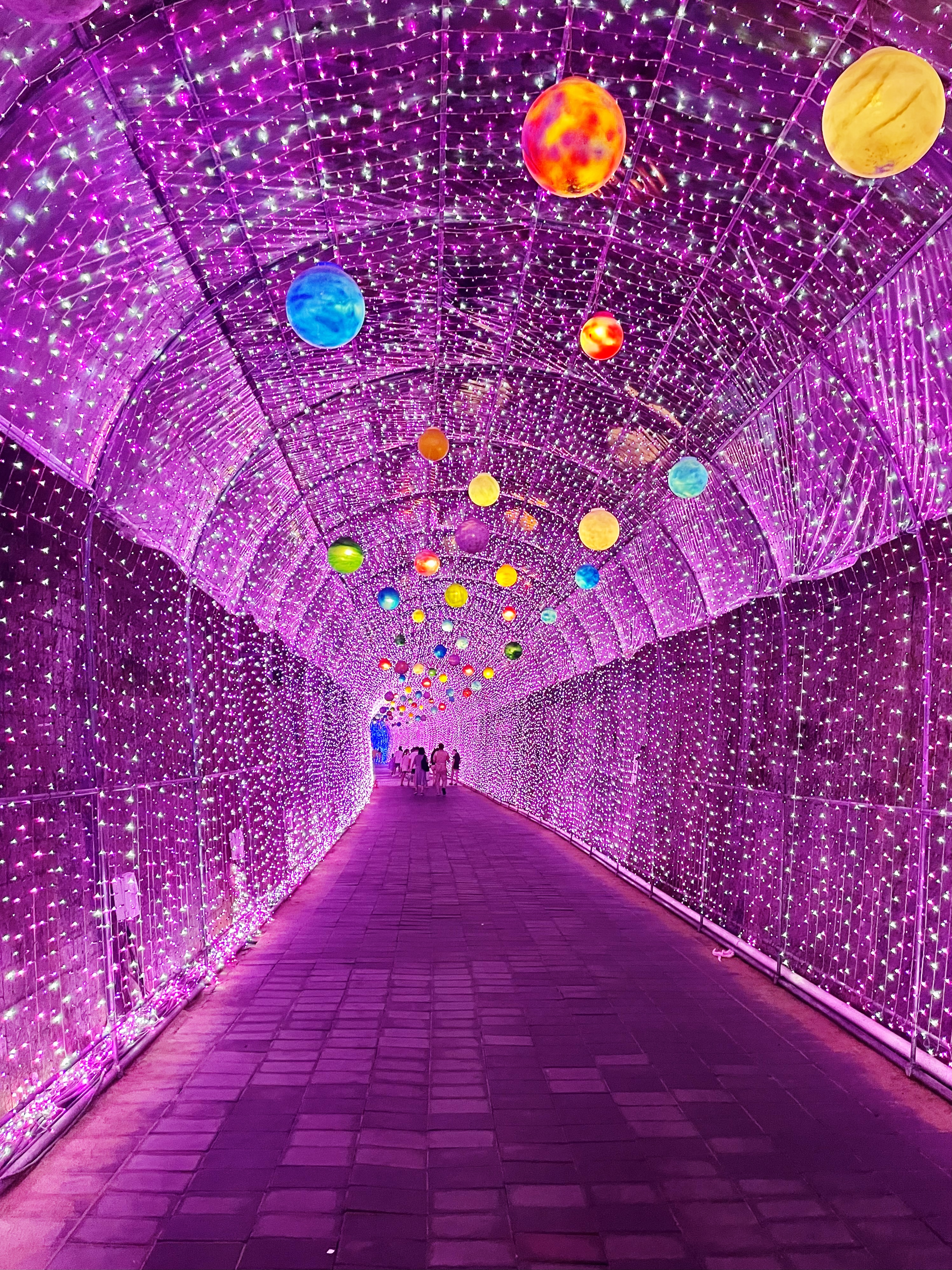 양쪽 벽과 천정에 자줏빛 작은 전구와 행성처럼 생긴 동그란 구가 매달려 있었는데요.