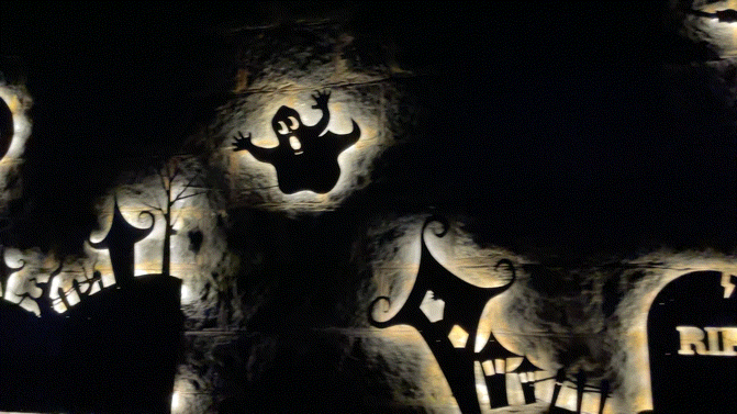 무지갯빛 구름과 할로윈 파티 공간을 지나갑니다.