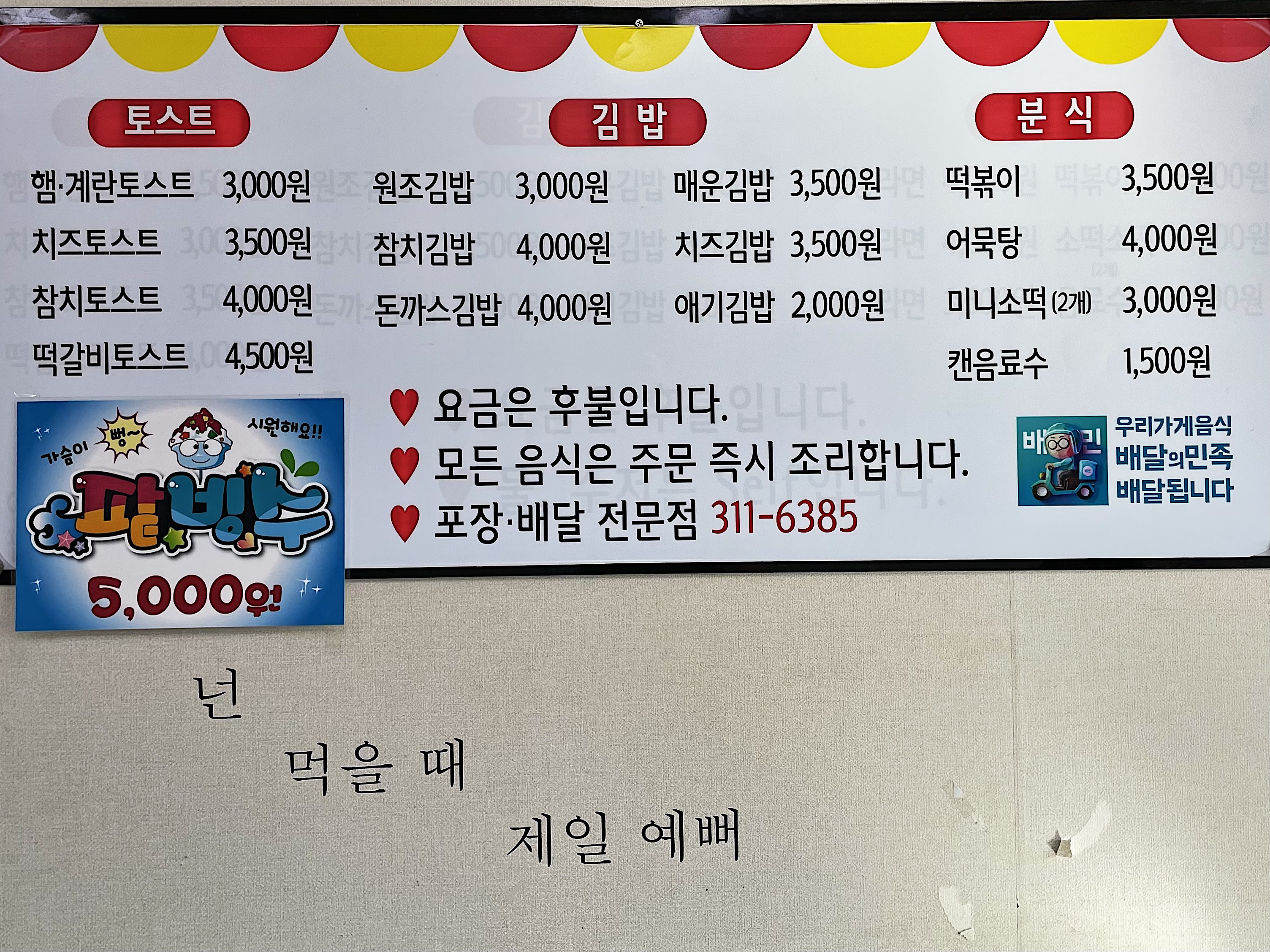 메뉴는 토스트 4종, 김밥 6종 이 메인이구요