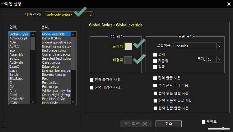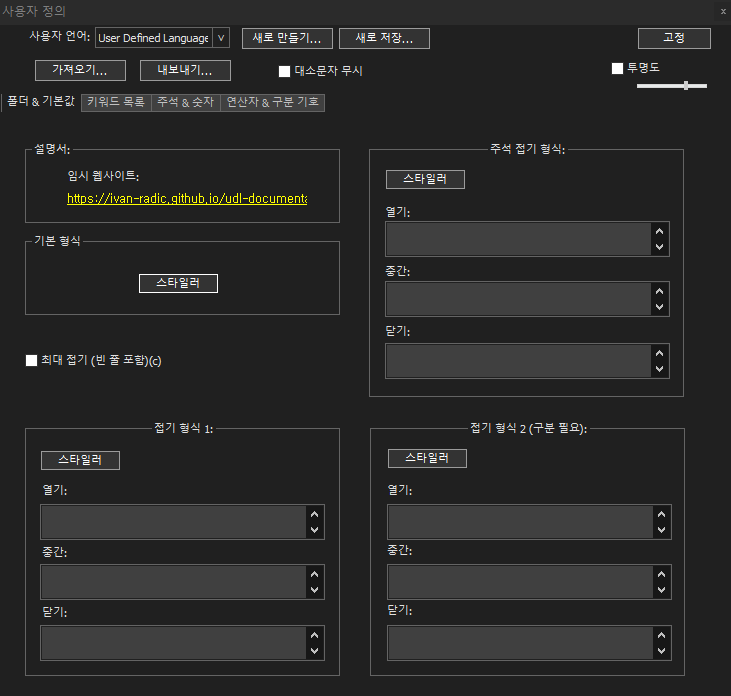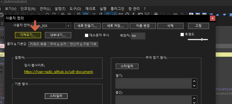 저는 현재 Notepad++테마를 Dark스타일의 테마를 적용해서 사용하다 보니 GitHub에서 다운받은 UDL(사용자 정의 언어)의 컬러와 배경컬러가 가독성이 너무 떨어지더라구요.