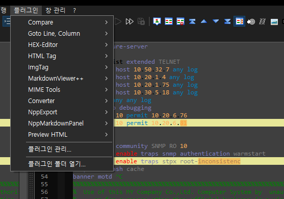설치된 플러그인은 Notepad++(NPP) 을 재실행하면 플러그인 메뉴에 추가되어 있는 걸 확인할 수 있습니다.