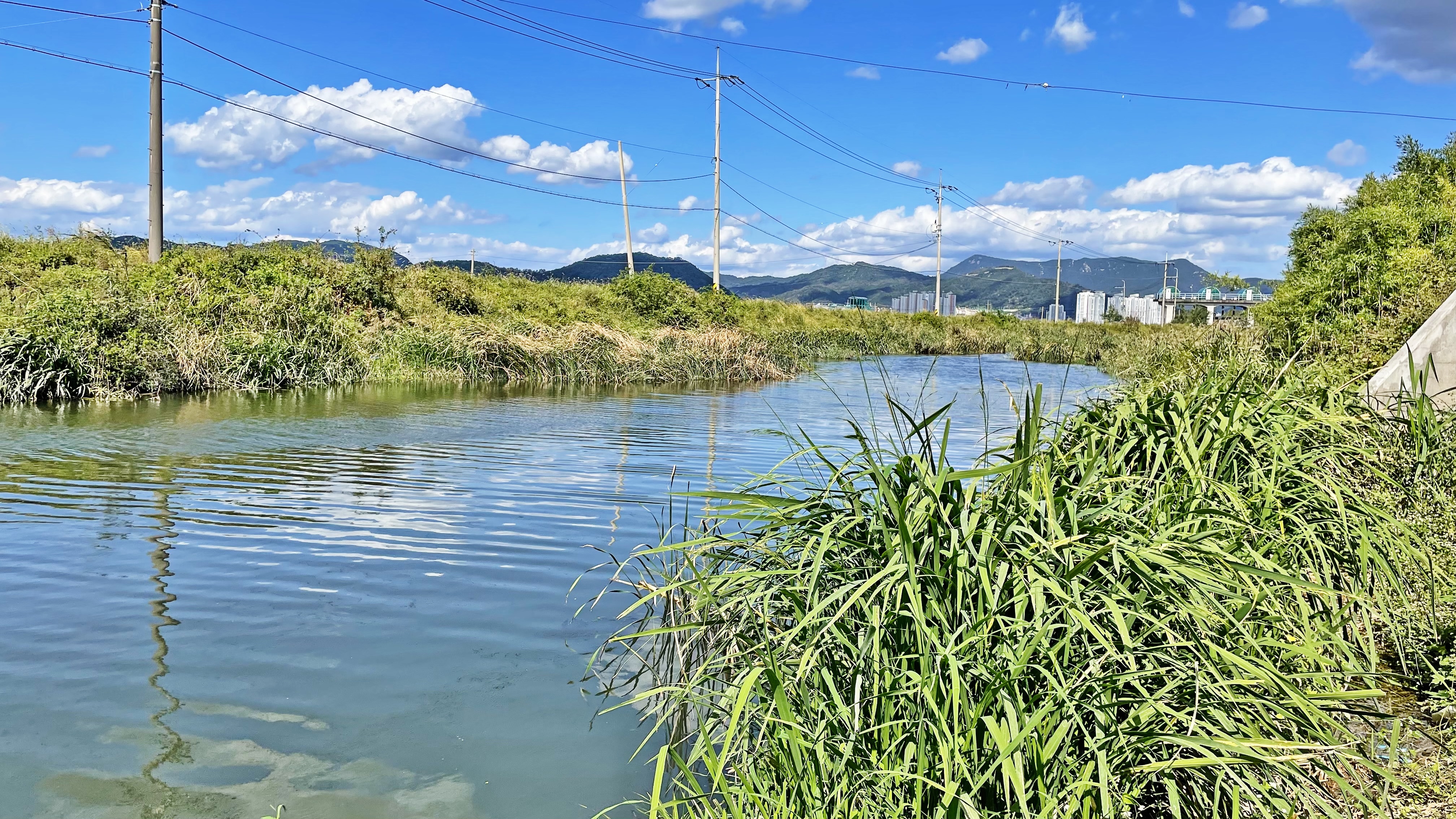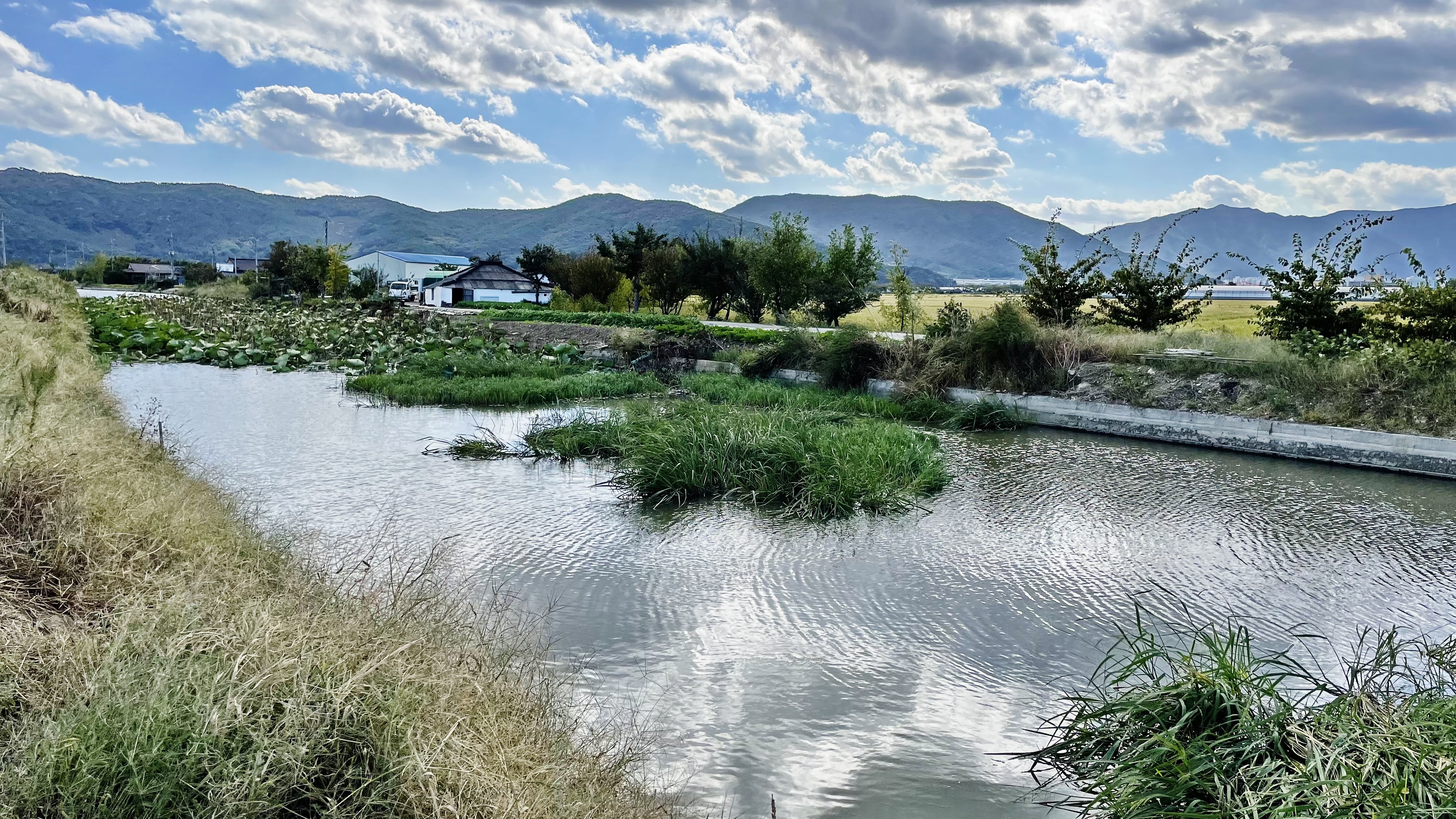 저 멀리 연줄기도 보이고 수로 가운데 풀들이 섬지역을 이루고 있는데,