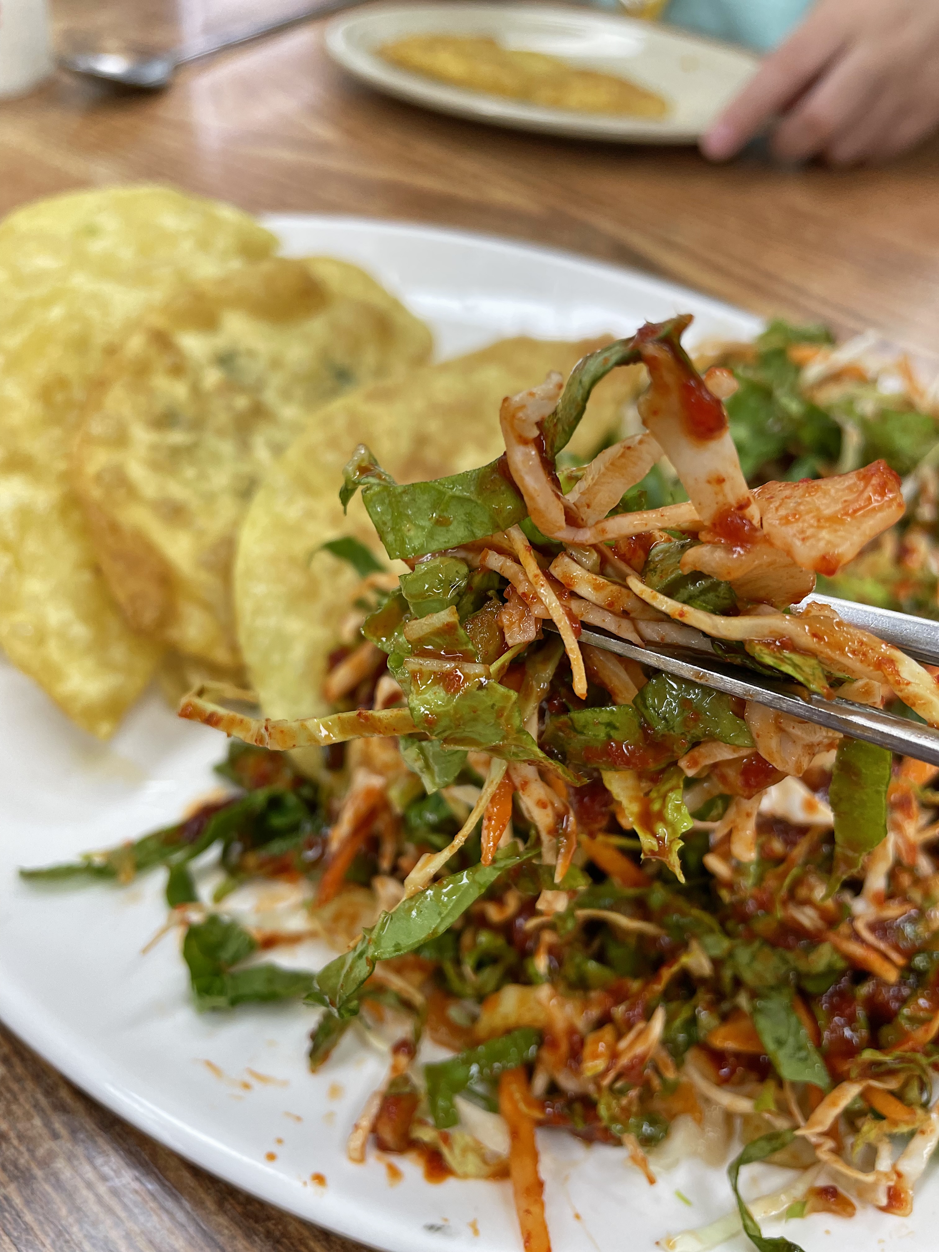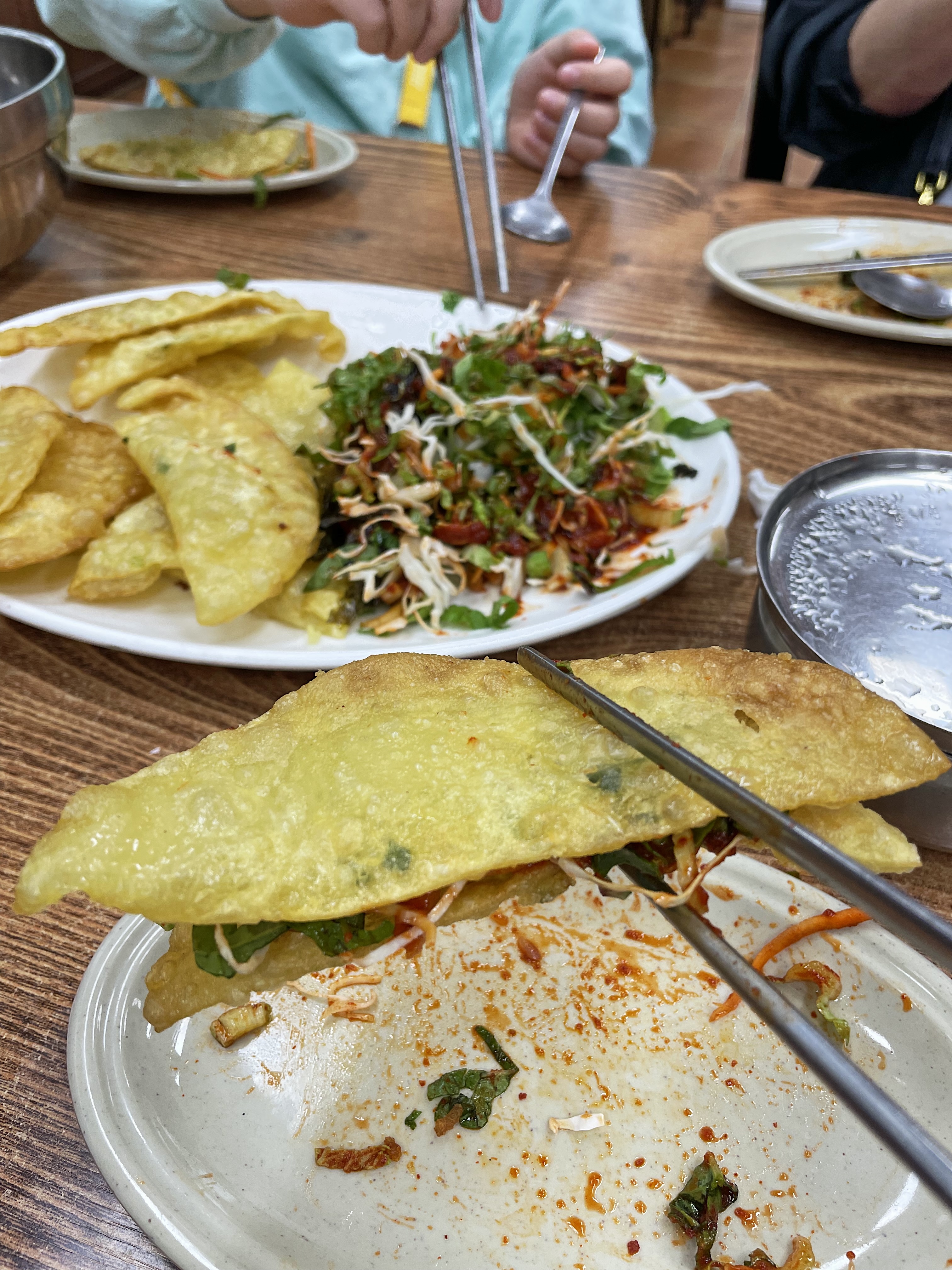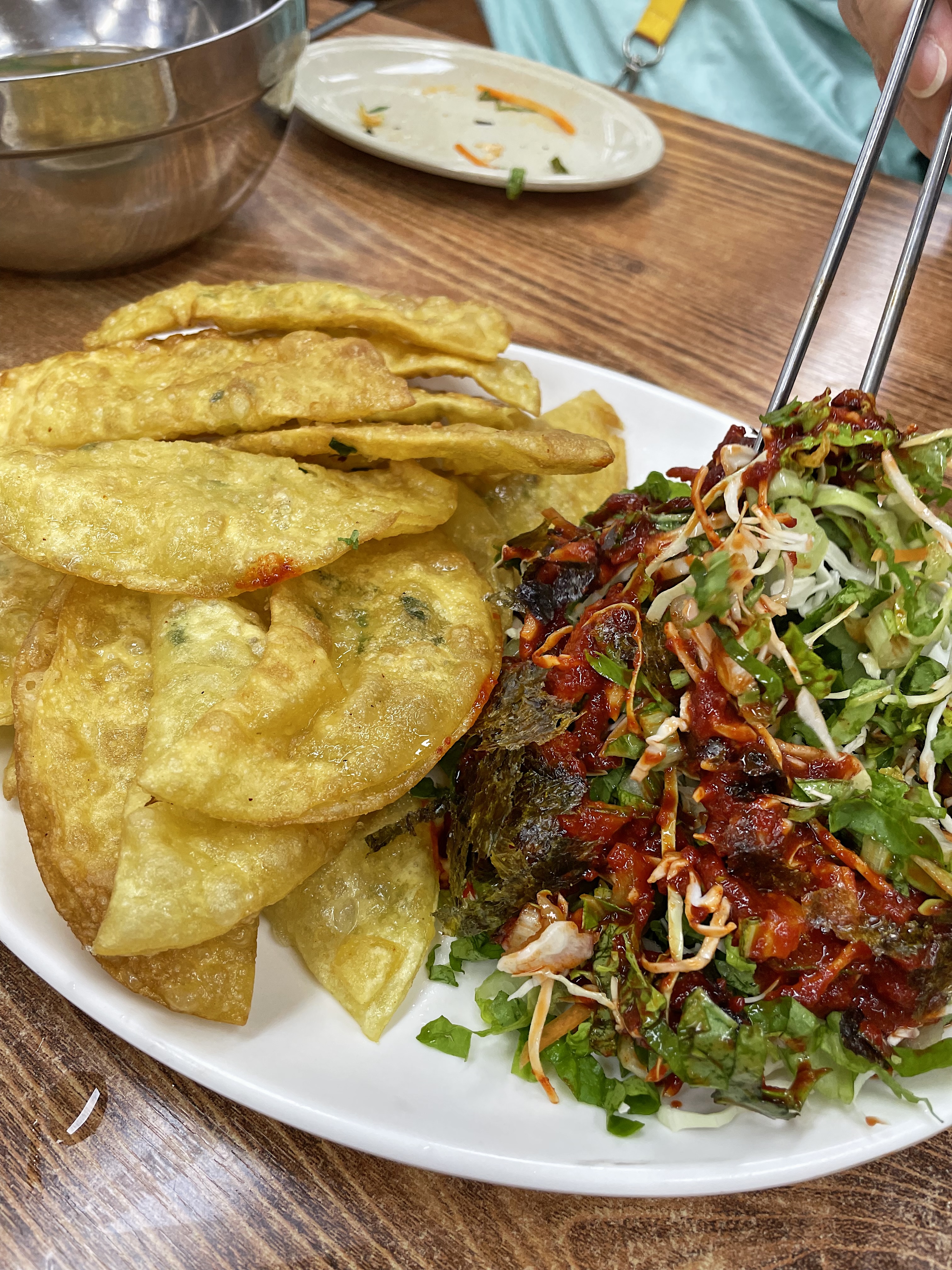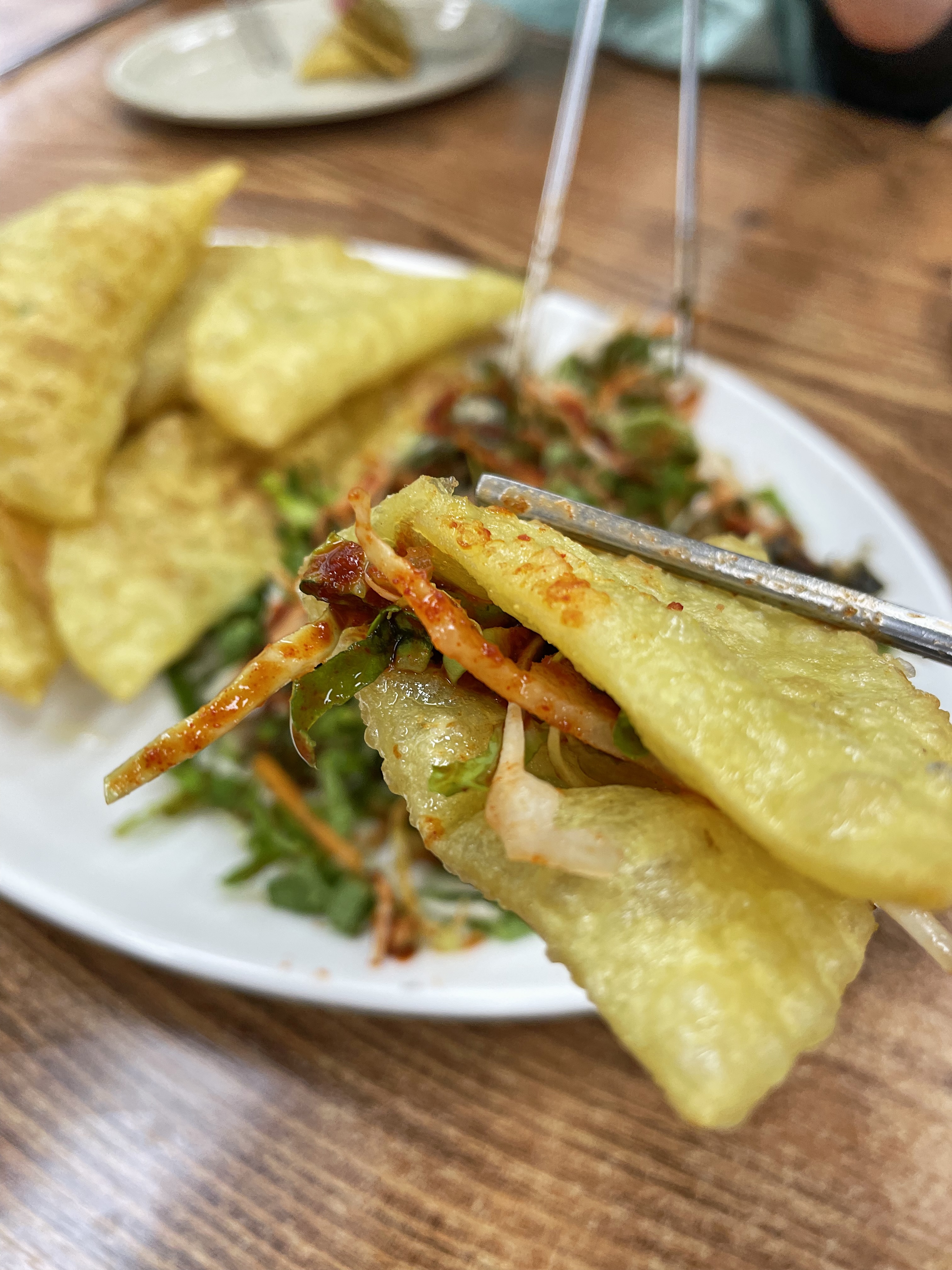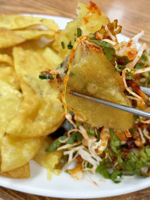 갓 튀겨낸 바삭한 만두피 위에 매콤새콤한 소스로 비빈 야채를 올려서 쌈싸 먹으니 별미더라구요.