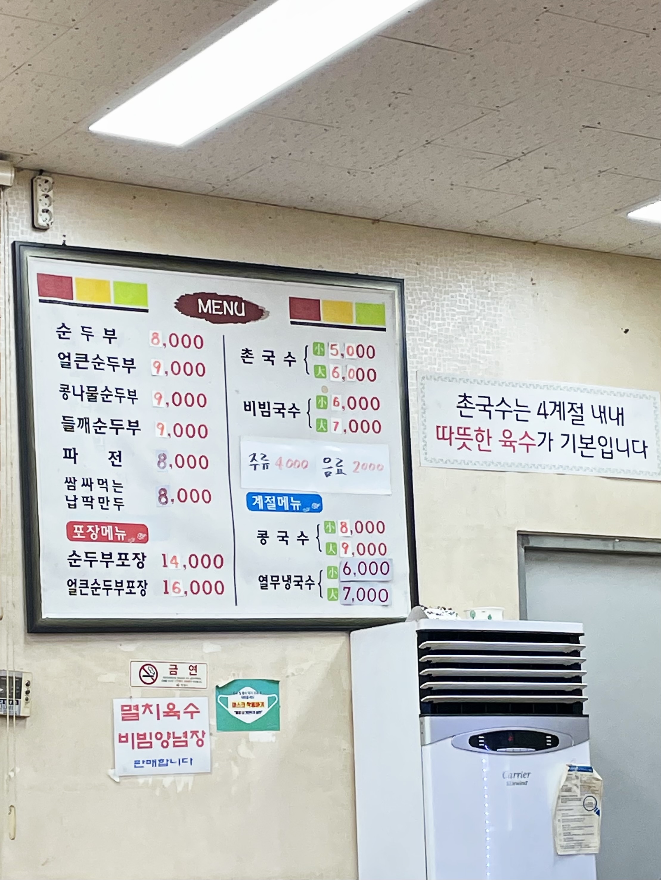 메뉴는 순두부 4종류(맑은,얼큰,콩나물,들깨) 와 국수 2종류(촌국수, 비빔국수),