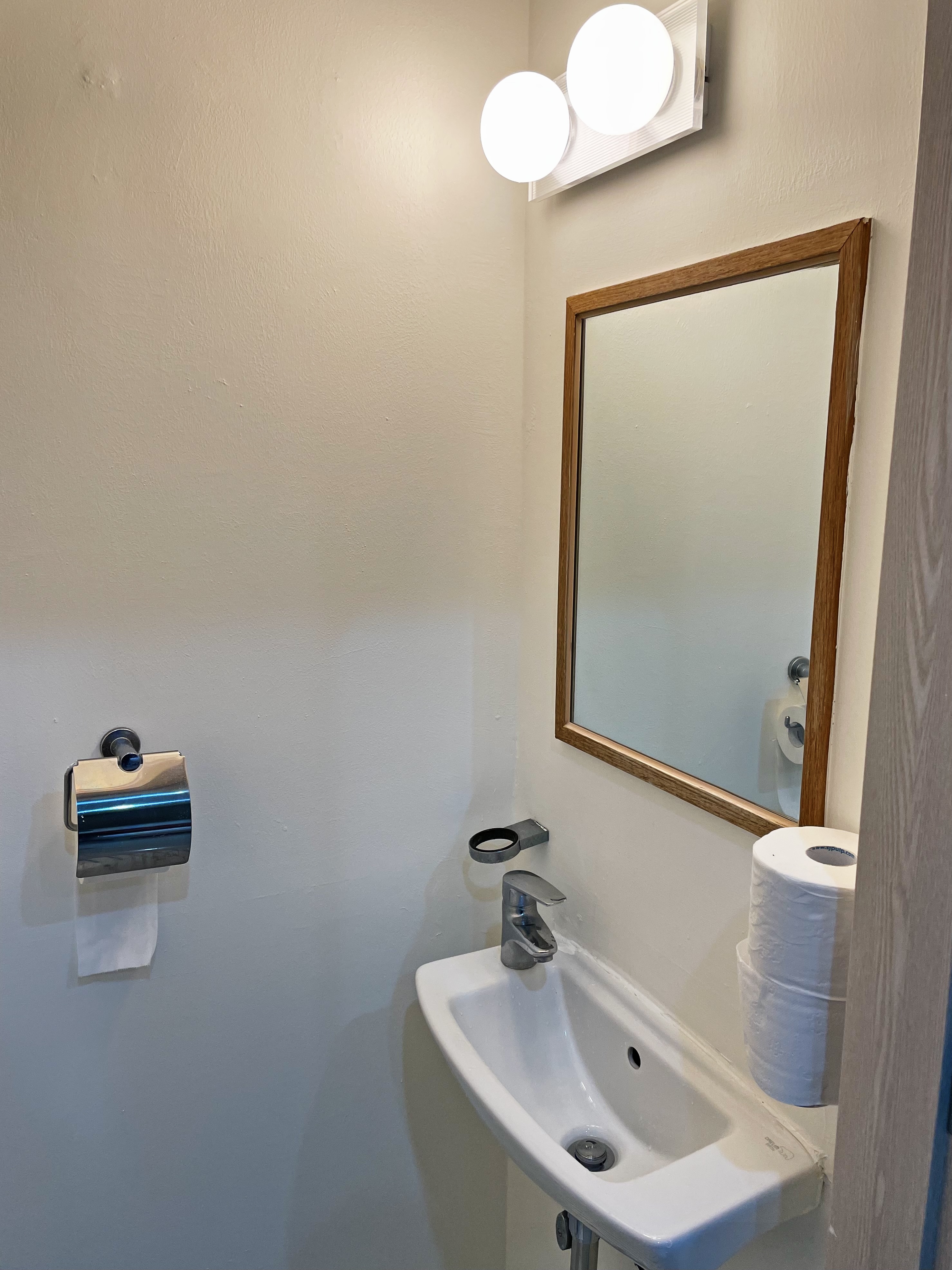 공간이 좁아 작은 세면대와 변기만 놓여 있었는데, 조명을 보니 왠지 셀카를 찍어야 할 것 같았습니다.