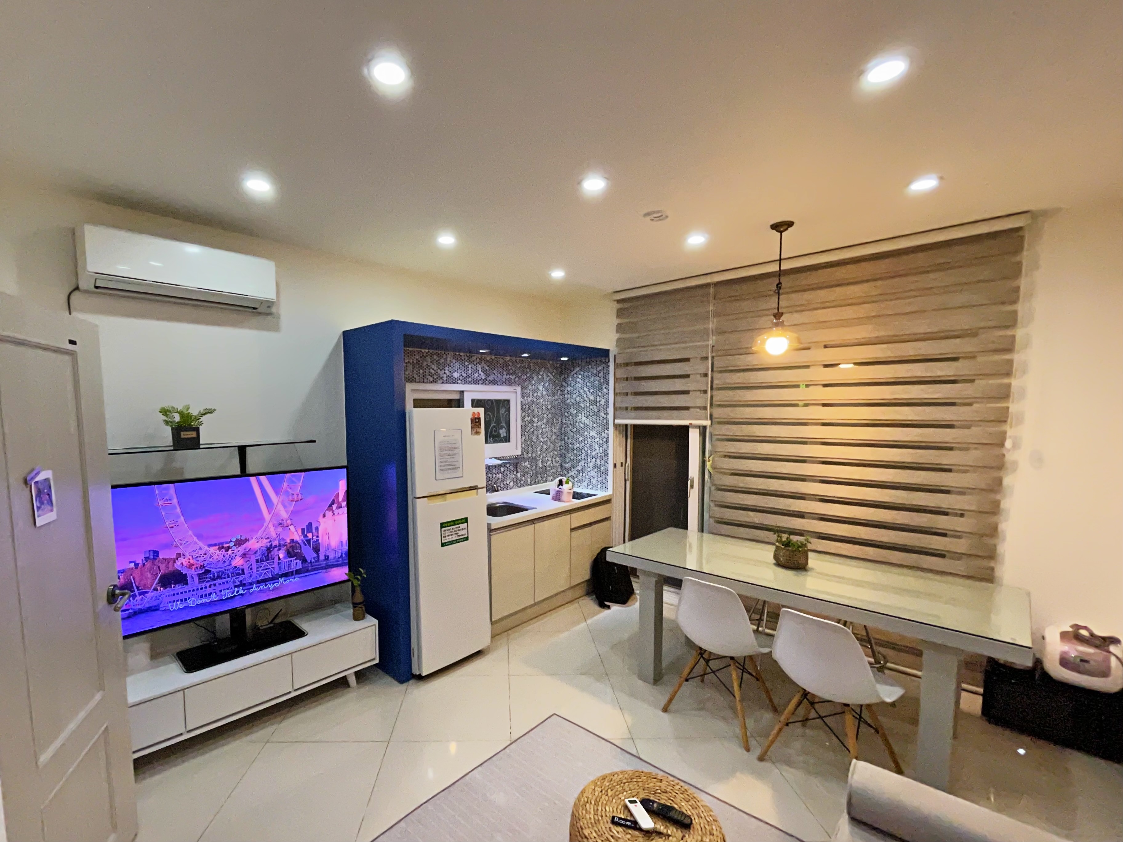 거실에는 커다란 티비와 냉장고, 식탁과 쇼파, 싱크대가 있구요.