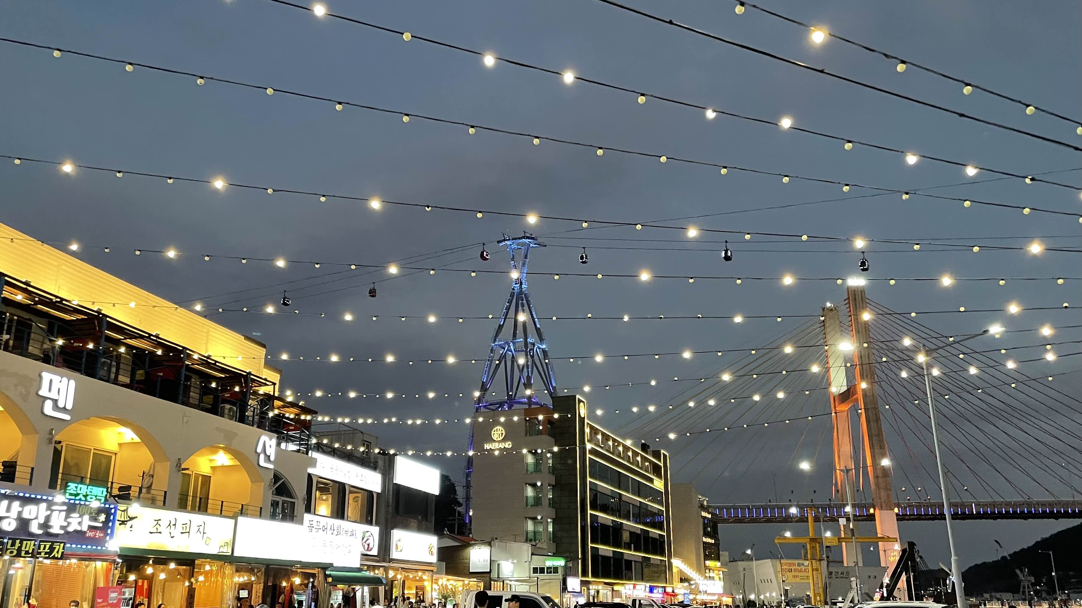 거리 위로 반짝이는 조명이 아름답습니다.