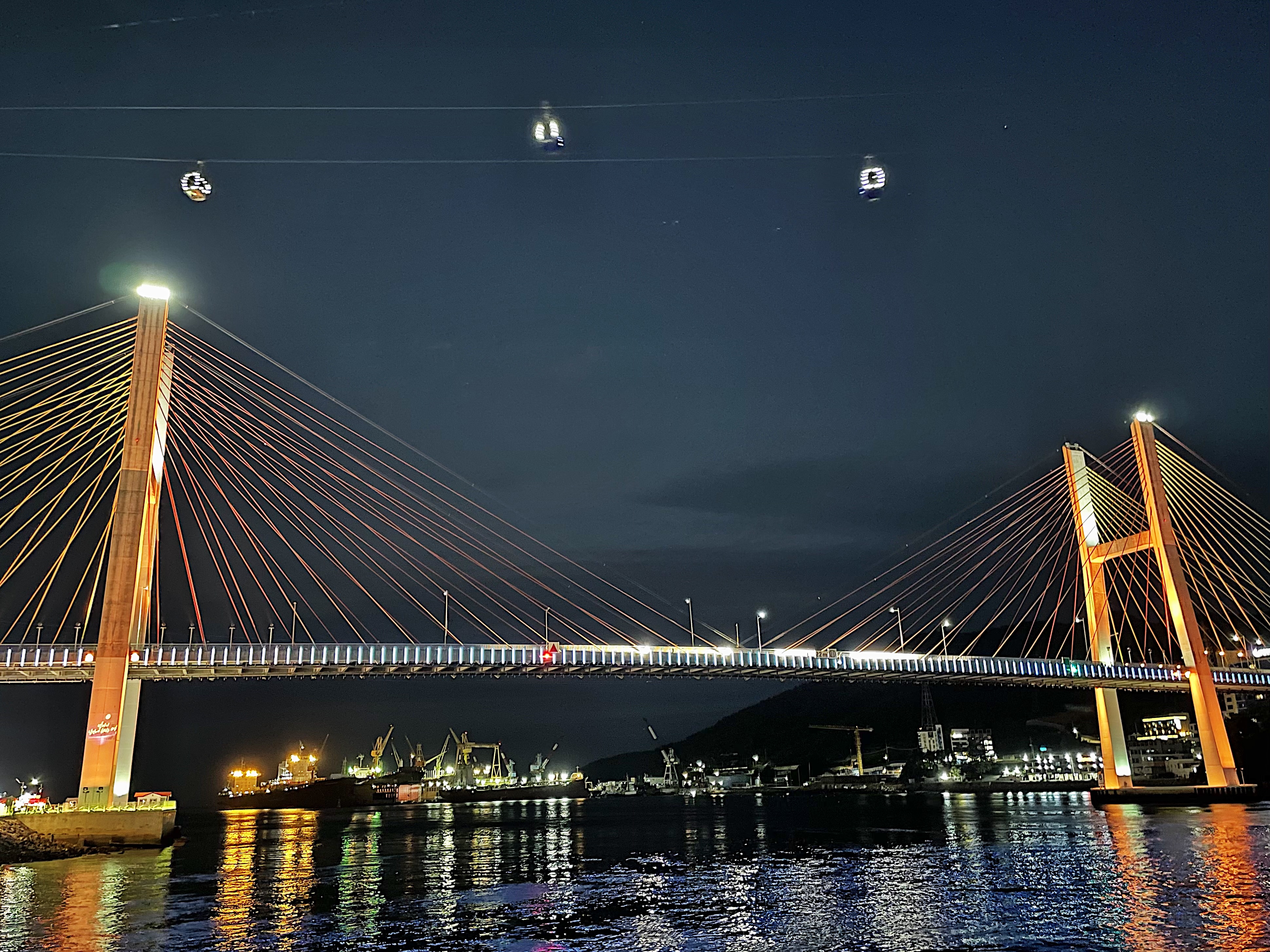 거북선 대교의 주탑과 해상 케이블카의 탑은 대조적으로 붉은색과 푸른색으로 조명이 비추고 있습니다.