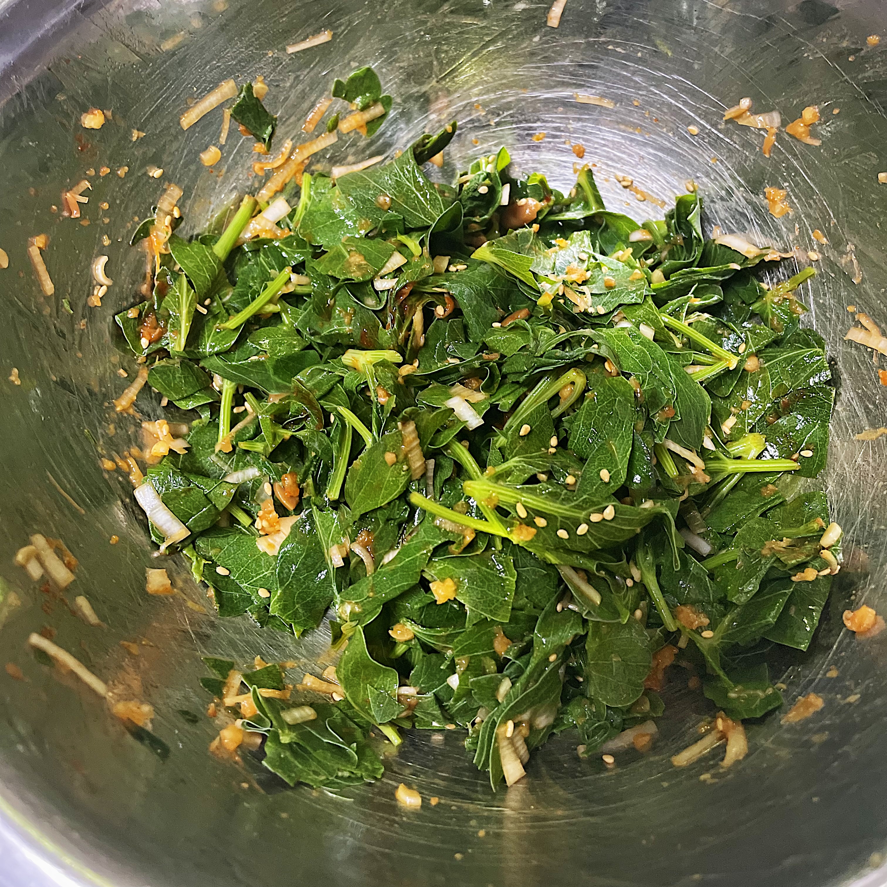 스뎅볼에 넣고, 준비한 양념인 다진 대파((1T), 다진 마늘(1/2T), 된장(2/3T), 고추장(1/3T), 매실엑기스(1T), 참기름(1T), 통깨(1T) 를 넣고 조물조물 무쳐줍니다.