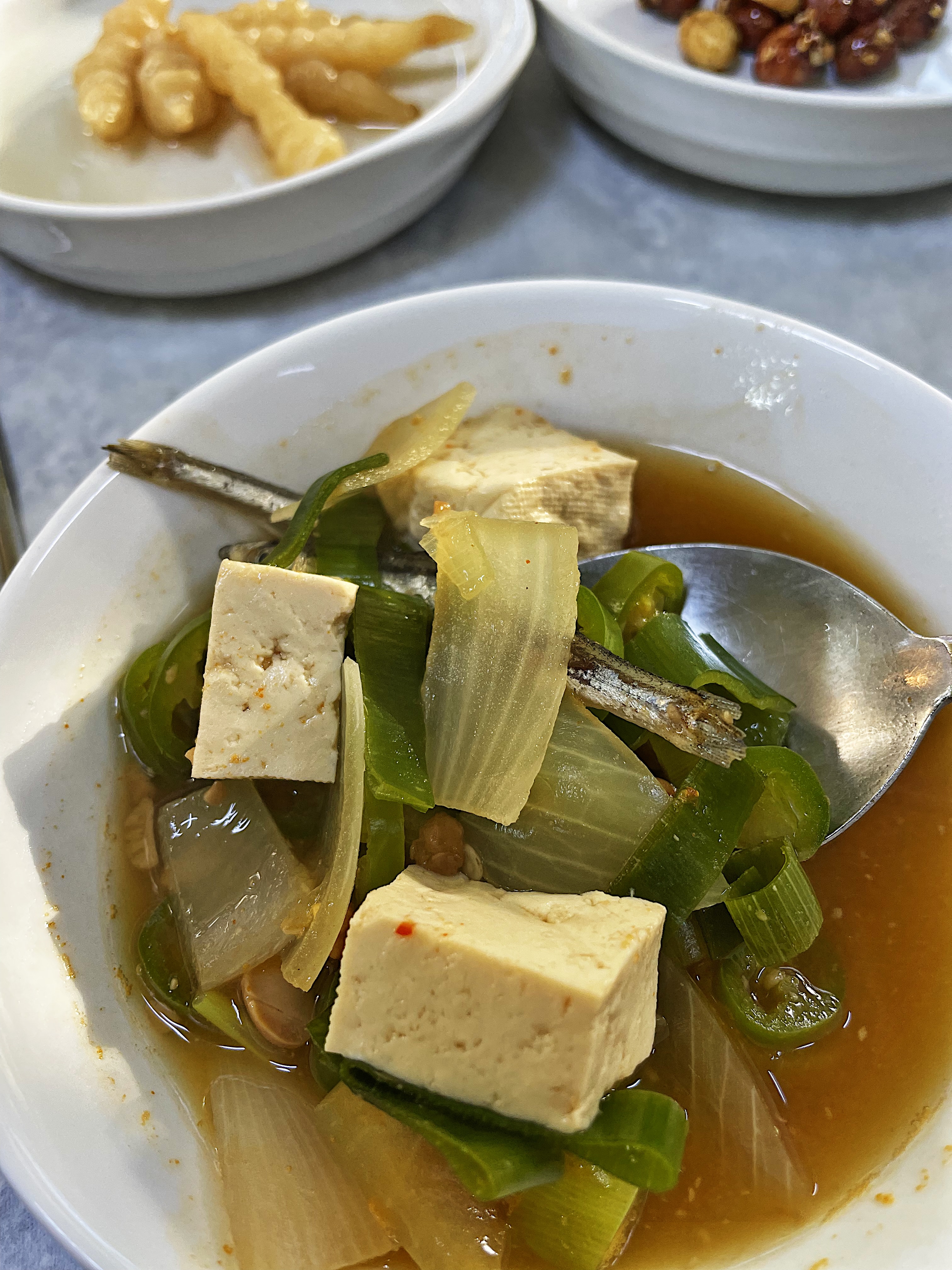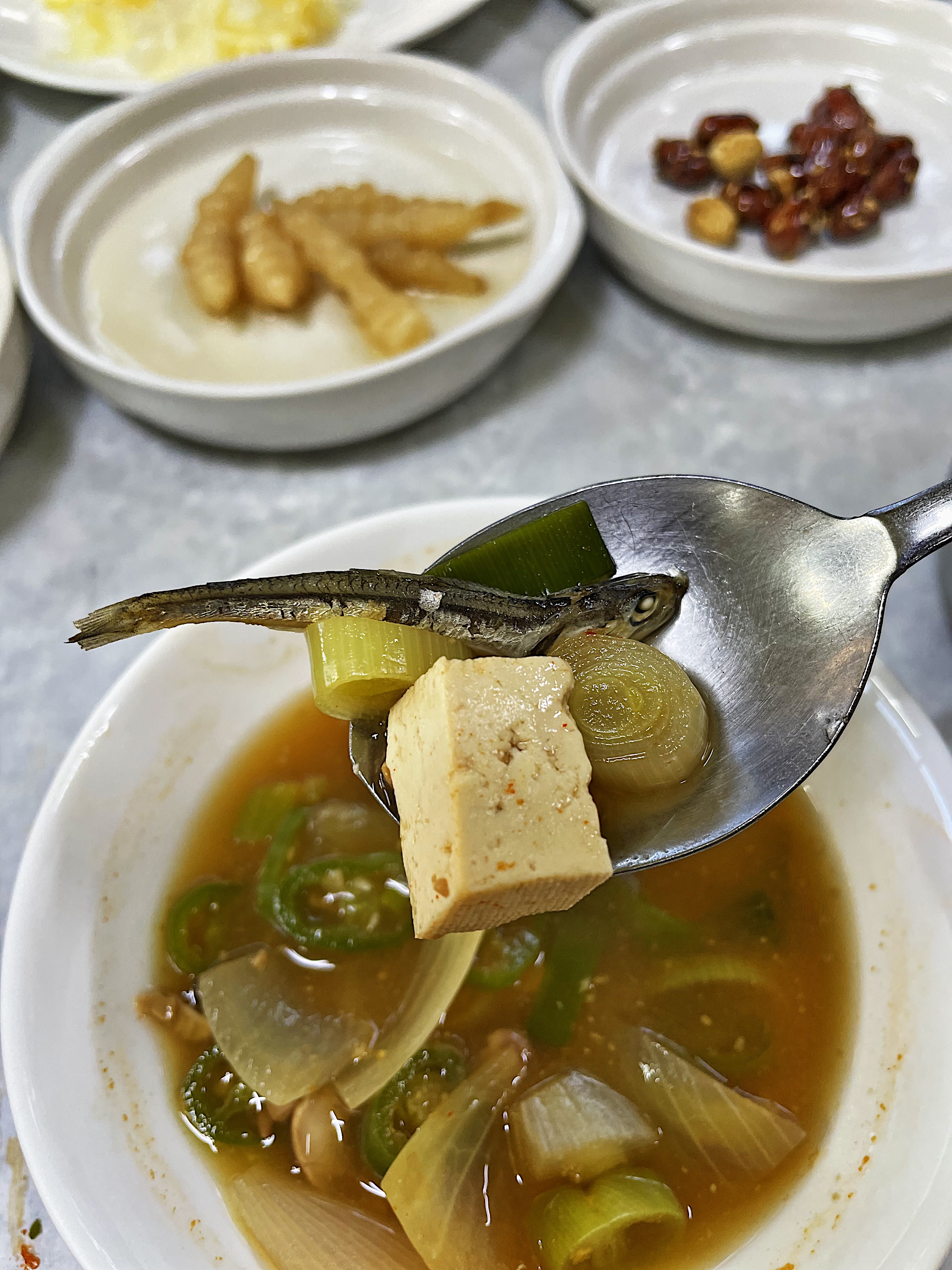 집된장을 사용한 것 같고, 통 멸치가 몇 마리 들어 있습니다.