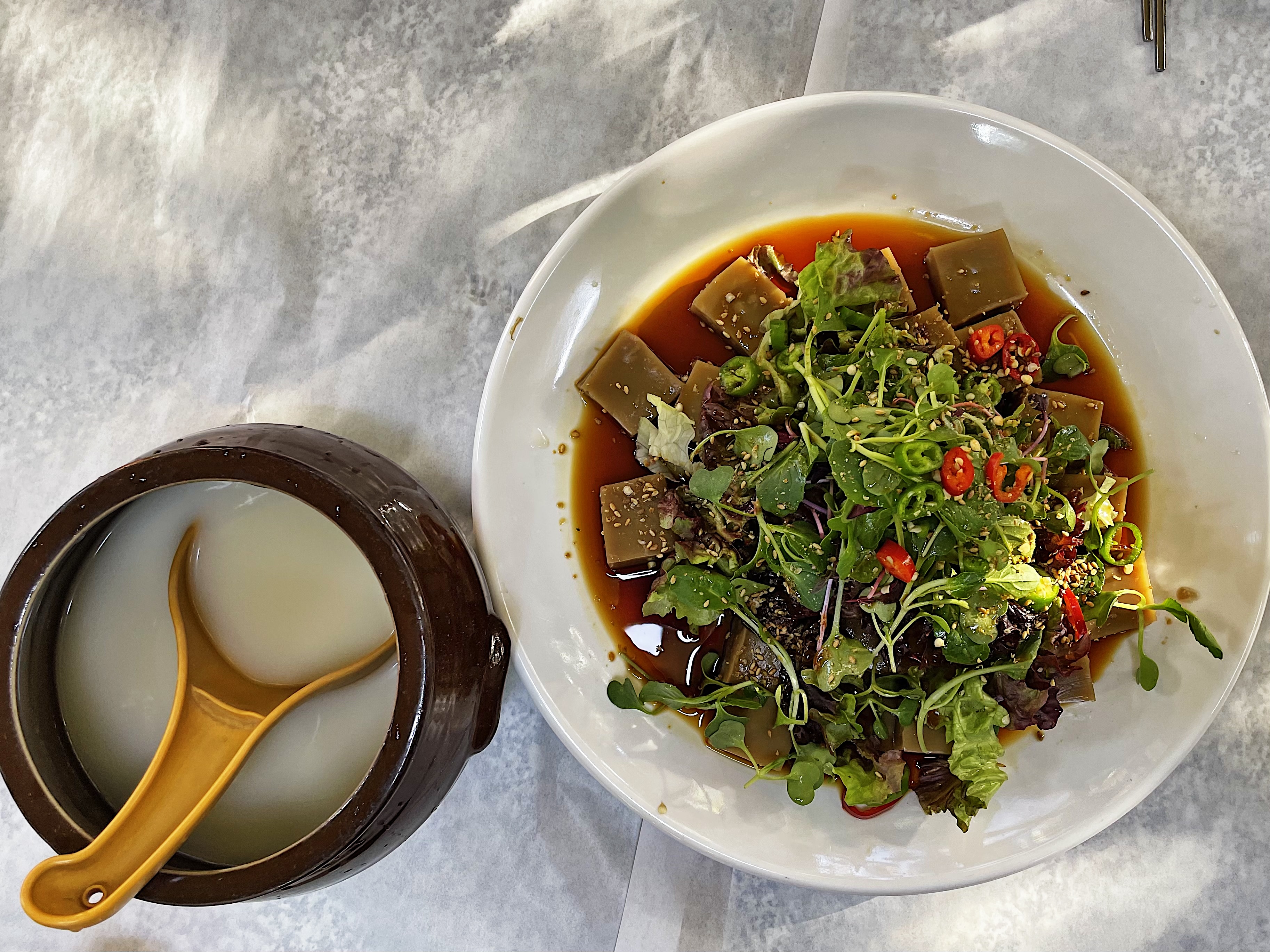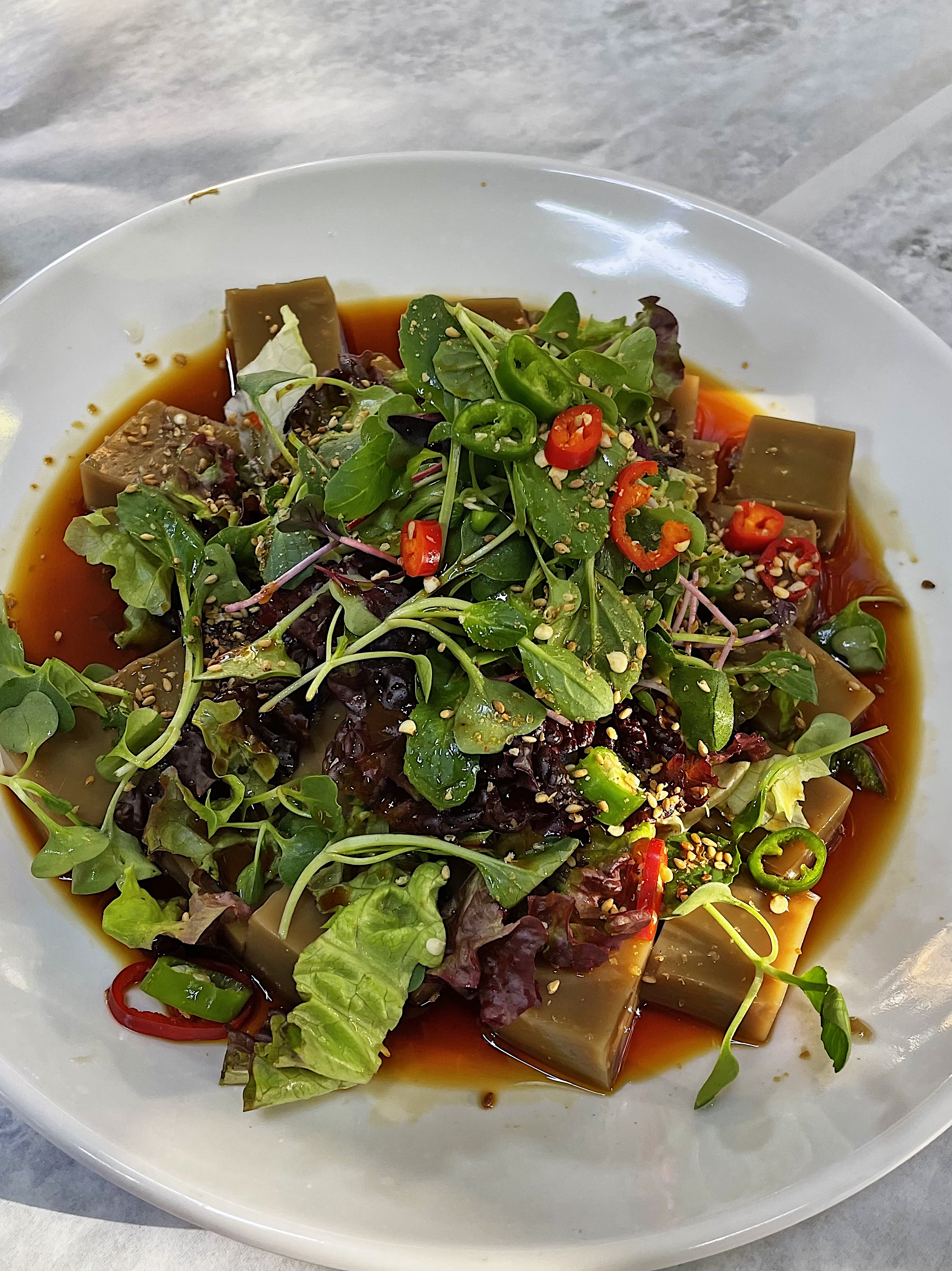 도토리묵에는 다양한 야채가 올라가 있어 마치 샐러드 같아요.