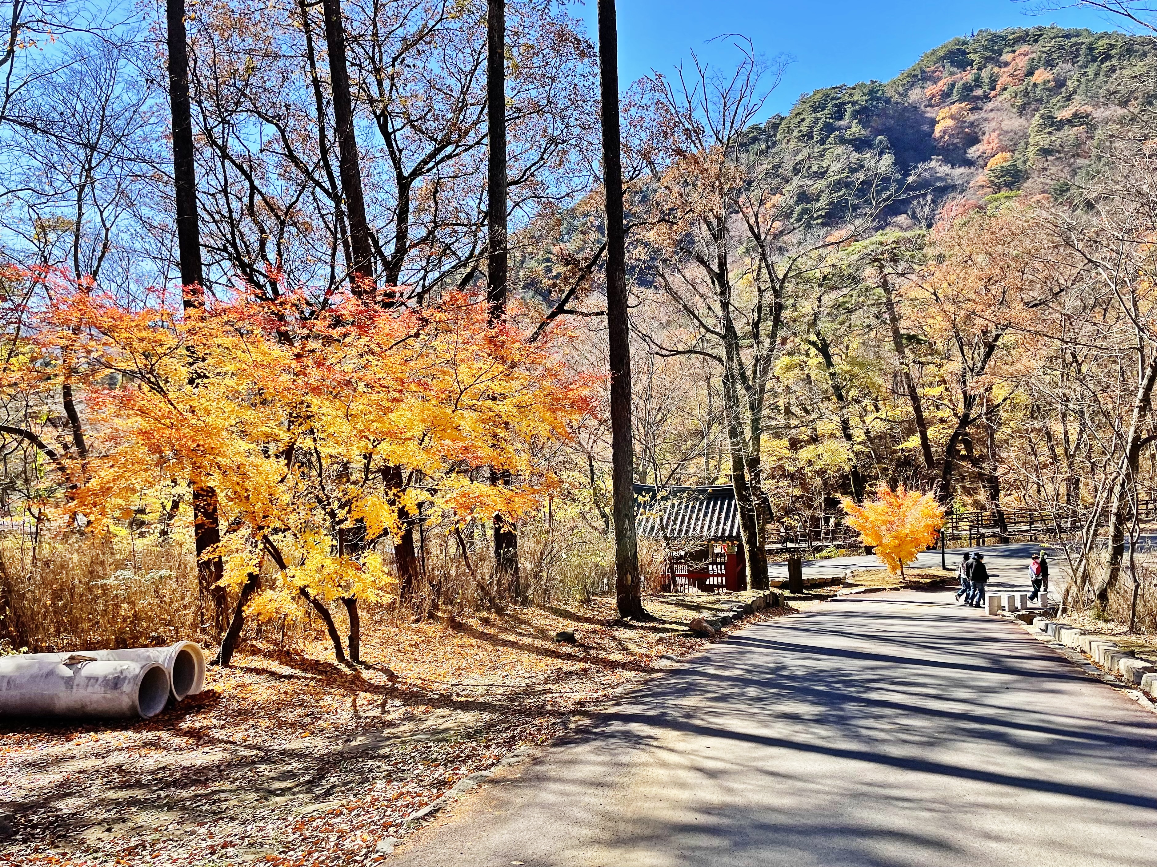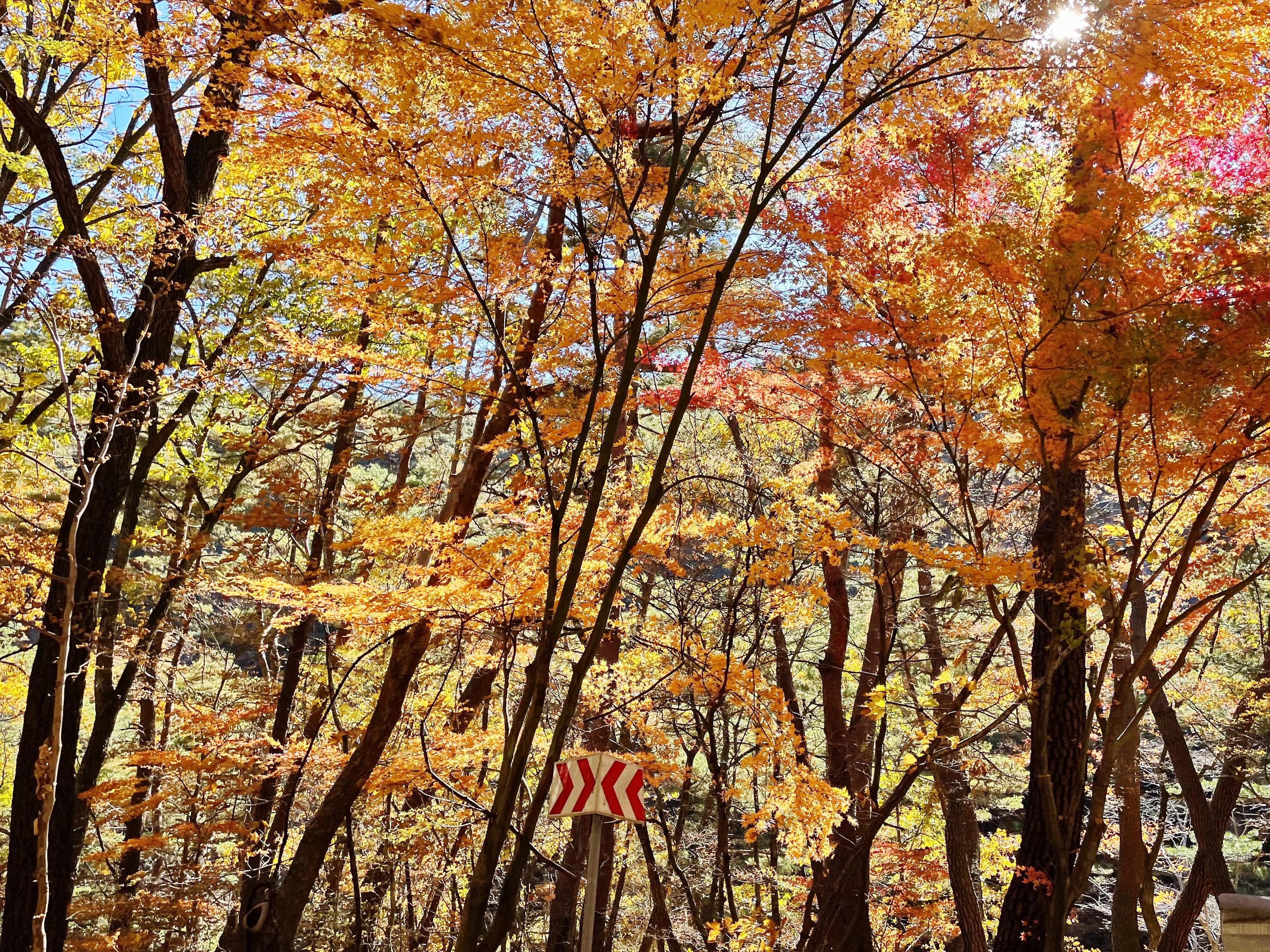 어디까지 가야 하는지 모르겠지만, 올라가는 길가에 나뭇잎들이 알록달록 햇빛을 받아 너무 예쁘게 보입니다.
