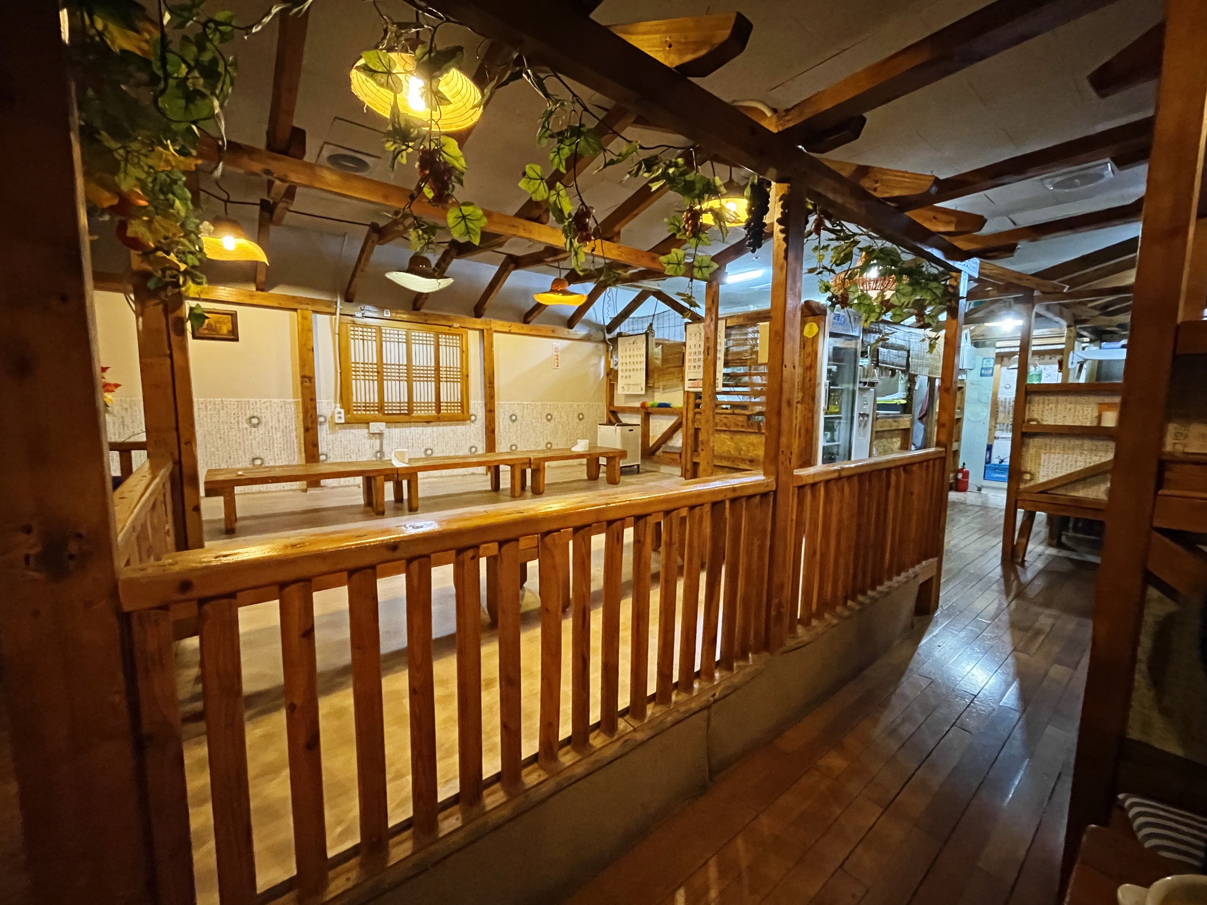 장사를 하는지 빼꼼 고개를 내밀어 안을 들여다보니 옛날 교실 같은 바닥에 가운데에는 평상 위 좌식 테이블 공간을 기준으로 가장자리에는 'ㄱ' 자 모양으로 창가에 테이블이 약 7개 정도 놓여 있습니다.
