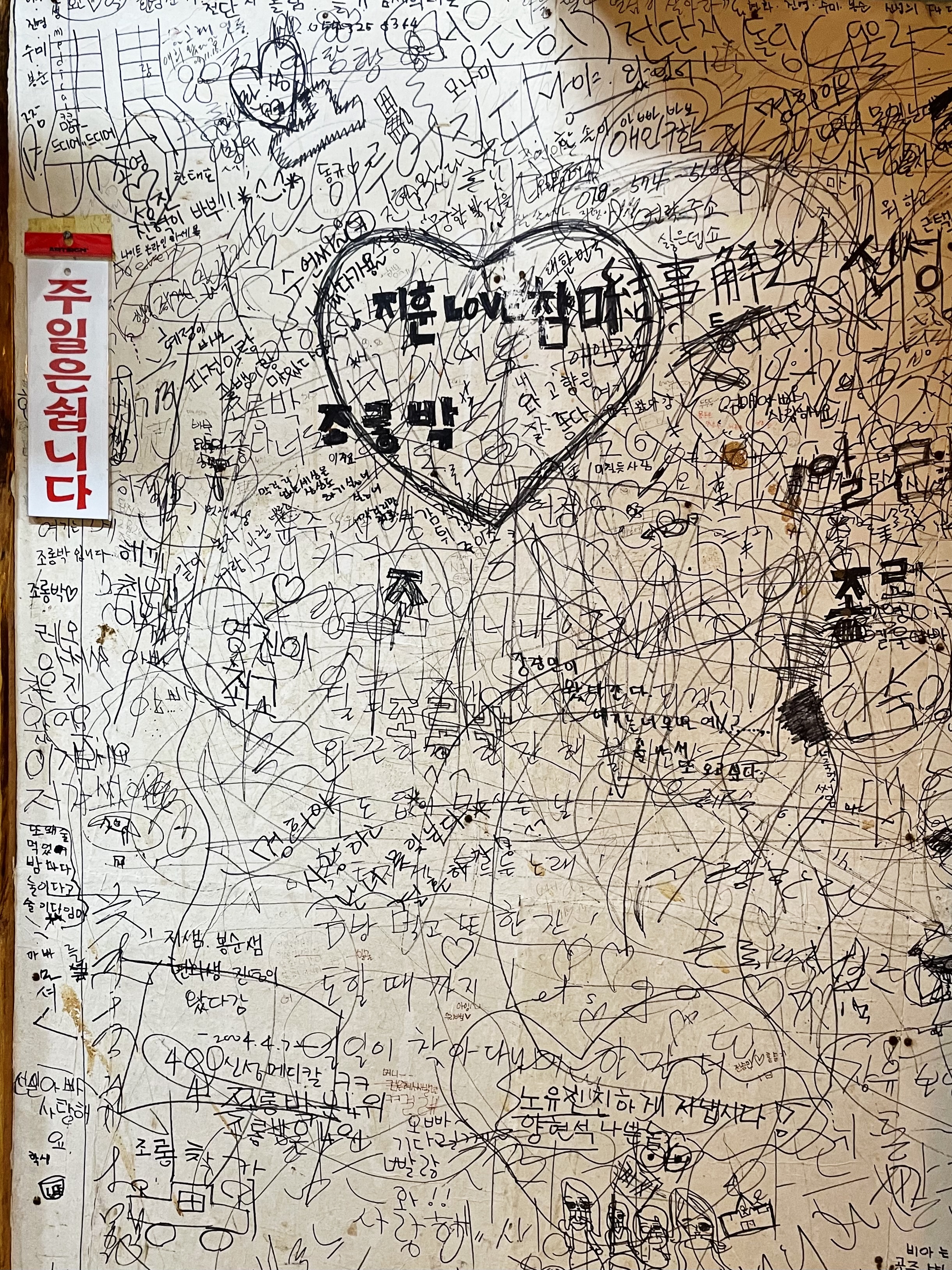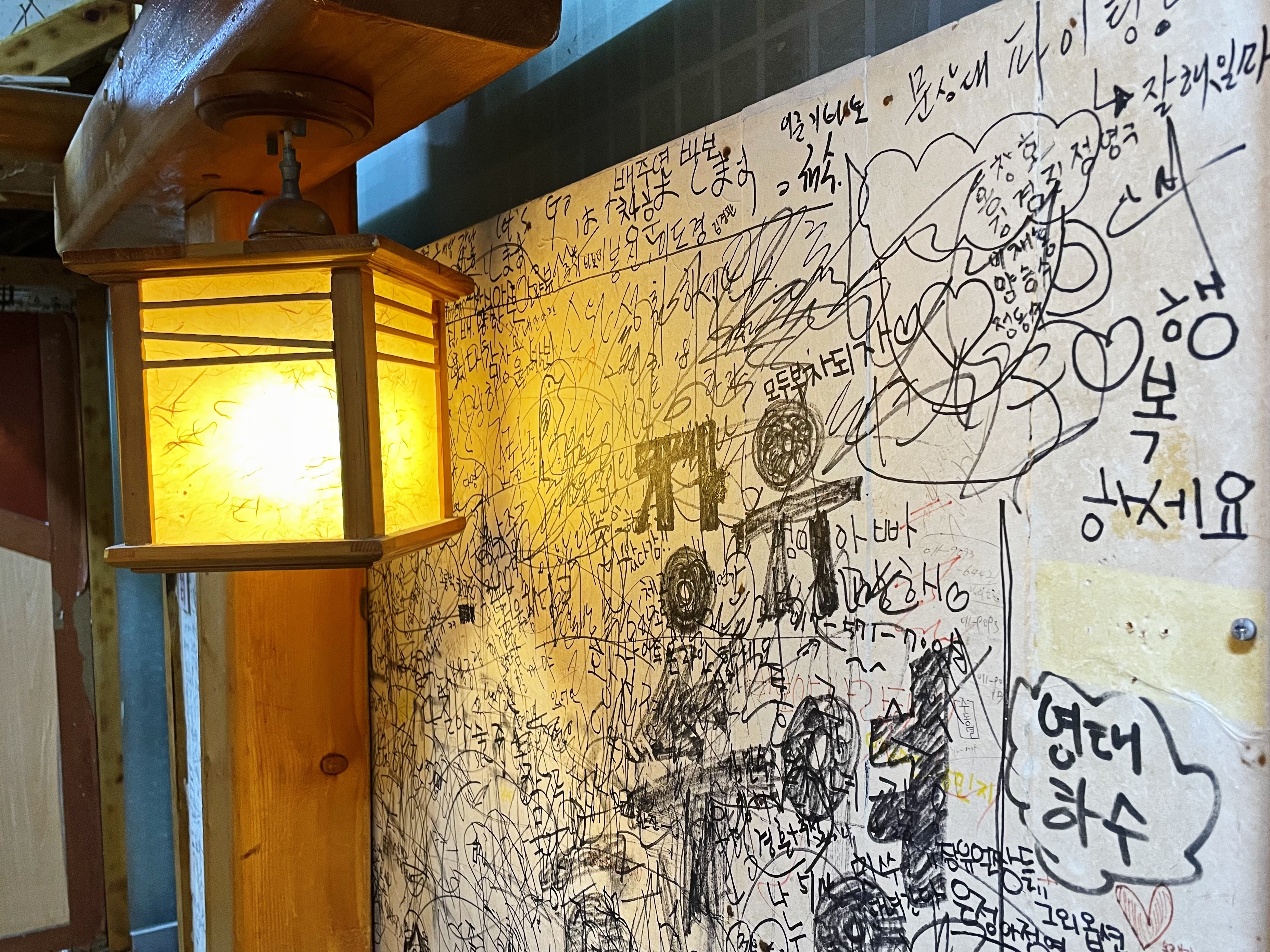 가게 입구의 양쪽 벽에 가득한 낙서가 세월의 흔적을 가늠케 합니다.