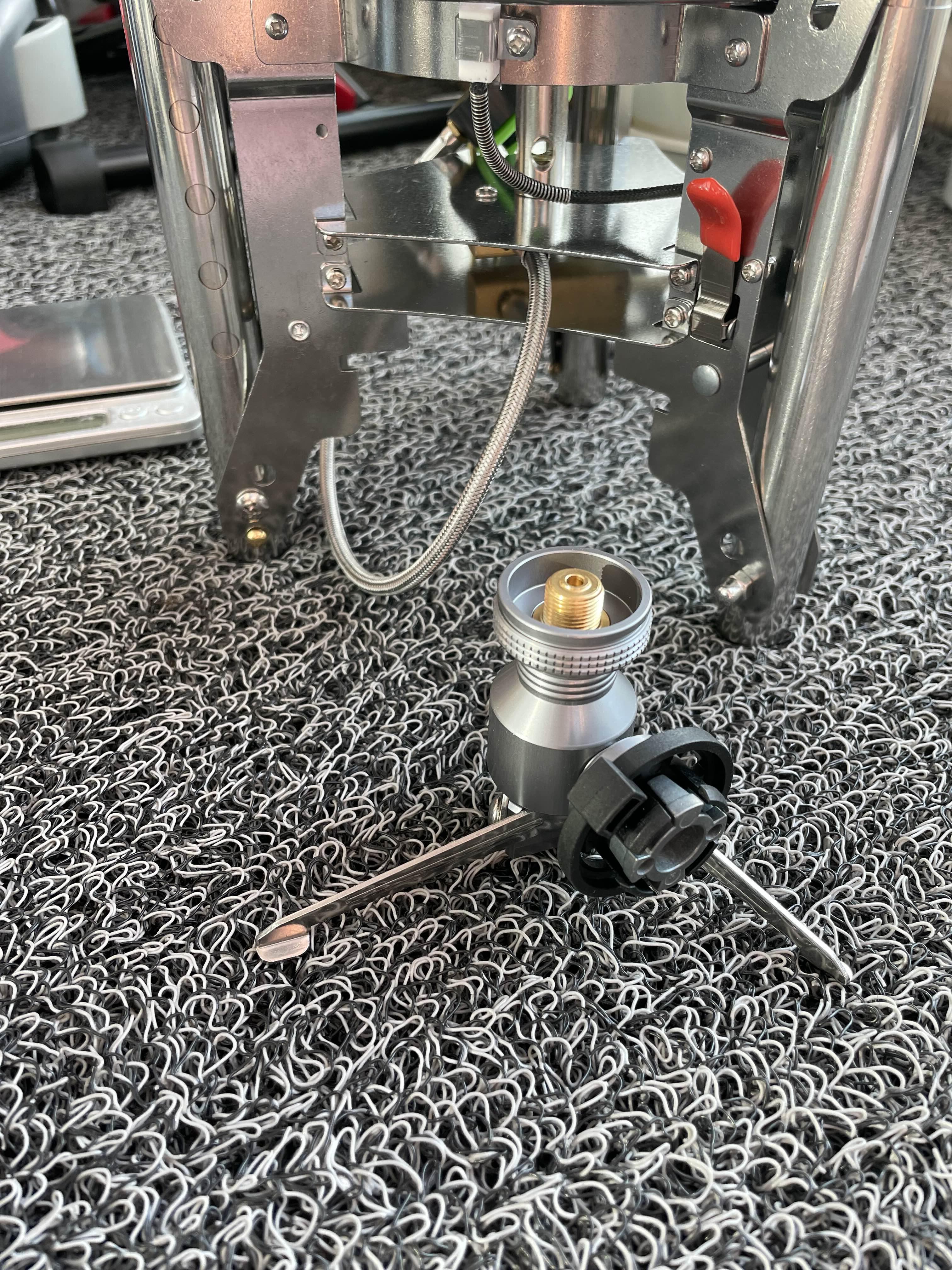 만약 옆으로 눕혀서 측면으로 호스를 연결하는 방식의 어댑터를 사용한다면 가스조절밸브를 돌리기 불편할 수 있습니다.