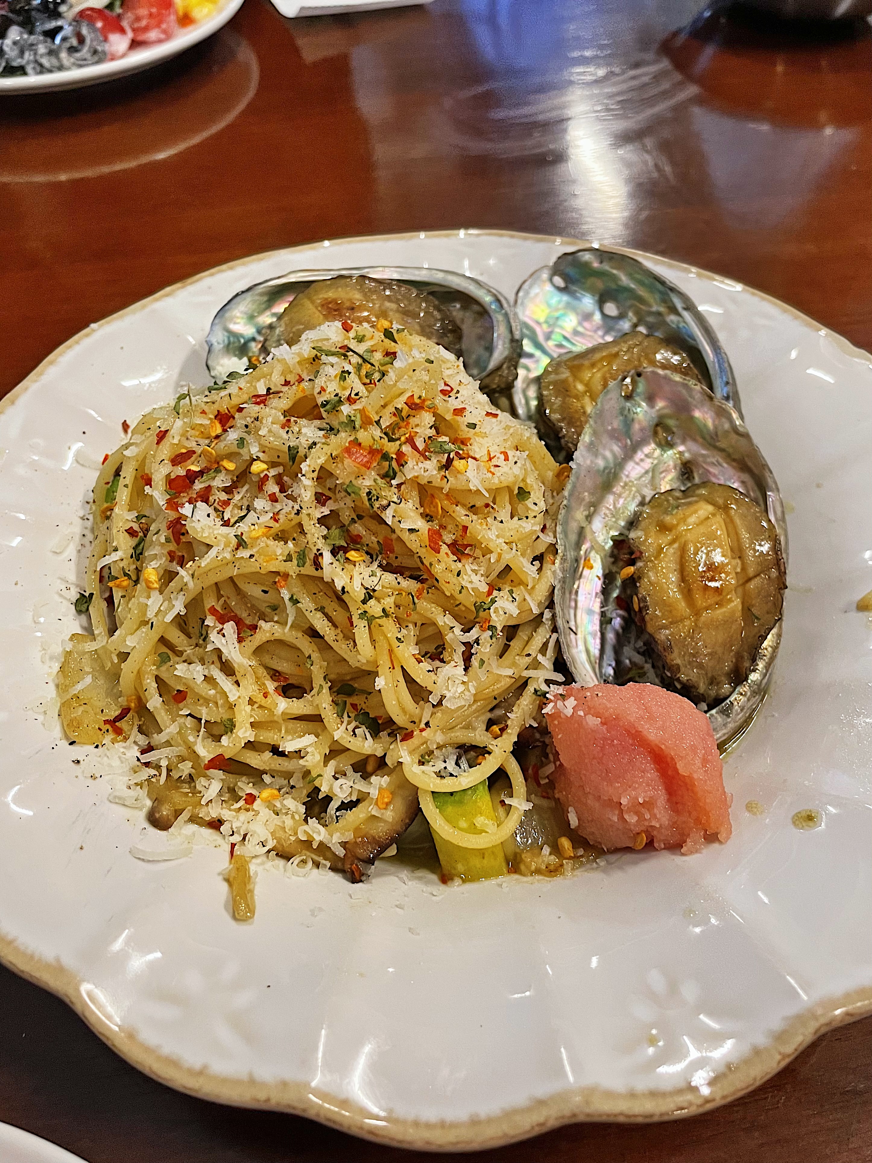 전복내장소스에 명란을 곁들인 오일 파스타인데요.