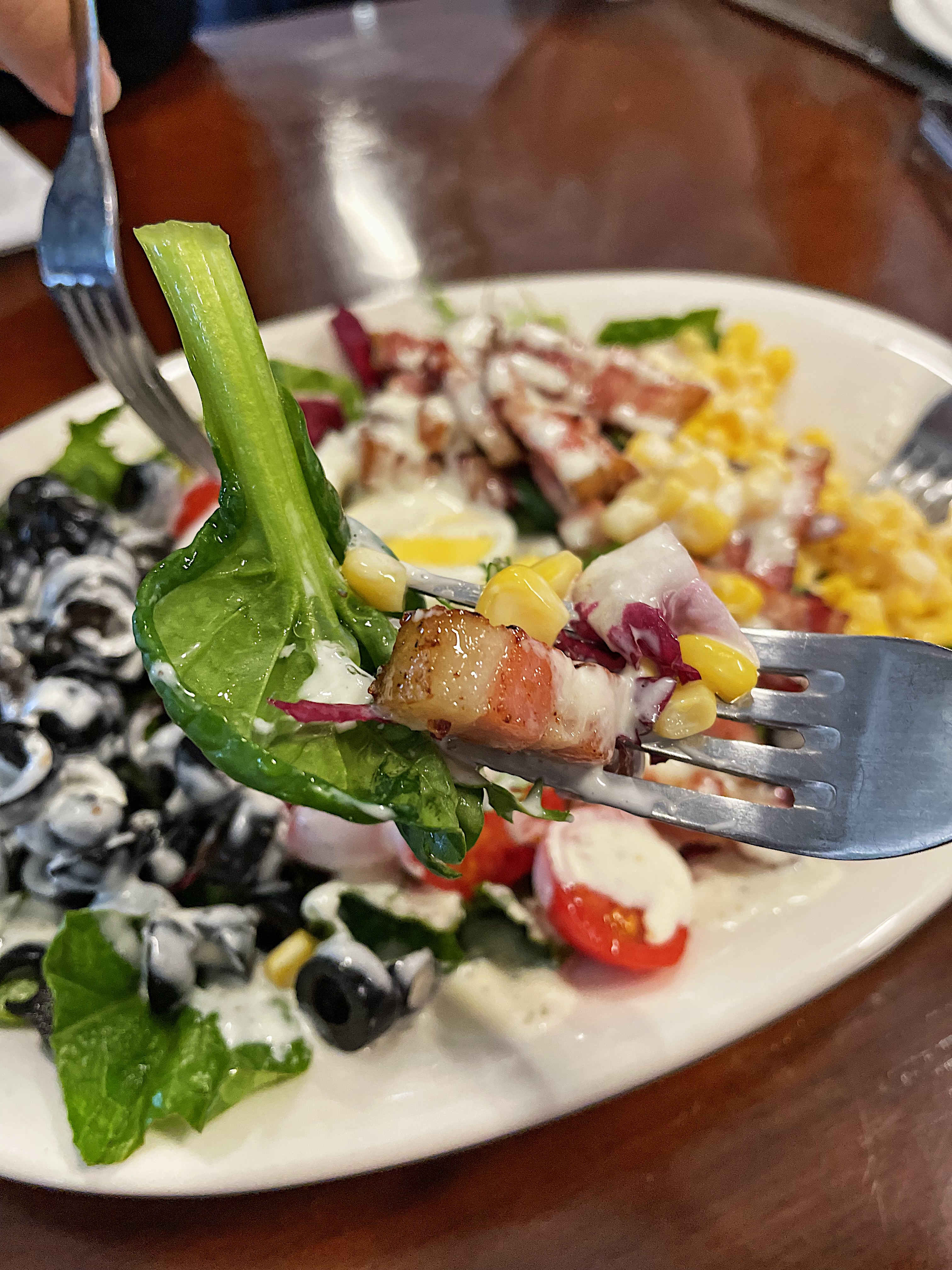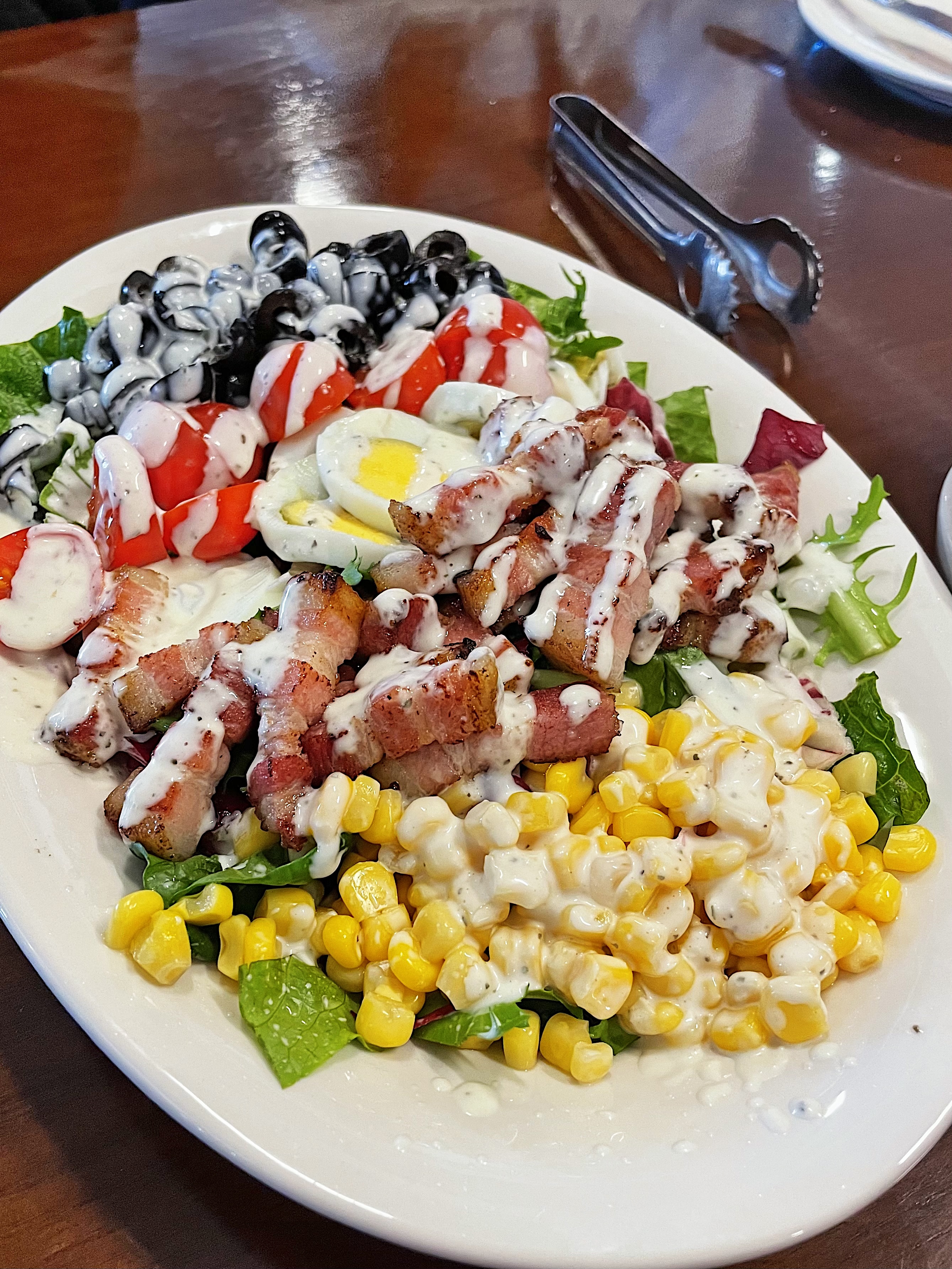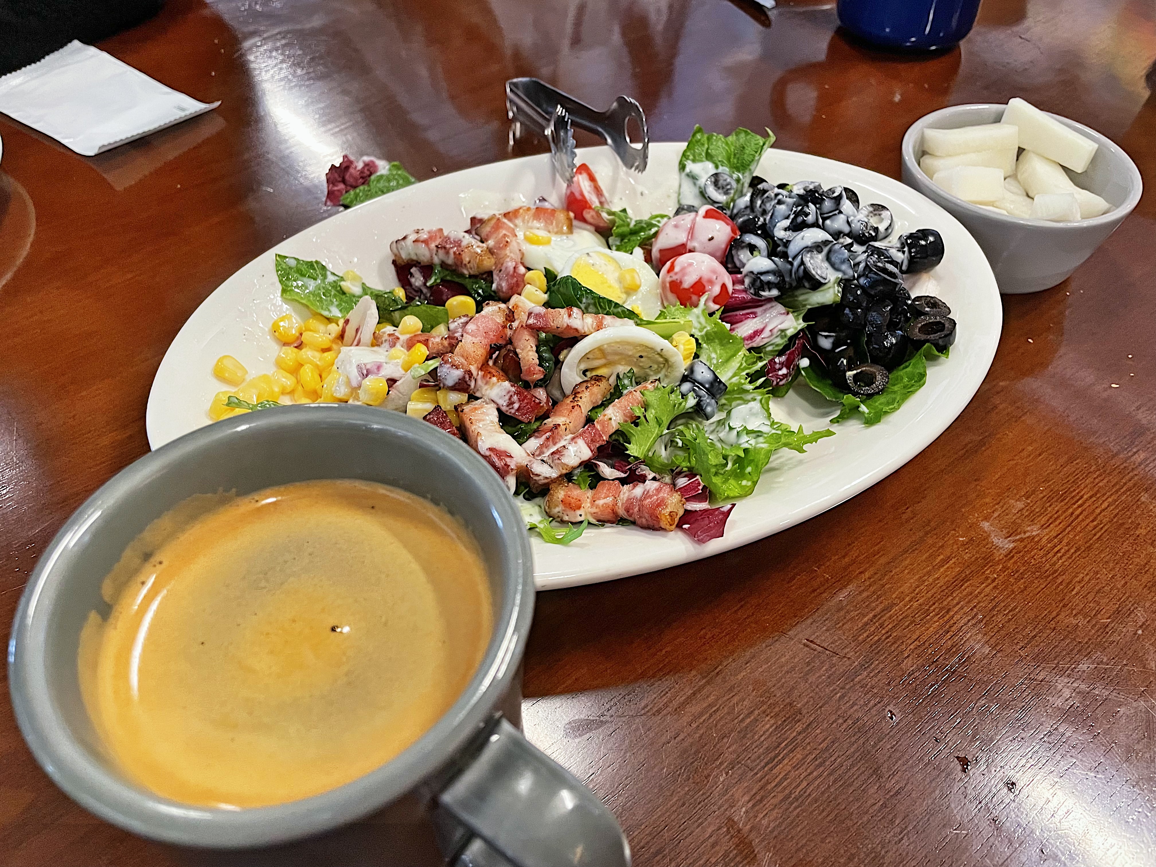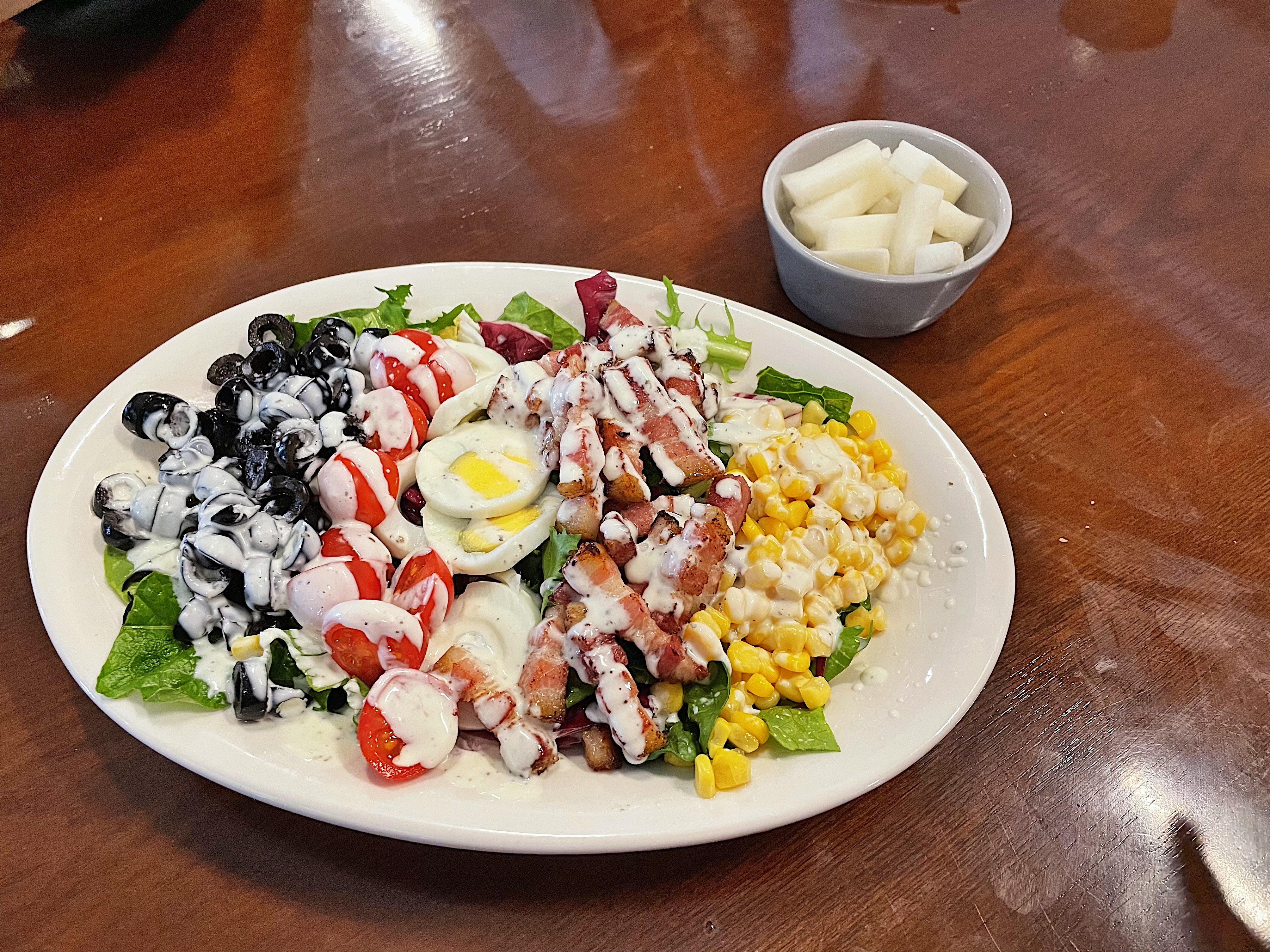 콥샐러드는 싱싱한 제철 야채 위에 올리브, 방울토마토, 삶은 계란, 스위트콘과 고기가 올라가 있는데요.