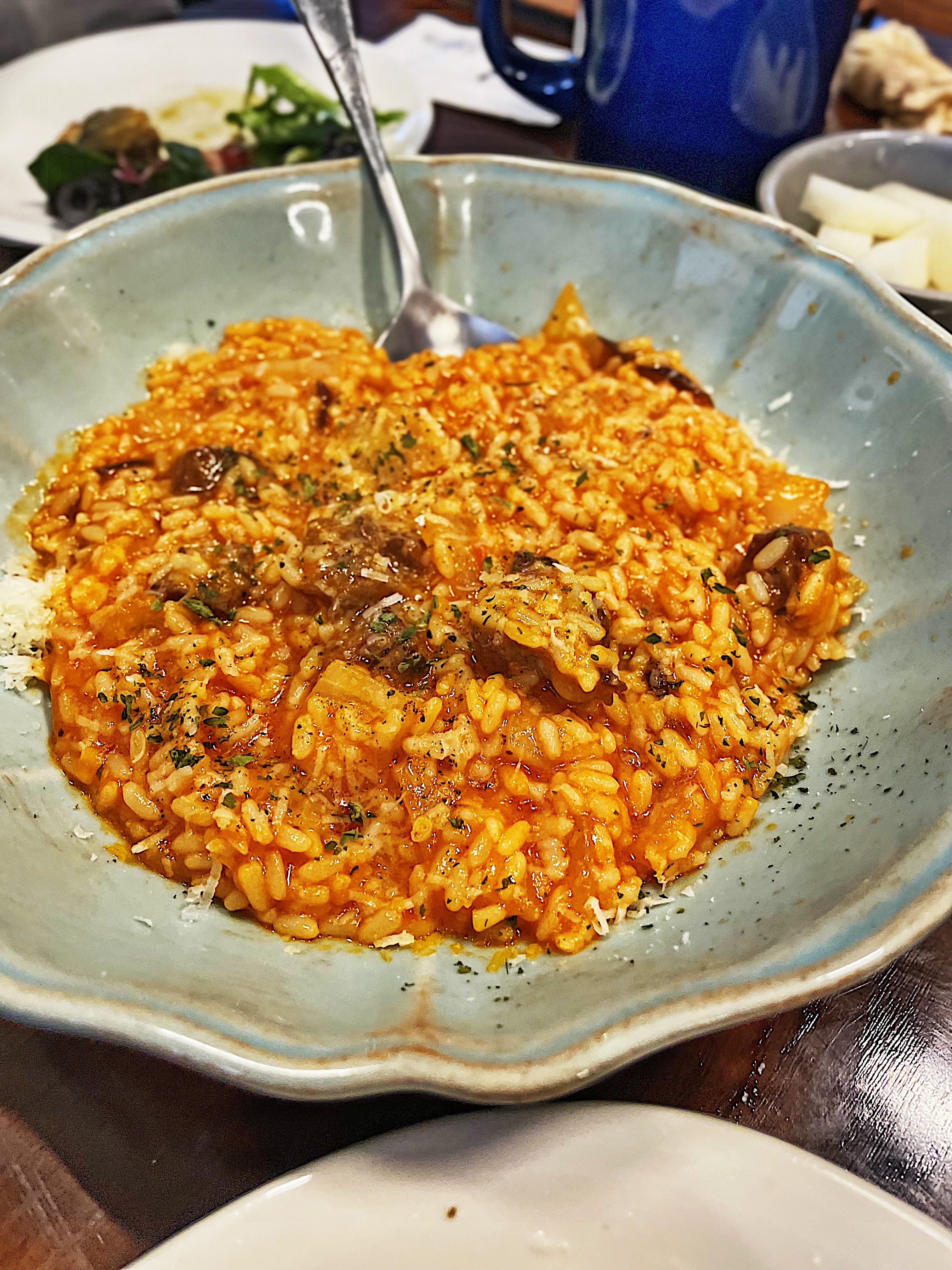 토마토소스에 소고기 살치살이 곁들여진 리조또인데요.