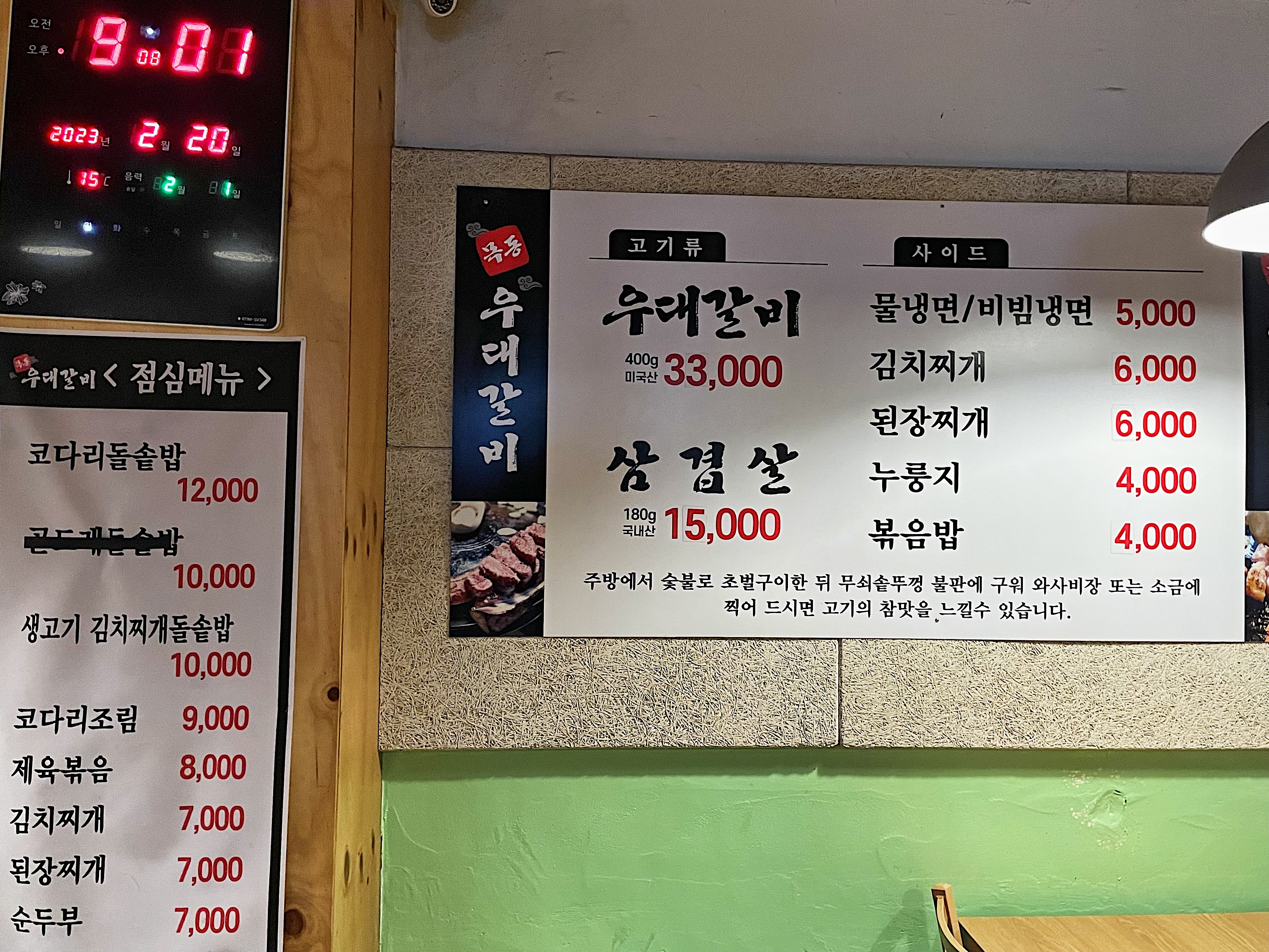 대표메뉴인 우대갈비는 미국산으로 400g에 3.3만 원이고, 삼겹살은 국산으로 180g에 1.5만 원이라고 합니다.