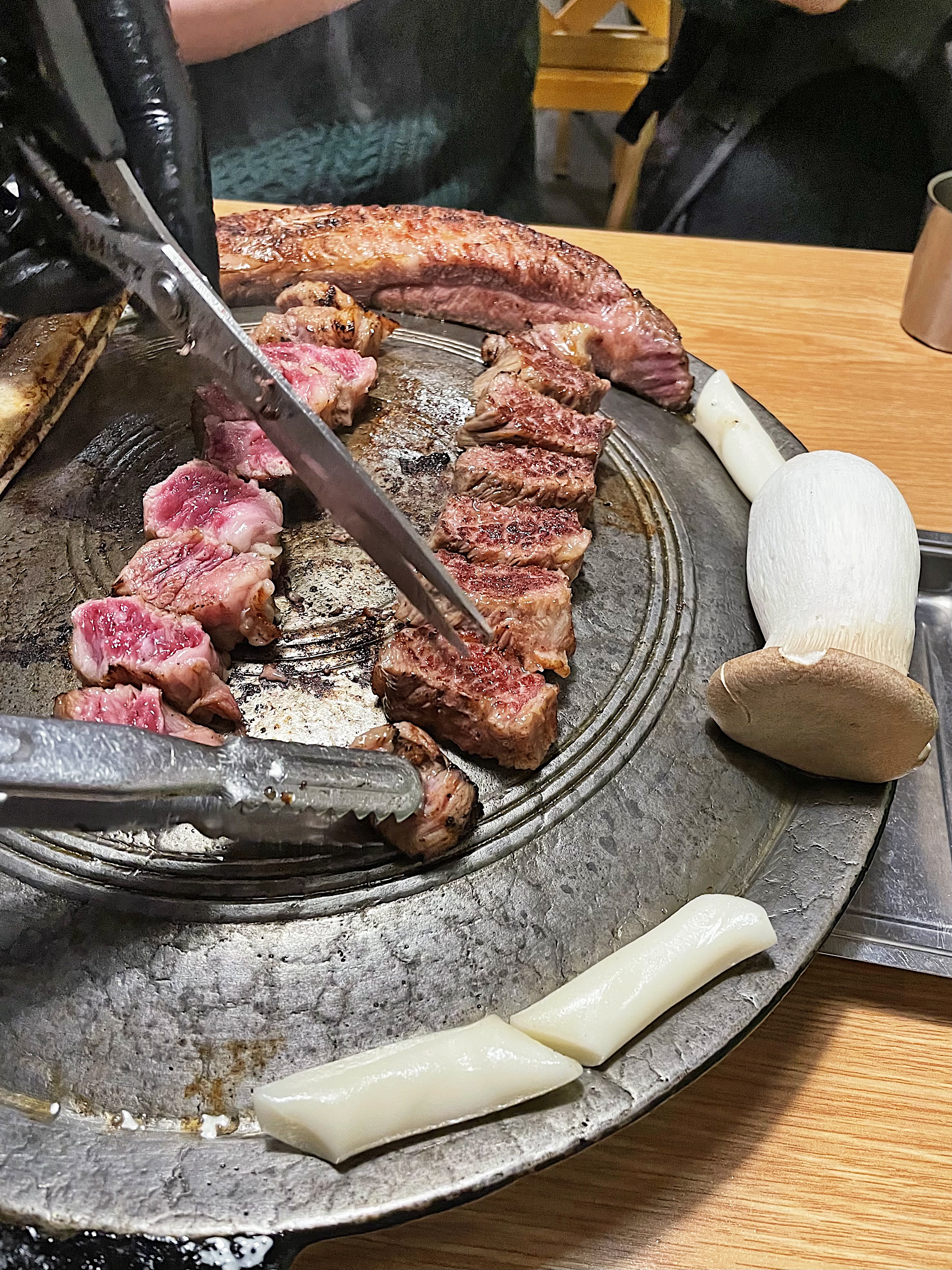 그리고 달궈진 솥뚜껑 위에서 2차로 구워주시는데요.