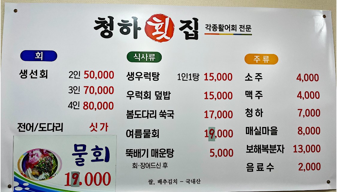 그 끝자락에 위치한 청하횟집에 방문하였습니다.