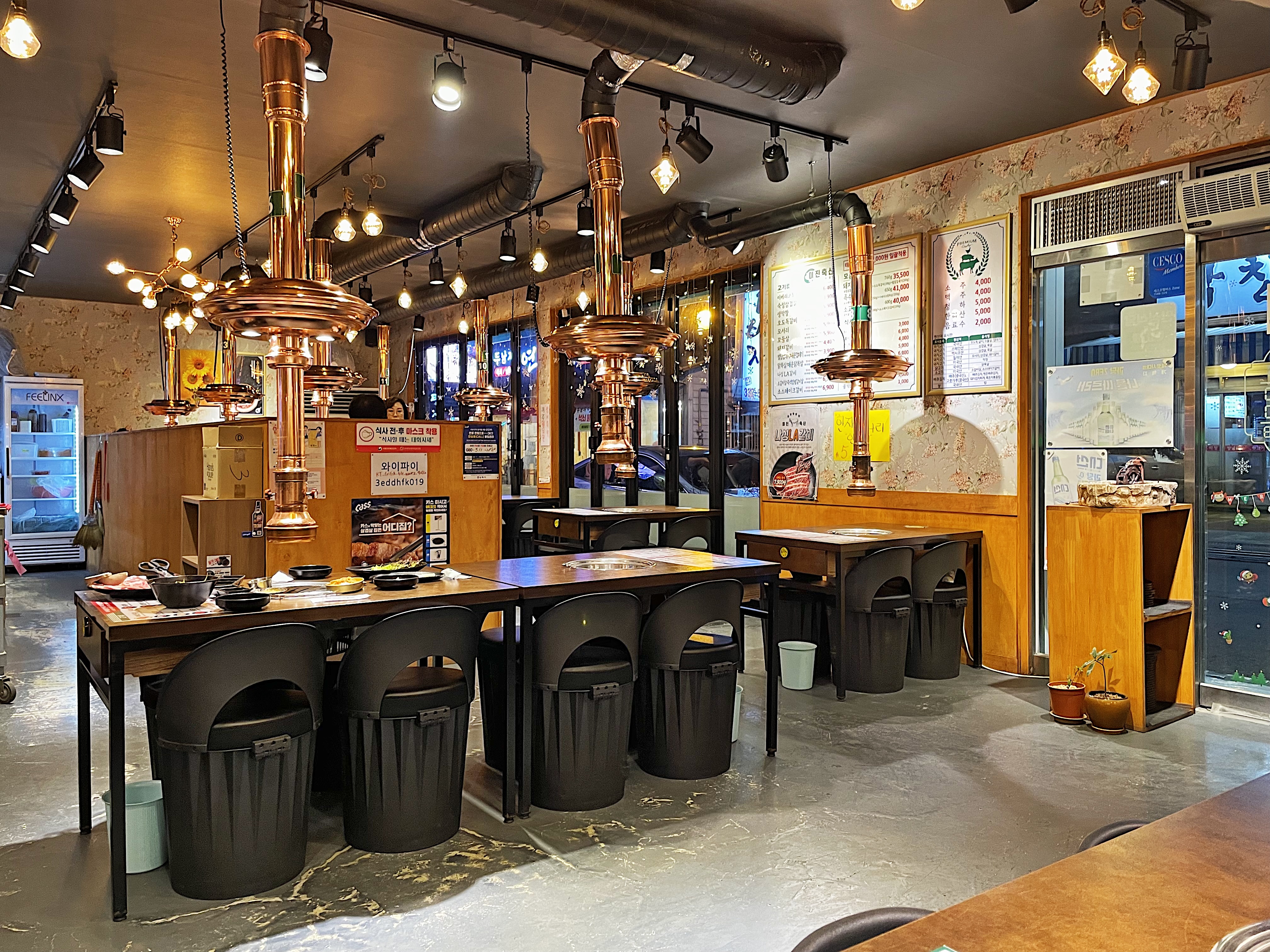 황동색의 환기 덕트와 조명으로 편안한 분위기의 공간을 연출해 놓았으며 매장은 깔끔하였습니다.