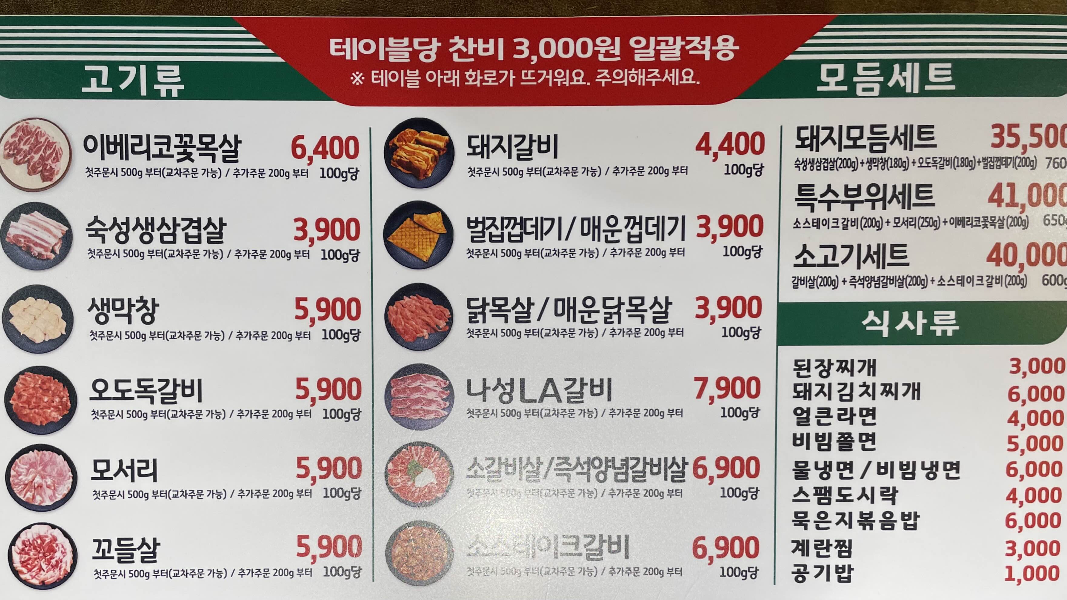 테이블당 반찬비를 3천원 받는 건 조금 불만이네요.