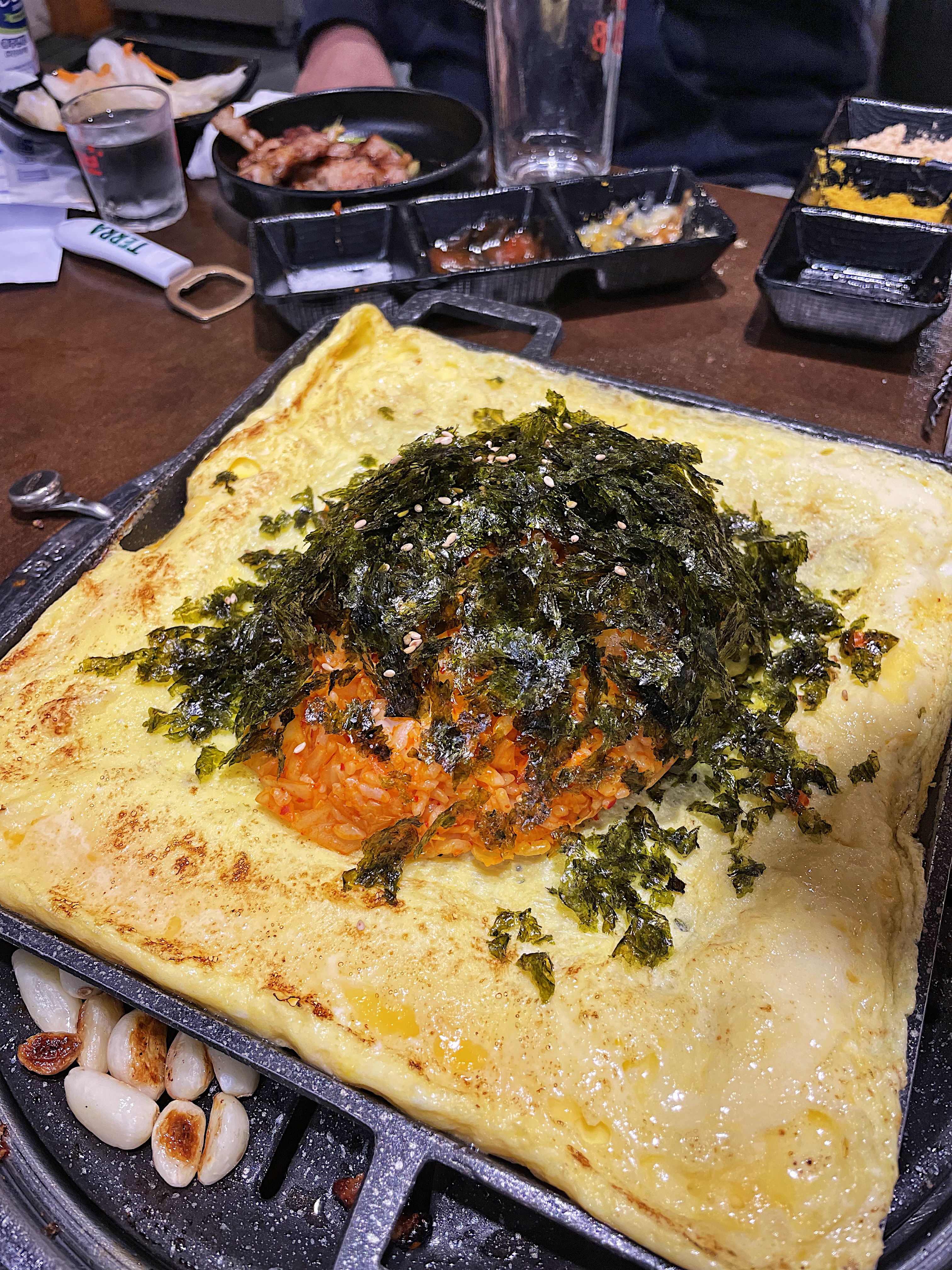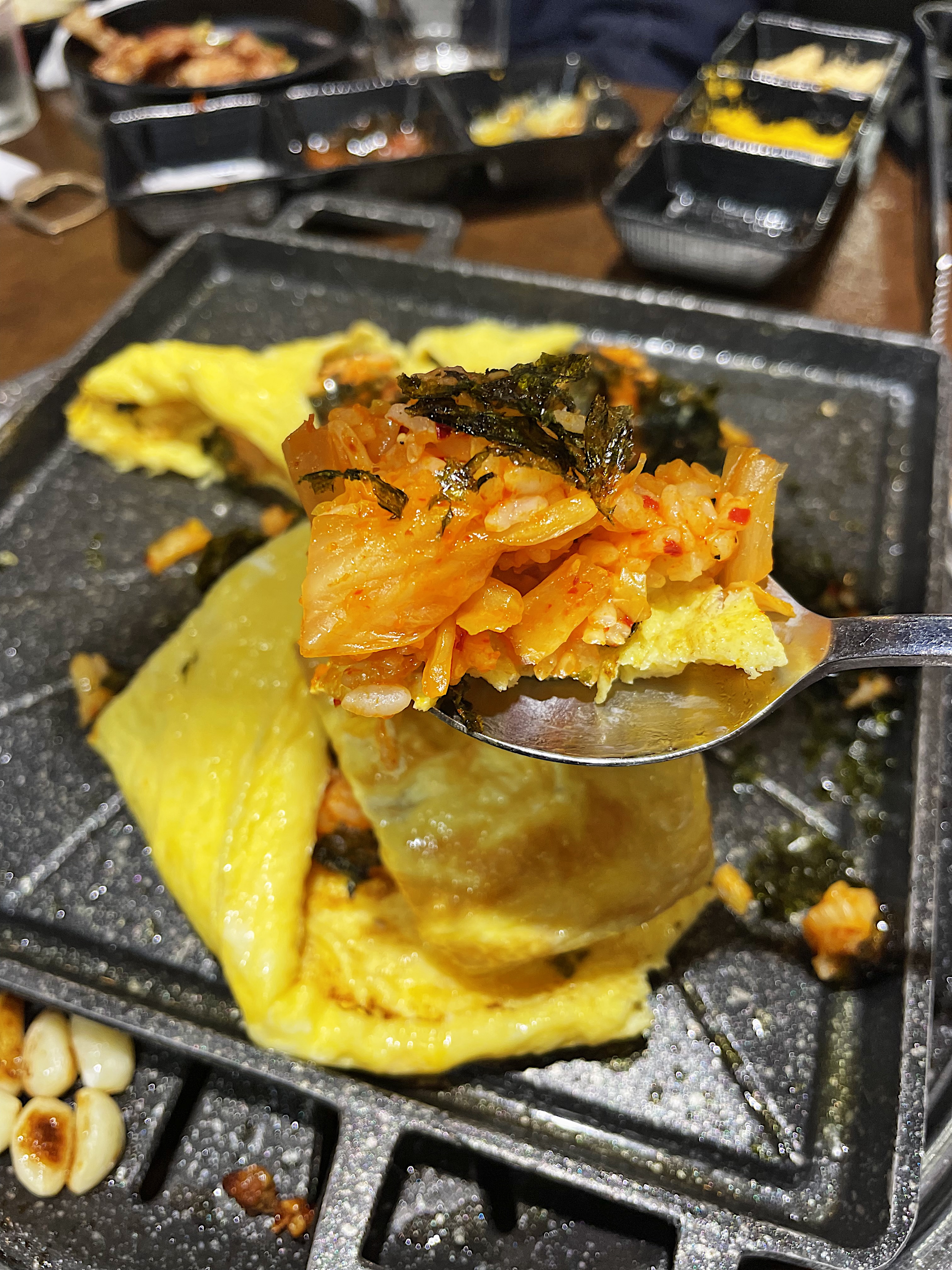 네모난 팬 위에 두툼한 달걀을 깔고 그 위에 묵은지와 밥을 볶아서 올려진 채로 가져옵니다.