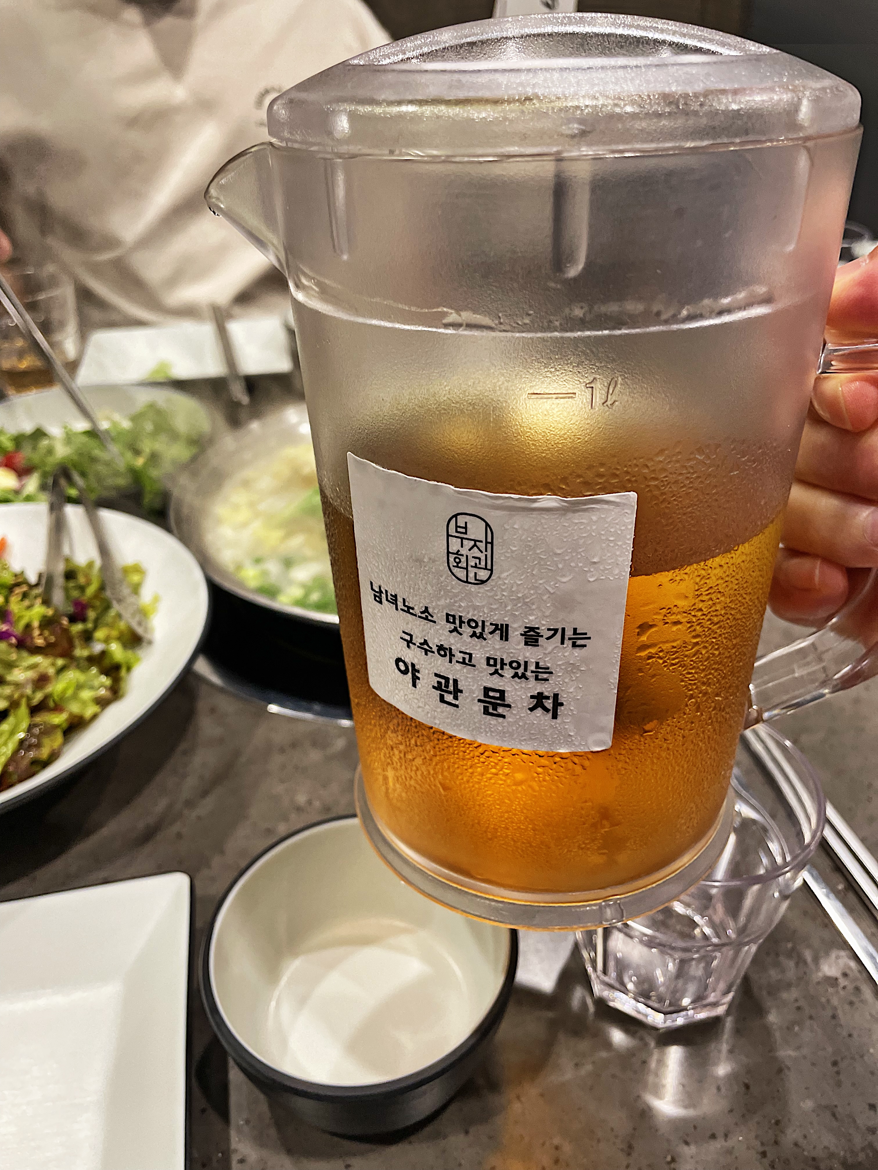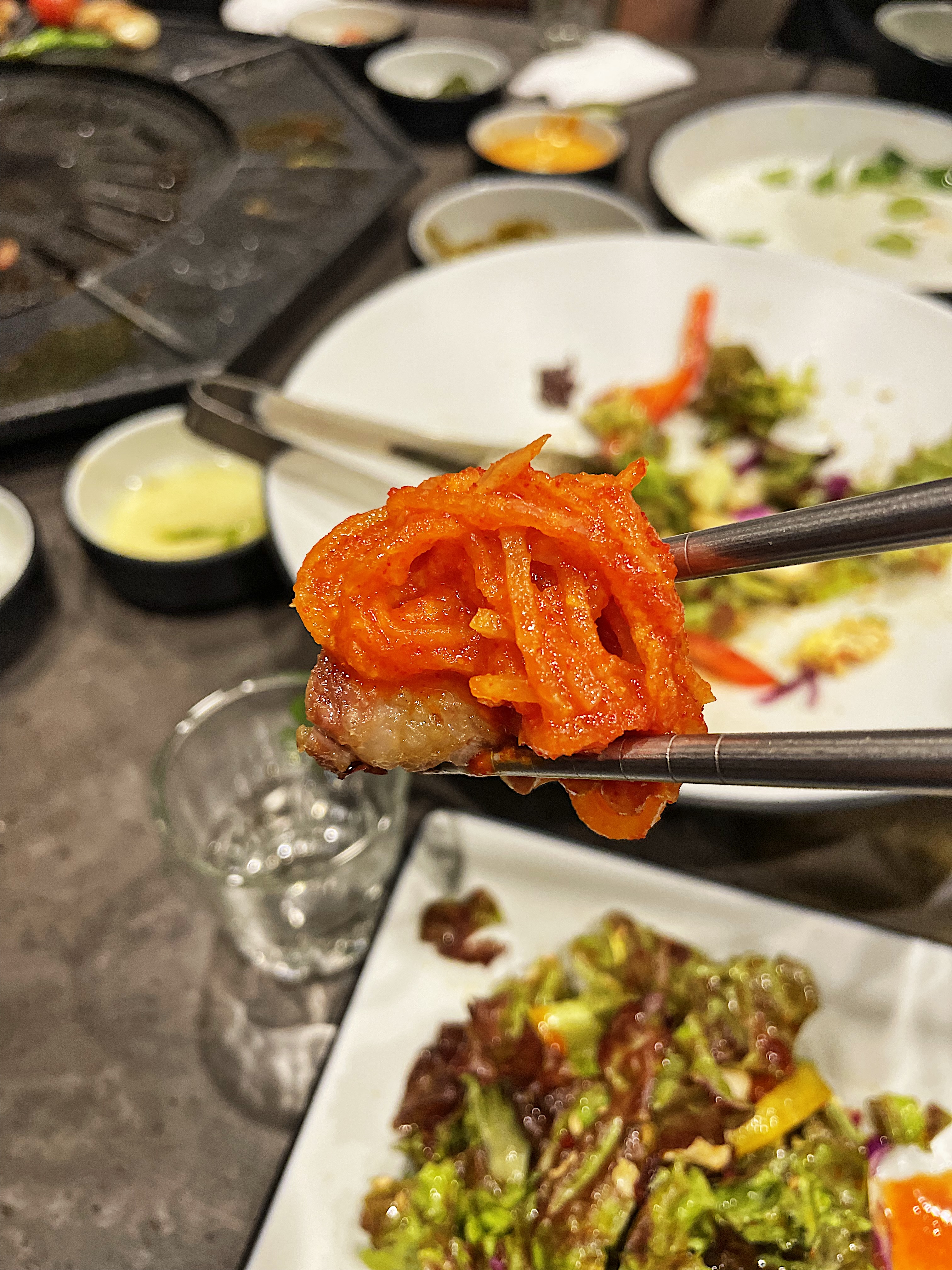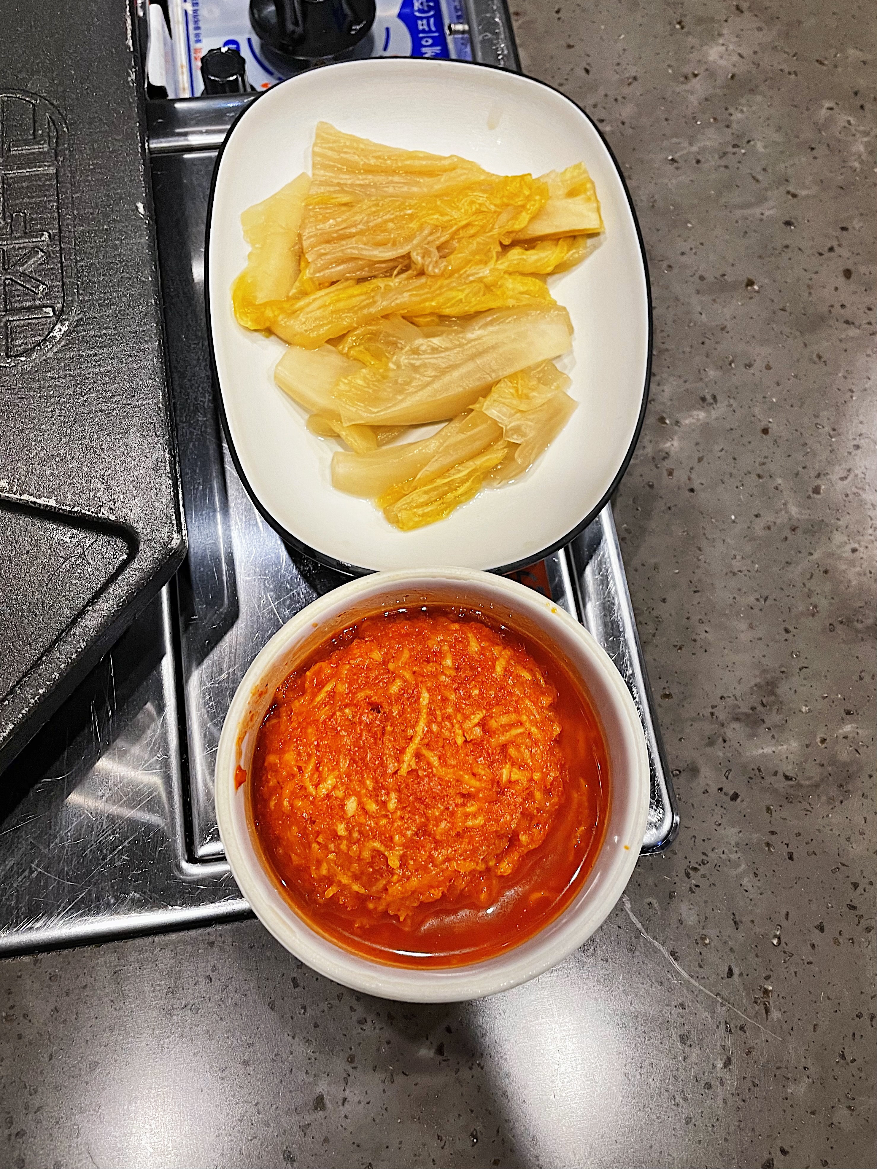 오른쪽의 겉절이는 리필이 가능한데, 왼쪽의 샐러드는 추가 주문 시 별도의 비용(3천 원)이 발생됩니다.