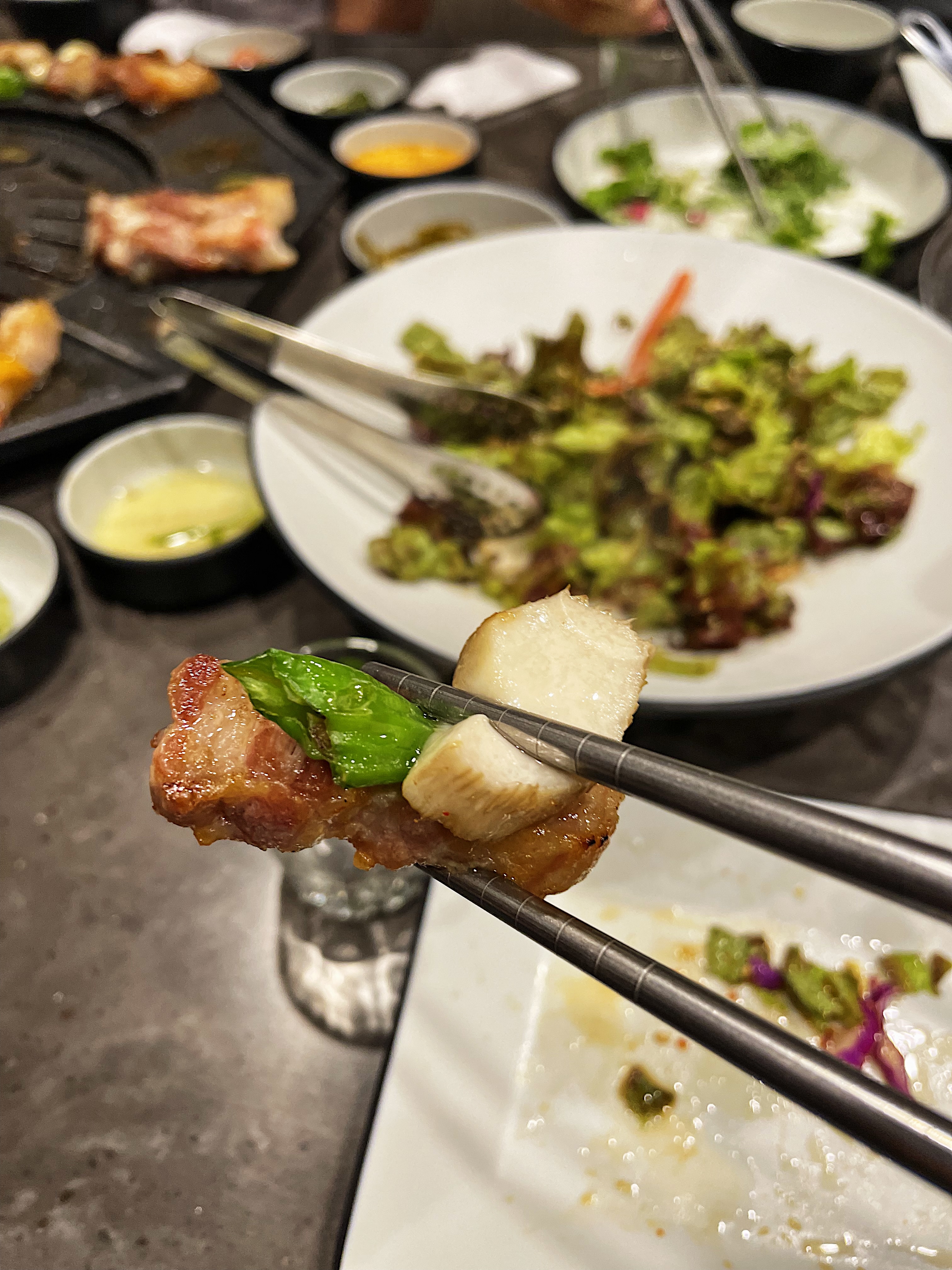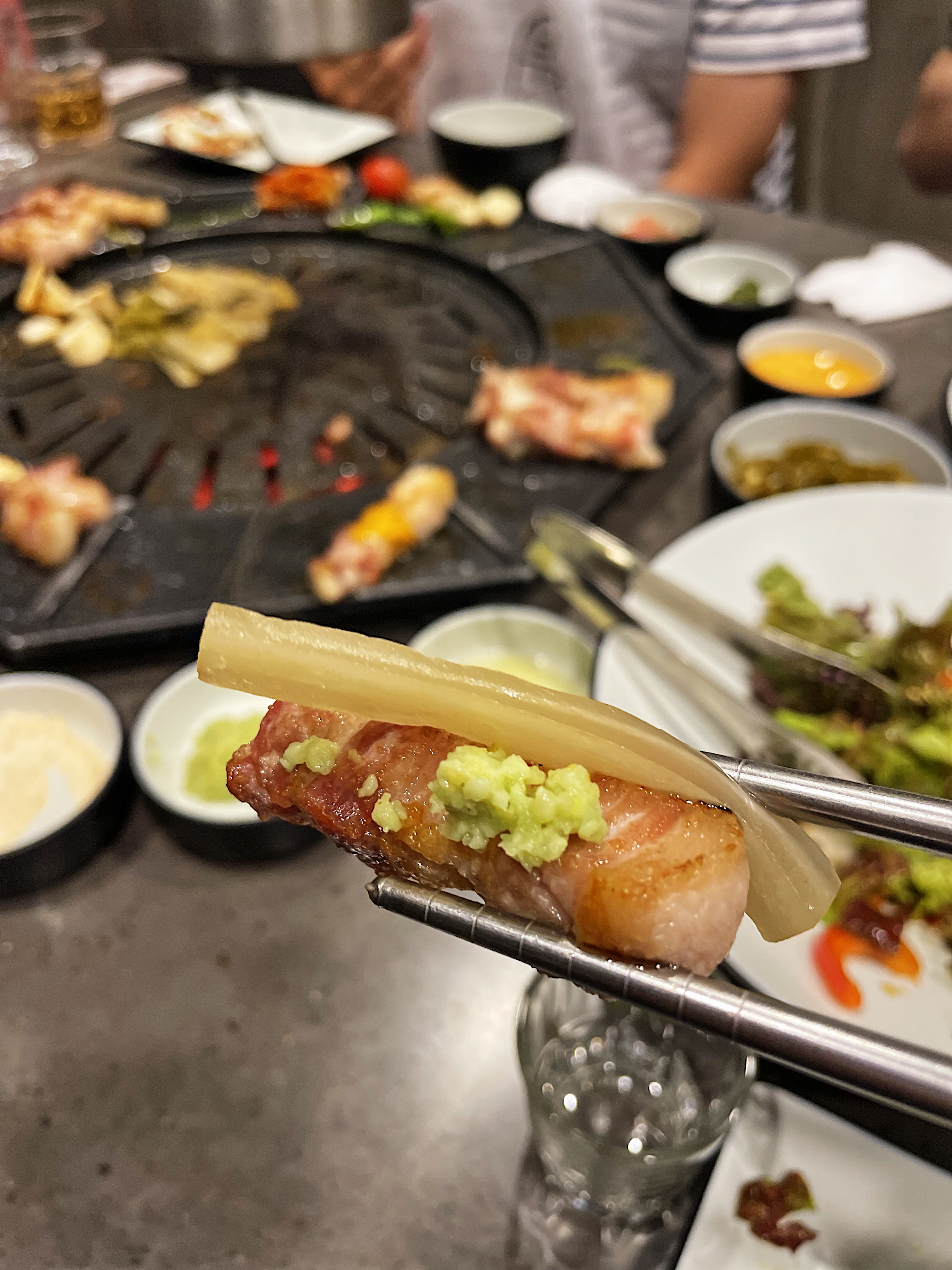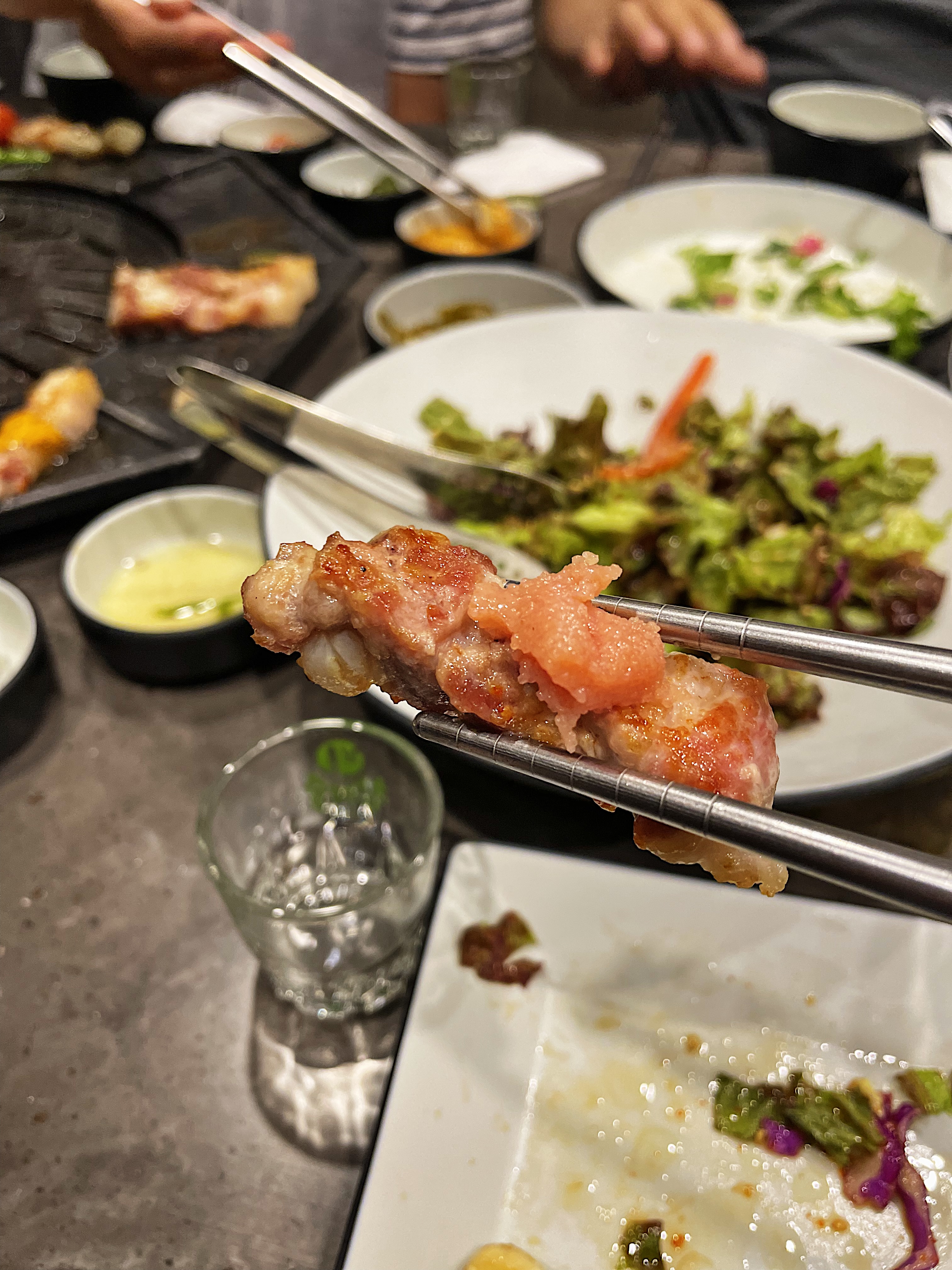 내가 직접 고기를 굽지 않아도 직원분께서 열심히 구워주시고 다 익은 고기는 불판 옆으로 빼서 각종 소스를 올려서 먹어보라고 추천까지 해주시더라구요.