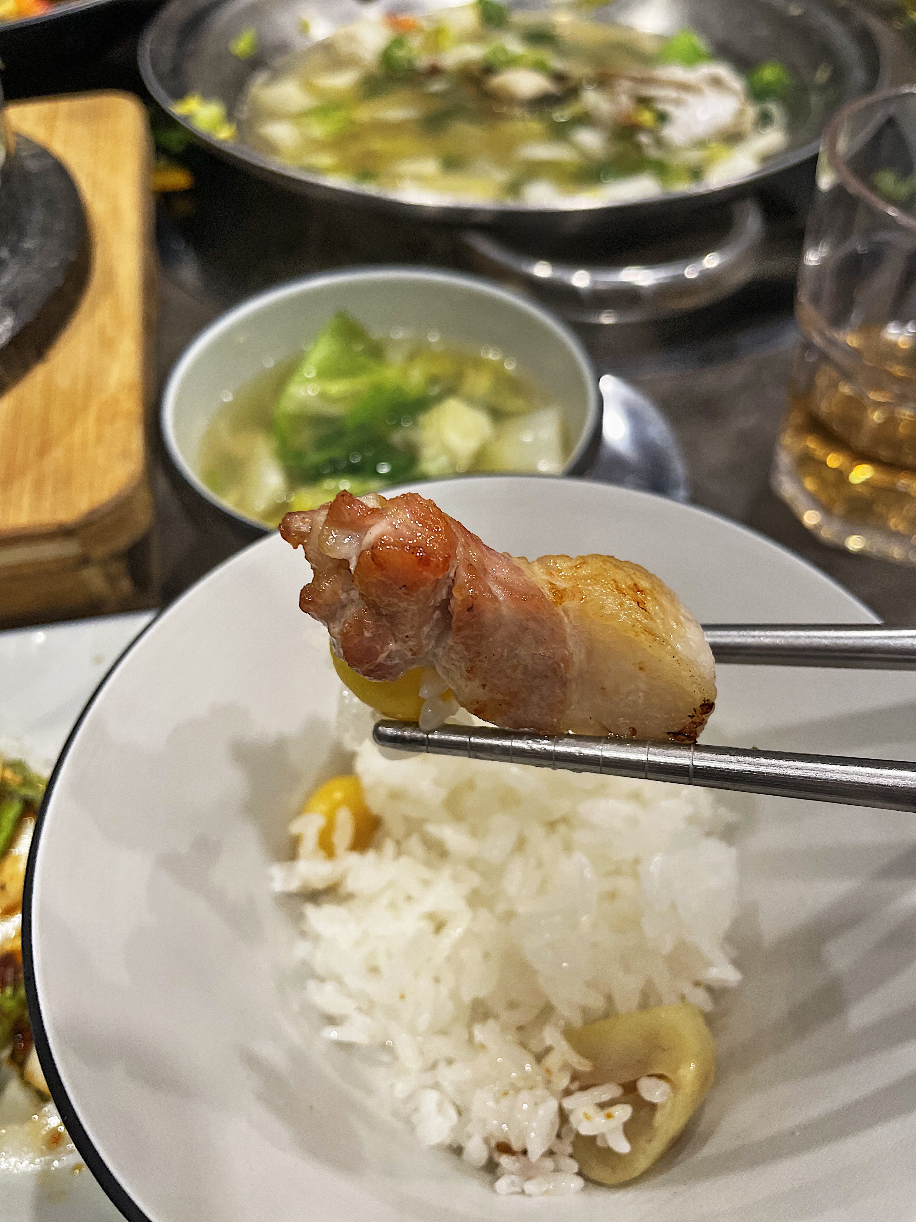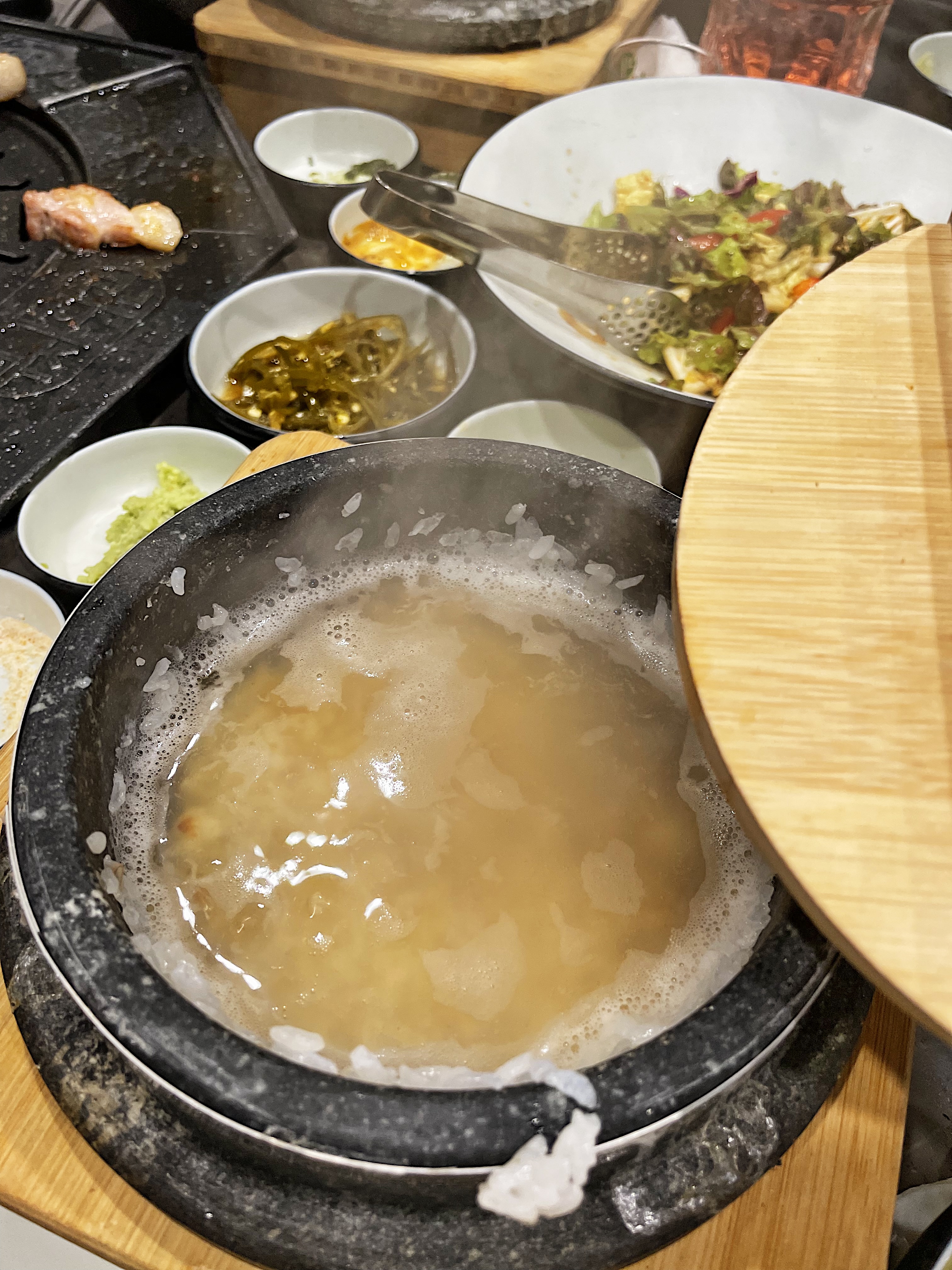 느끼한 고기를 먹은 다음 솥밥과 숭늉, 그리고 우렁된장찌개로 입안을 깔끔하게 마무리합니다.