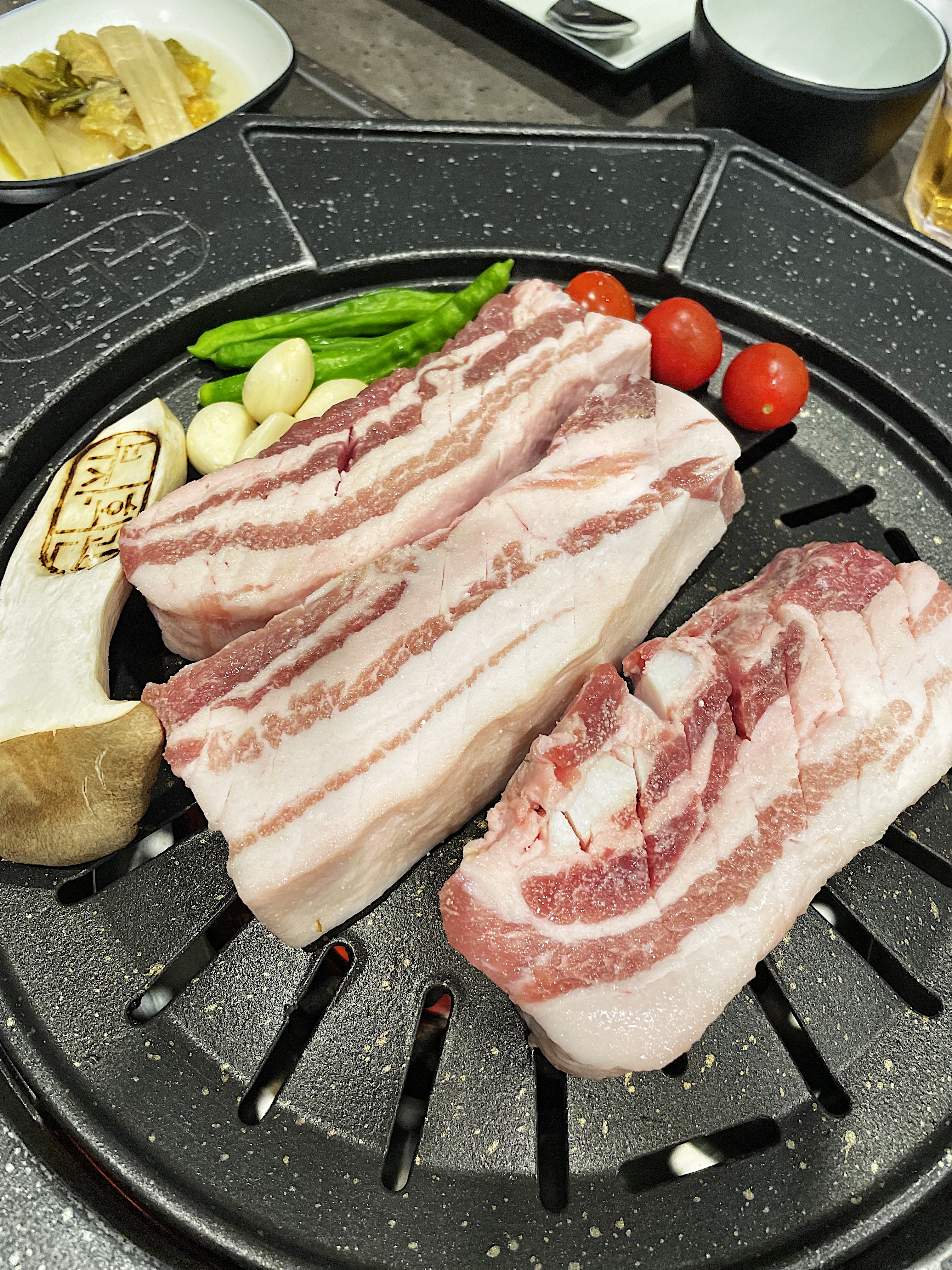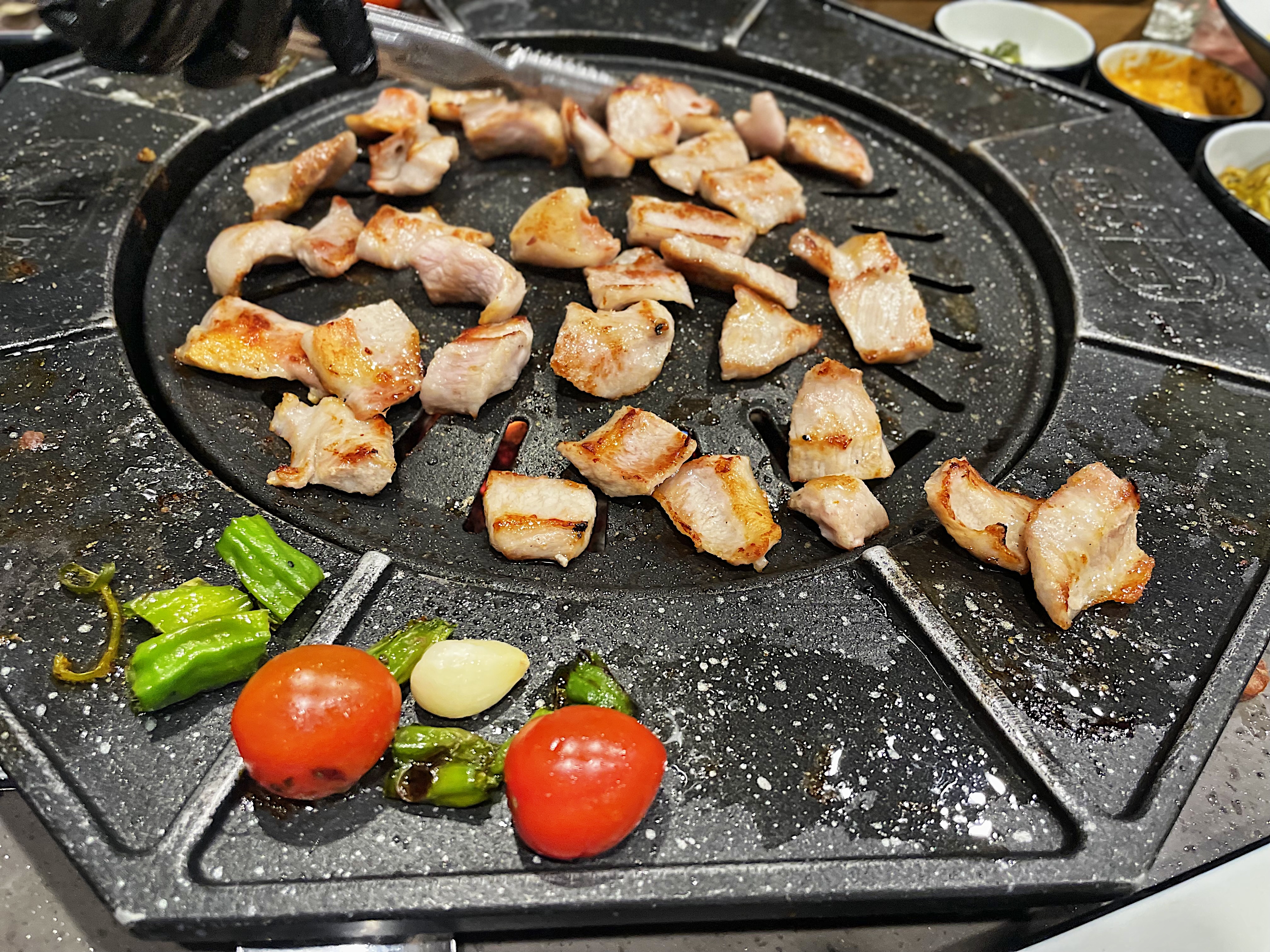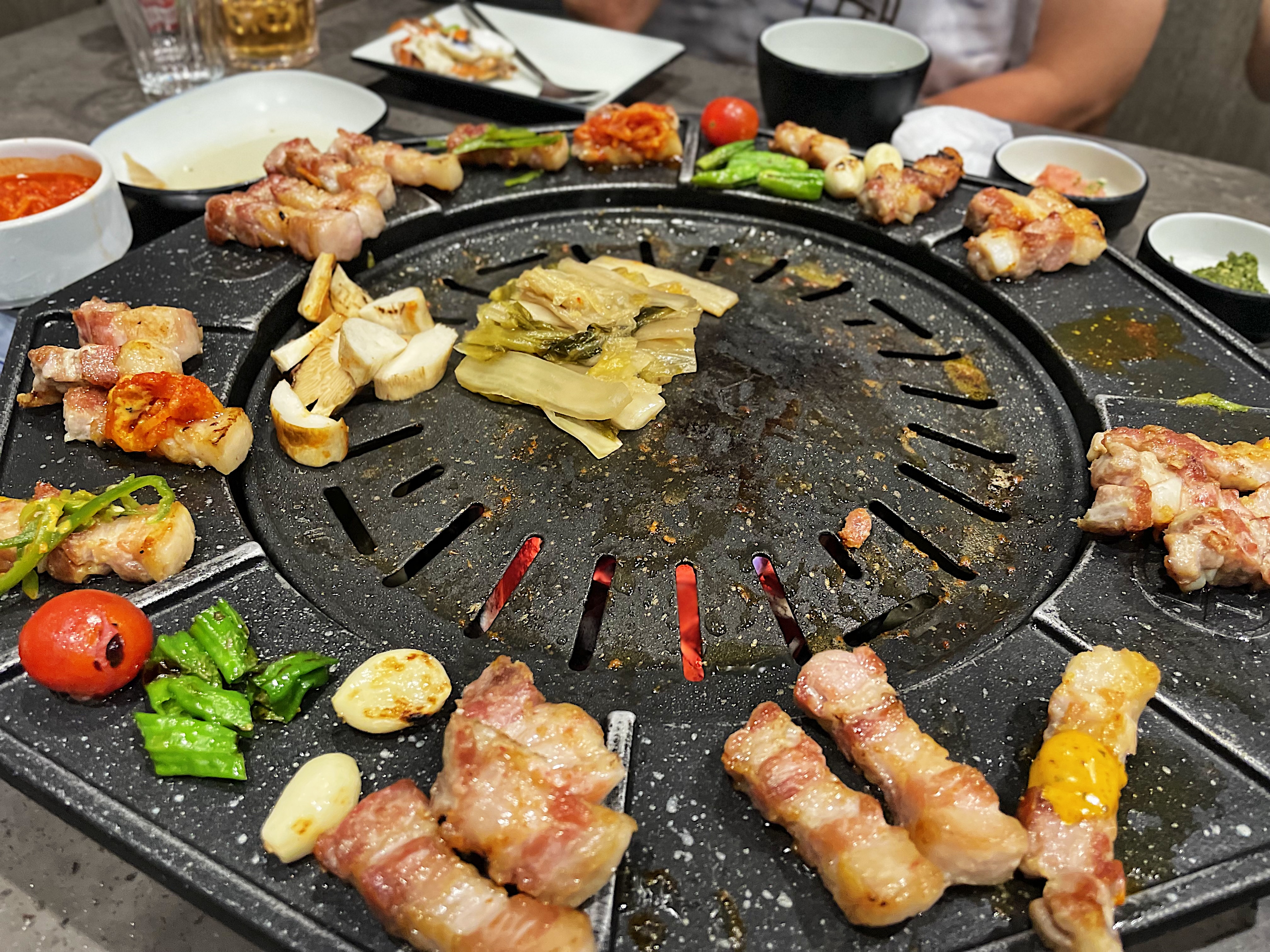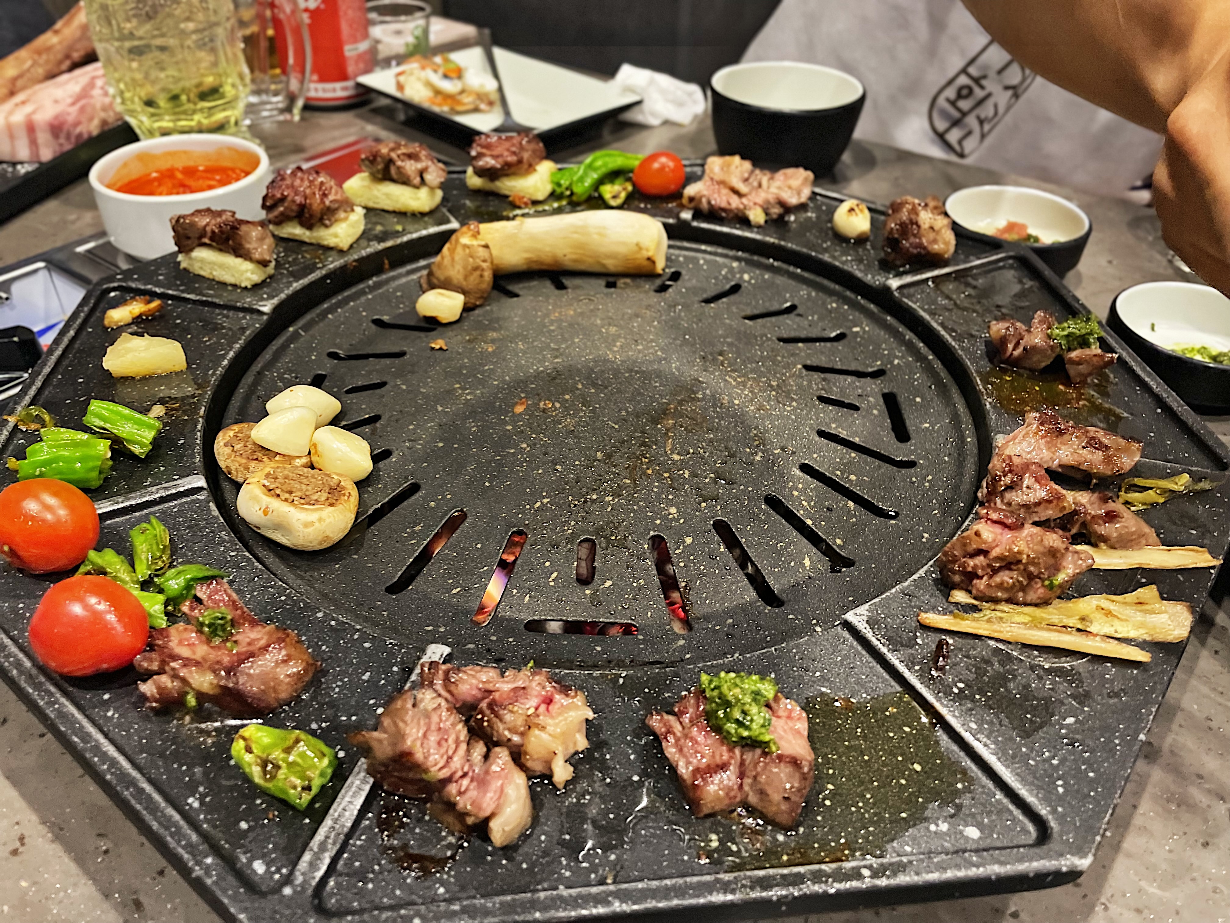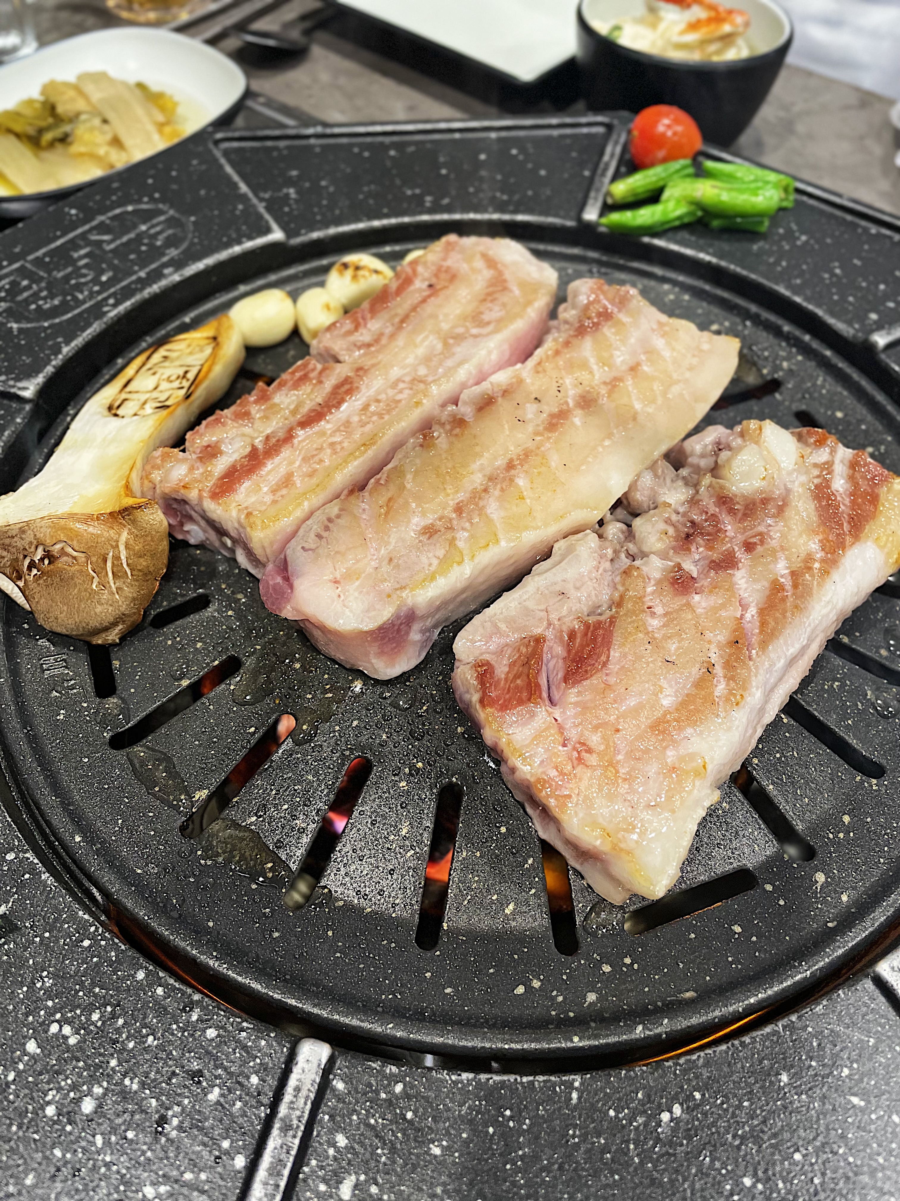불판의 모양이 특이한데, 동그란 불판 주변으로 익은 고기를 올려둘 수 있습니다.