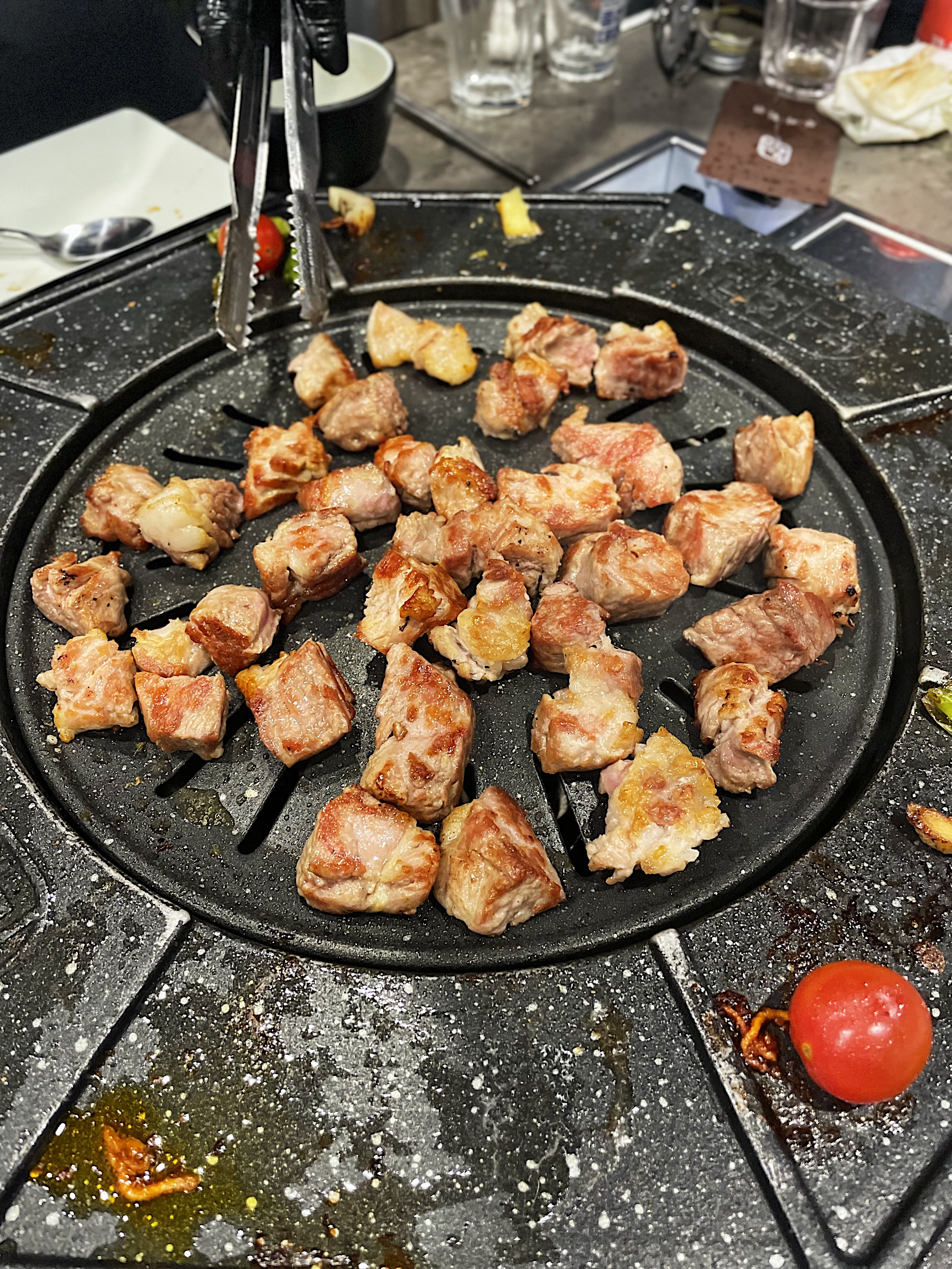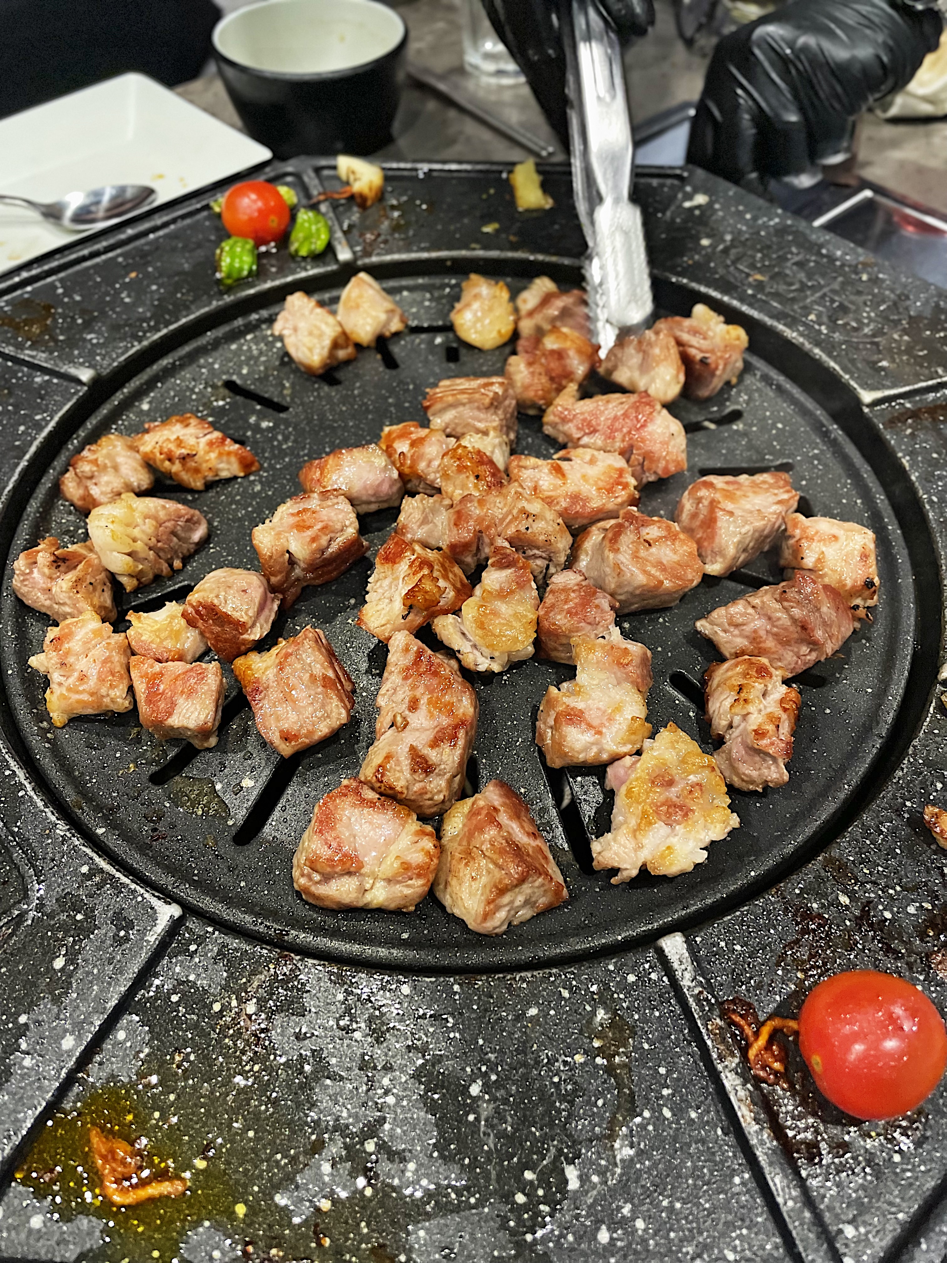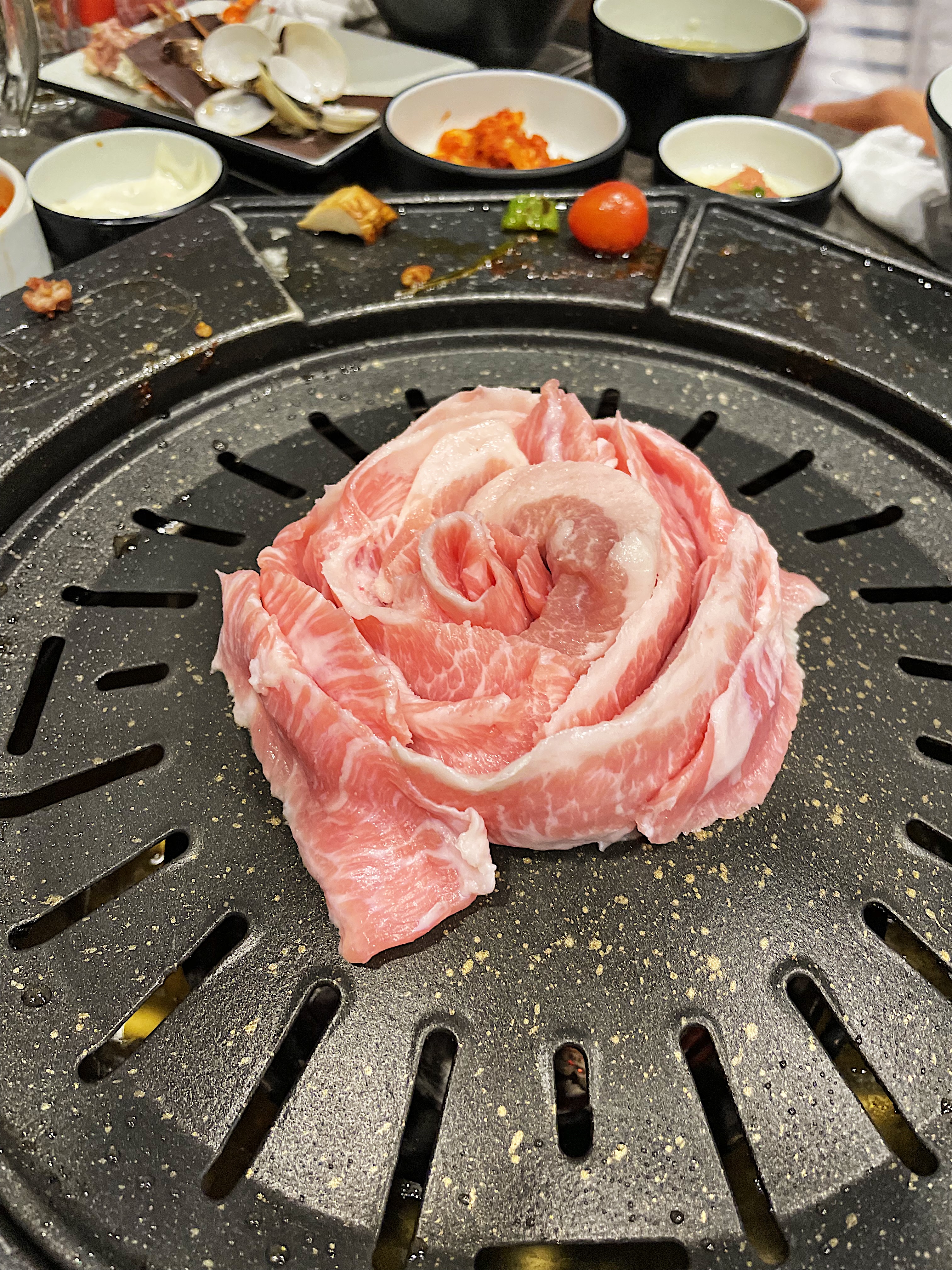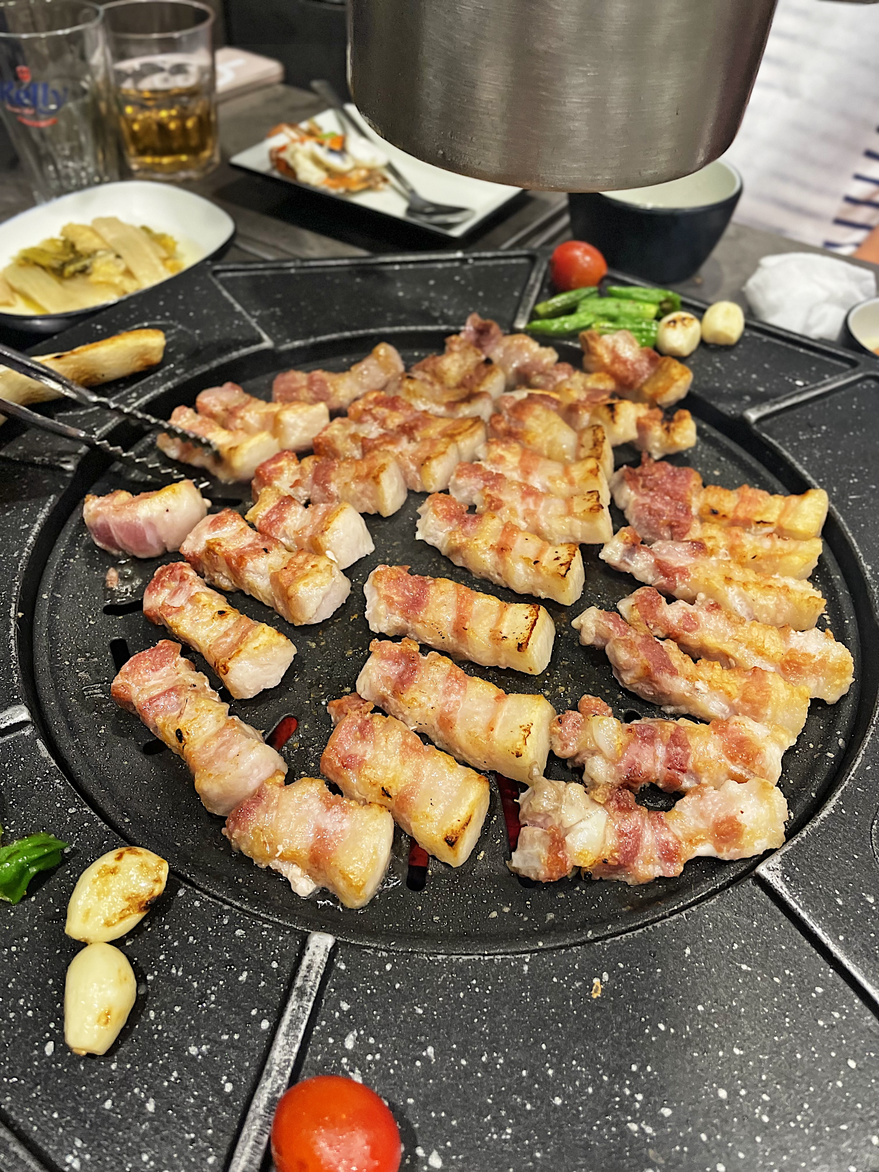 불판의 모양이 특이한데, 동그란 불판 주변으로 익은 고기를 올려둘 수 있습니다.