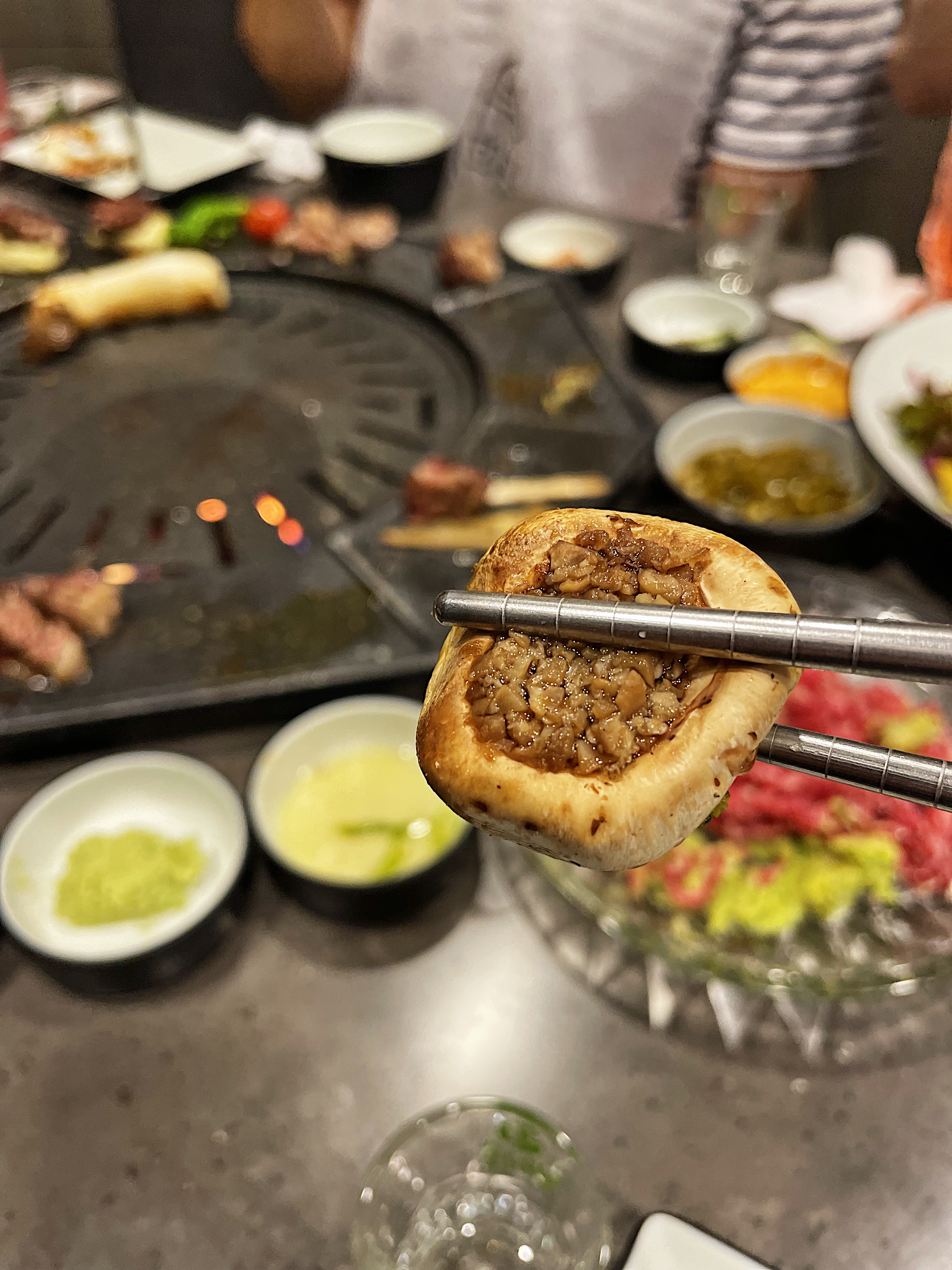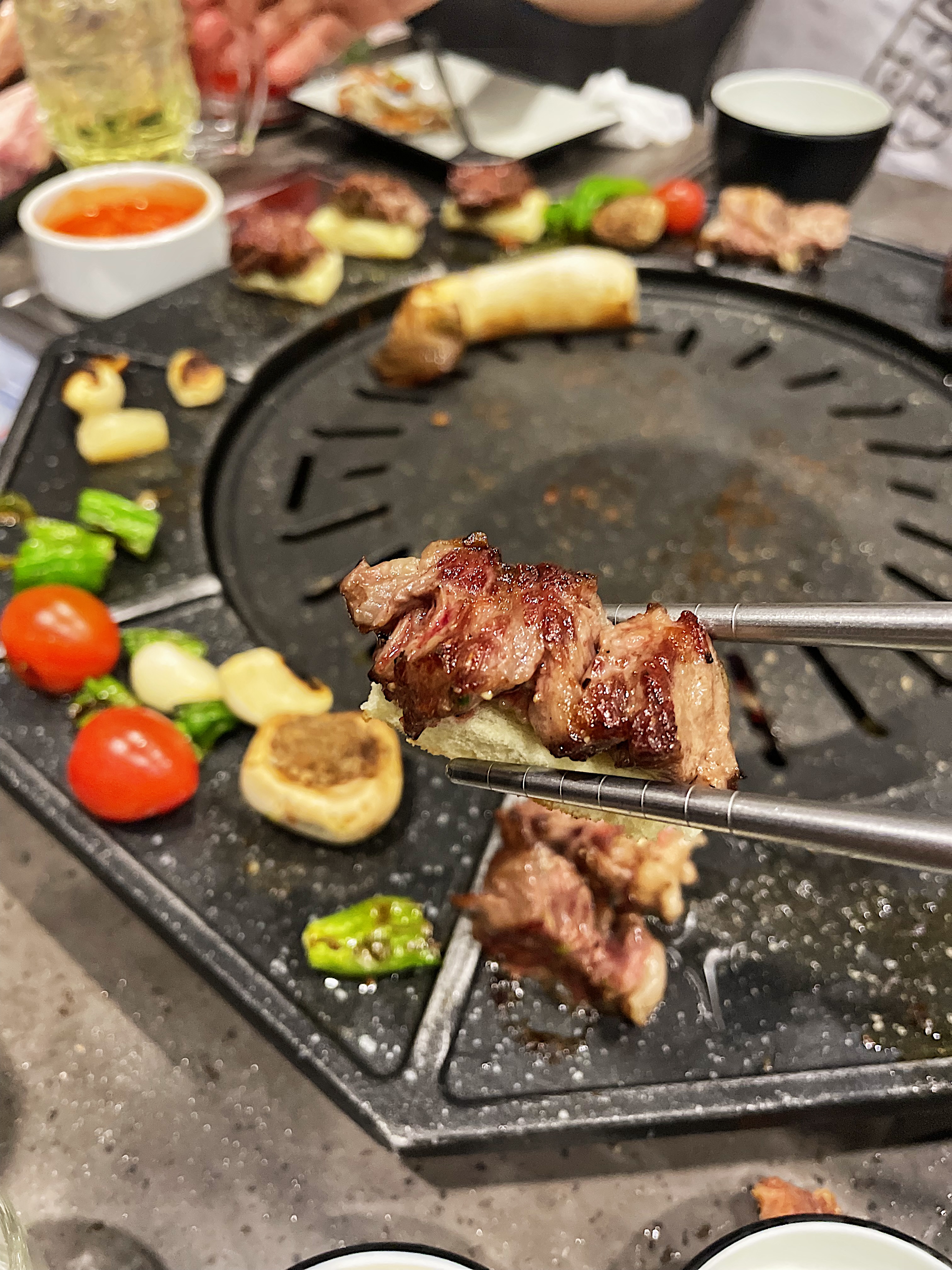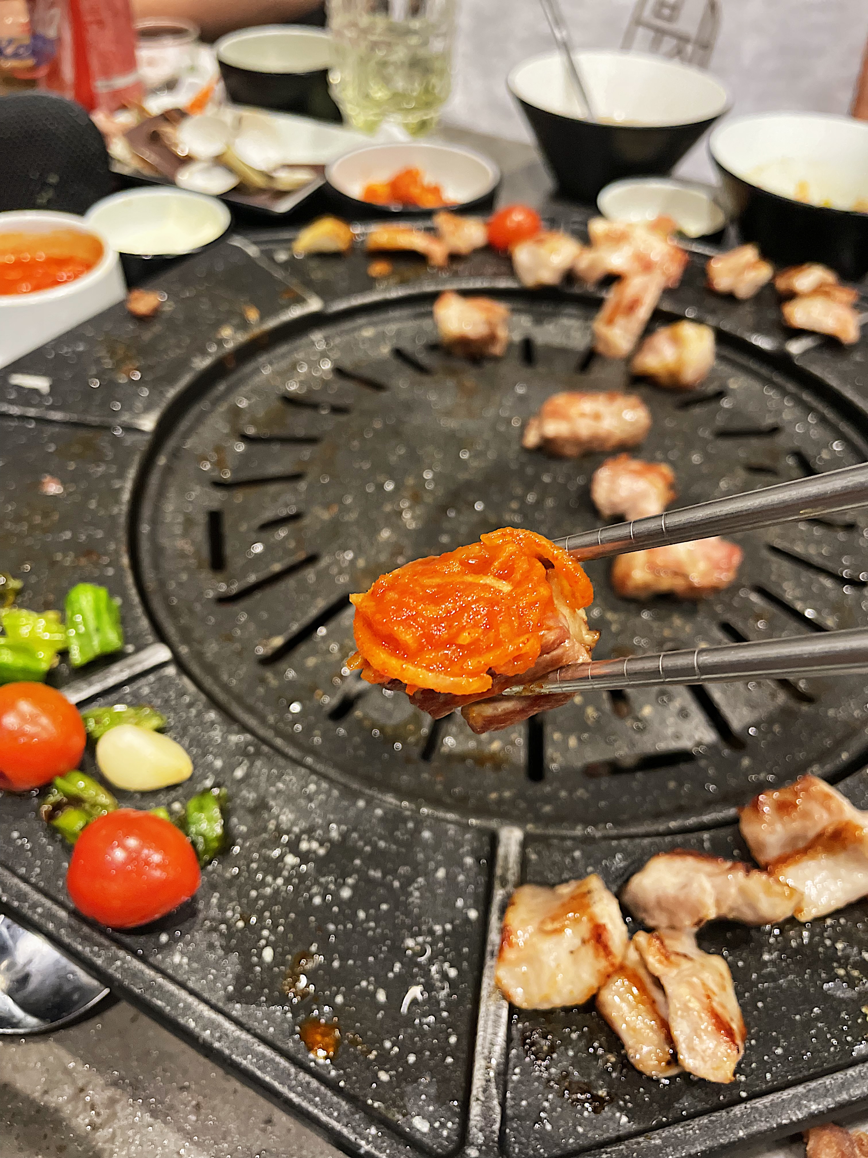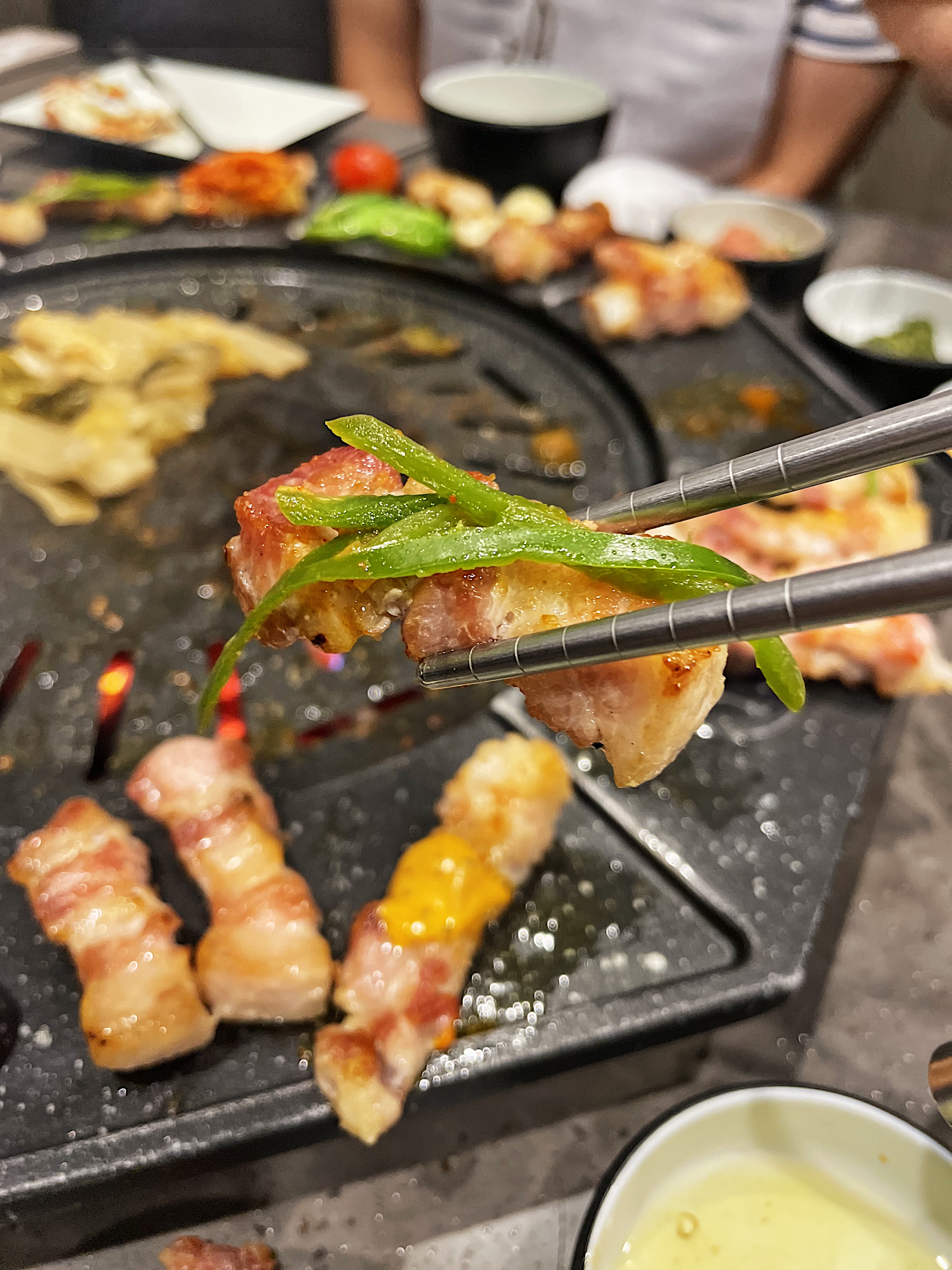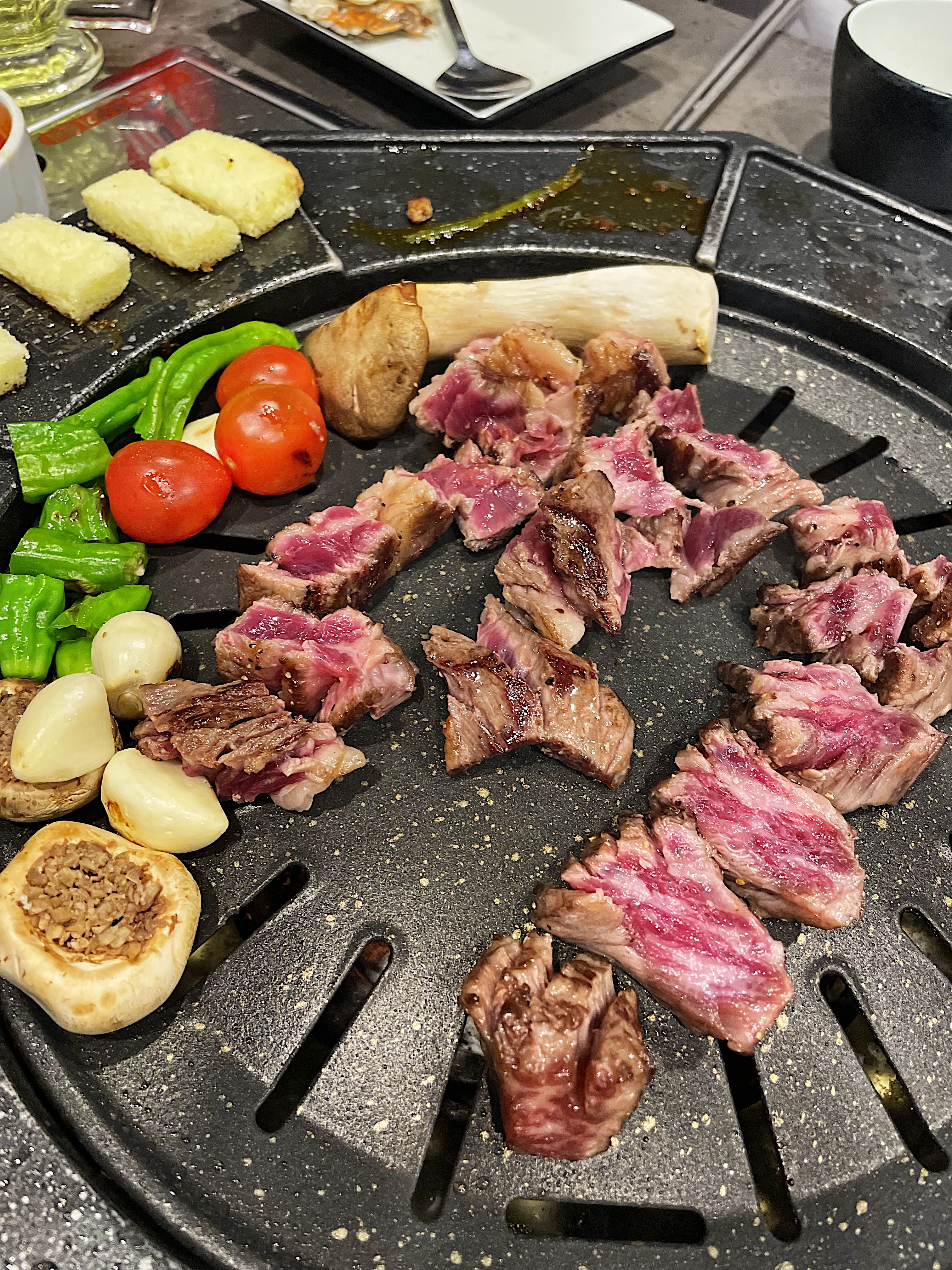 불판의 모양이 특이한데, 동그란 불판 주변으로 익은 고기를 올려둘 수 있습니다.