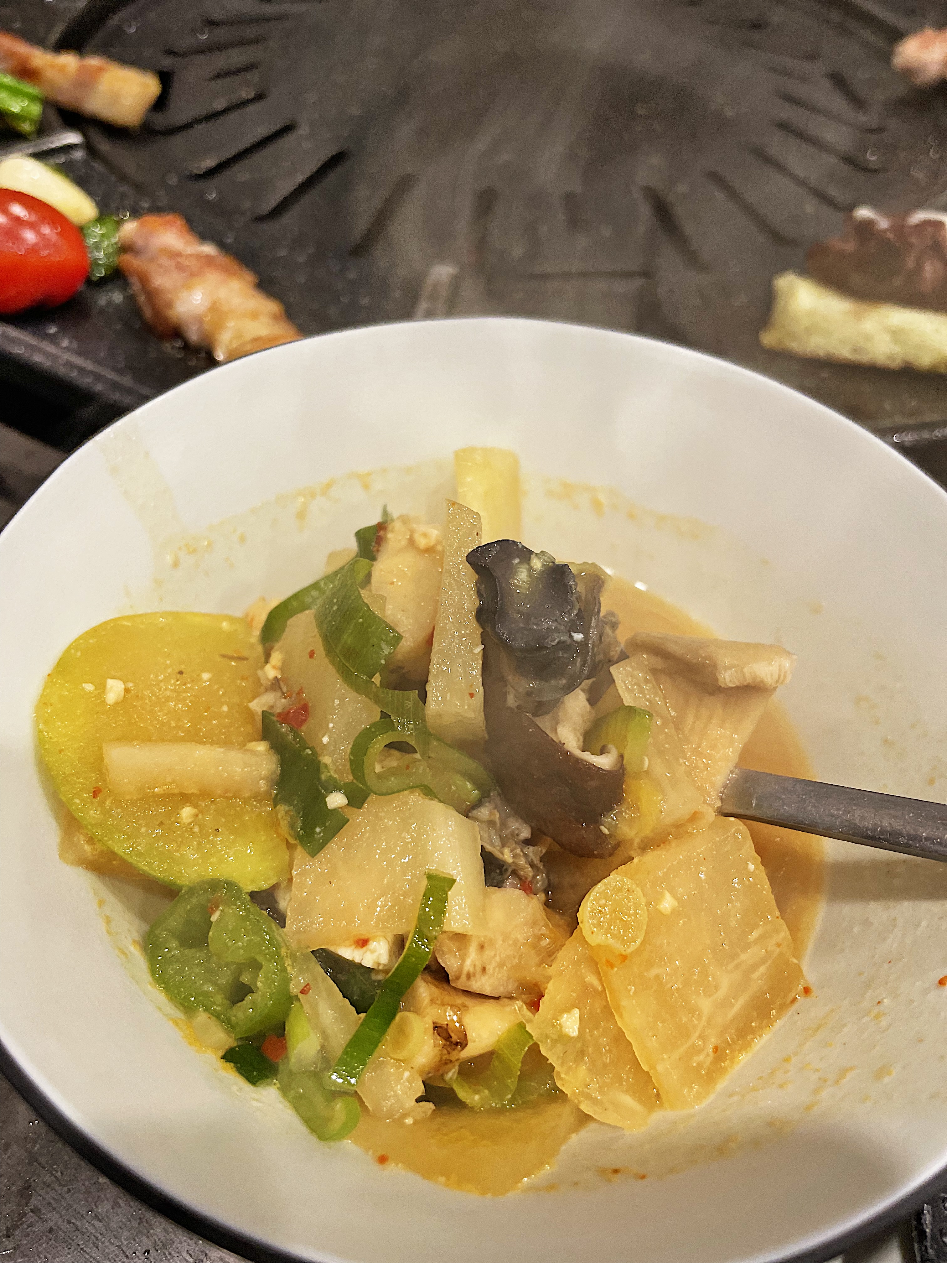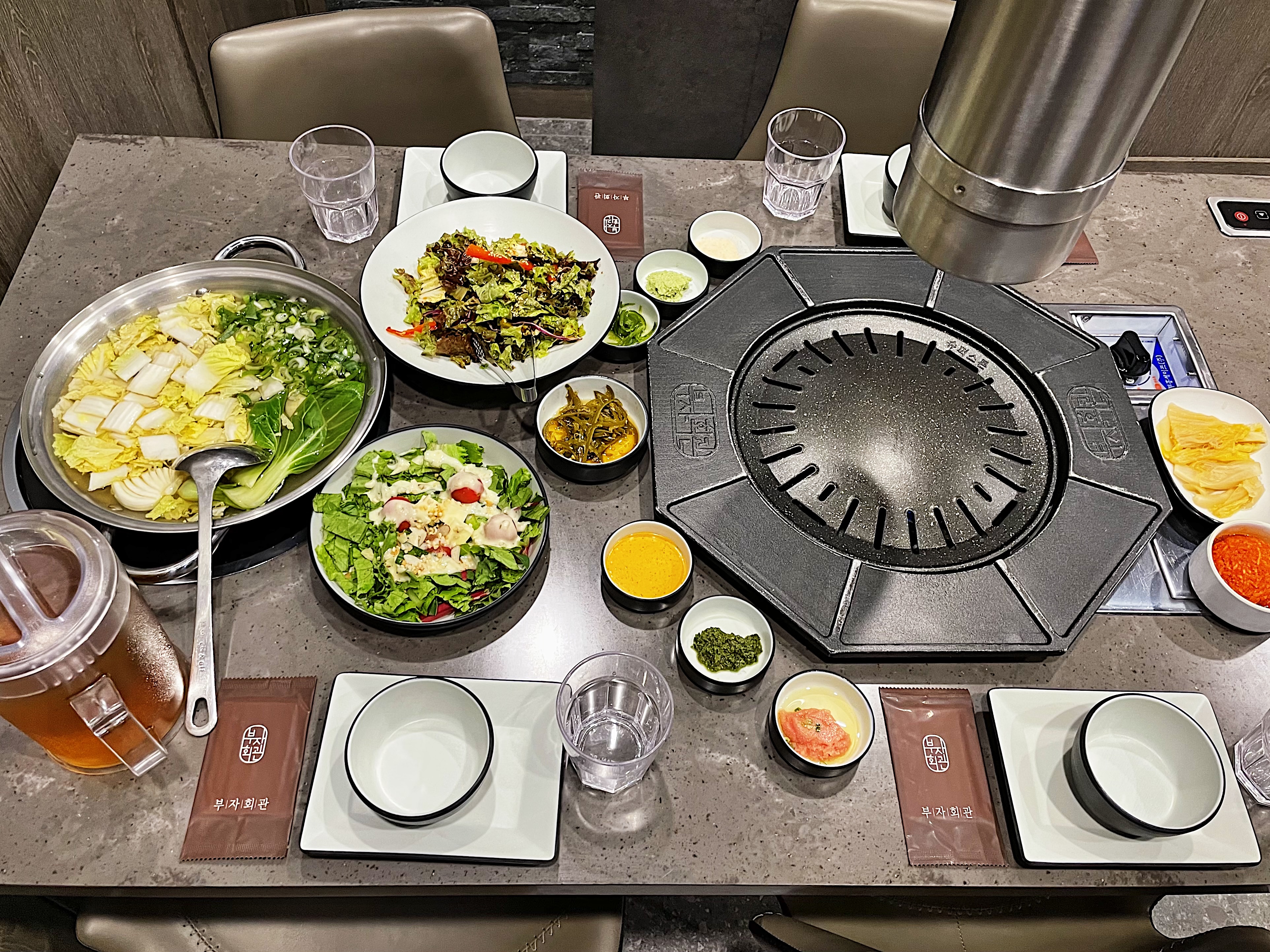 상 위에 고기 불판 외에 냄비를 끓일 수 있는 버너도 함께 구성되어 있는 건 좋더라구요.
