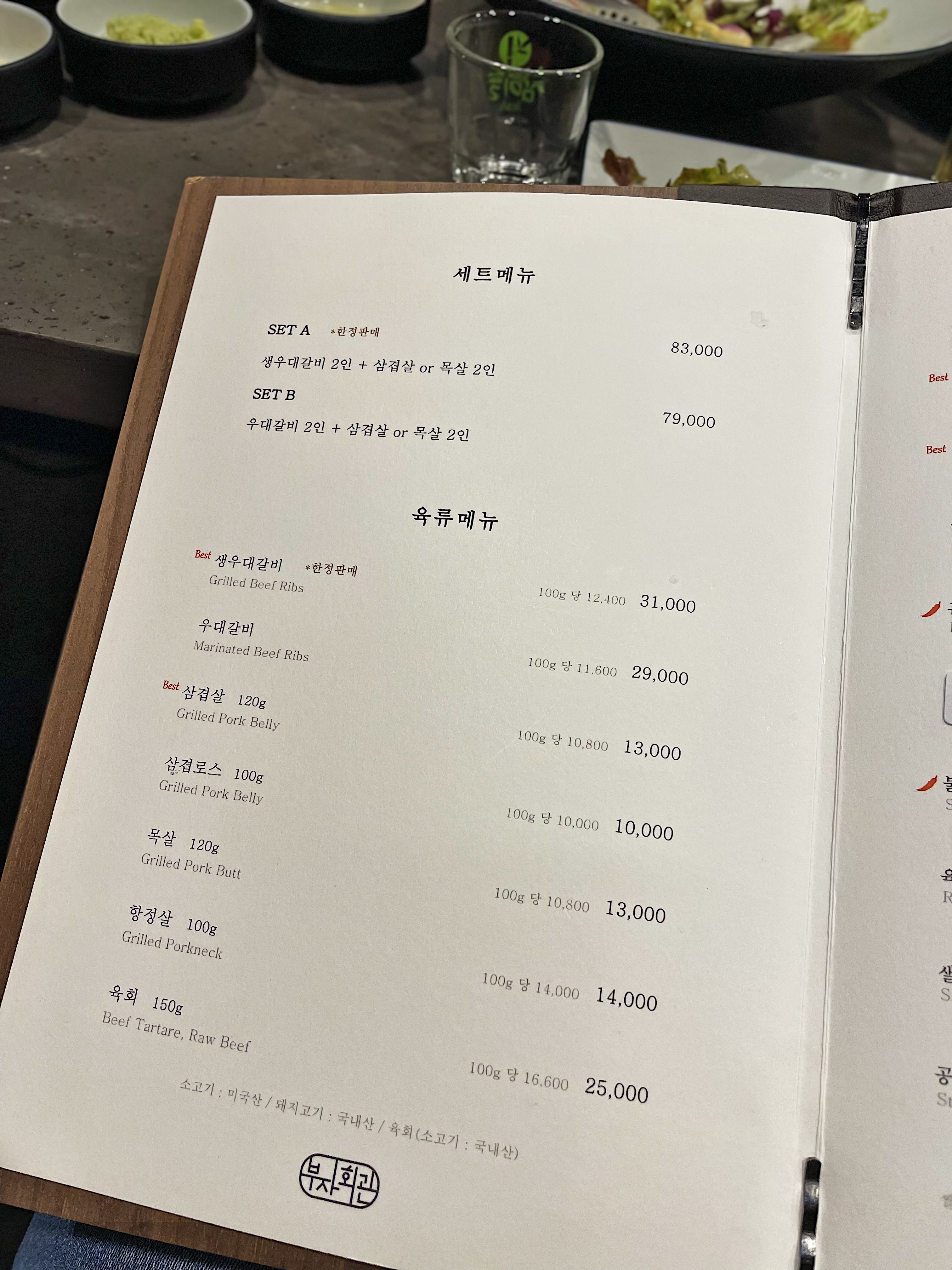 주요 메뉴는 우대갈비와 삼겹살, 목살, 항정살, 육회, 등인데요.