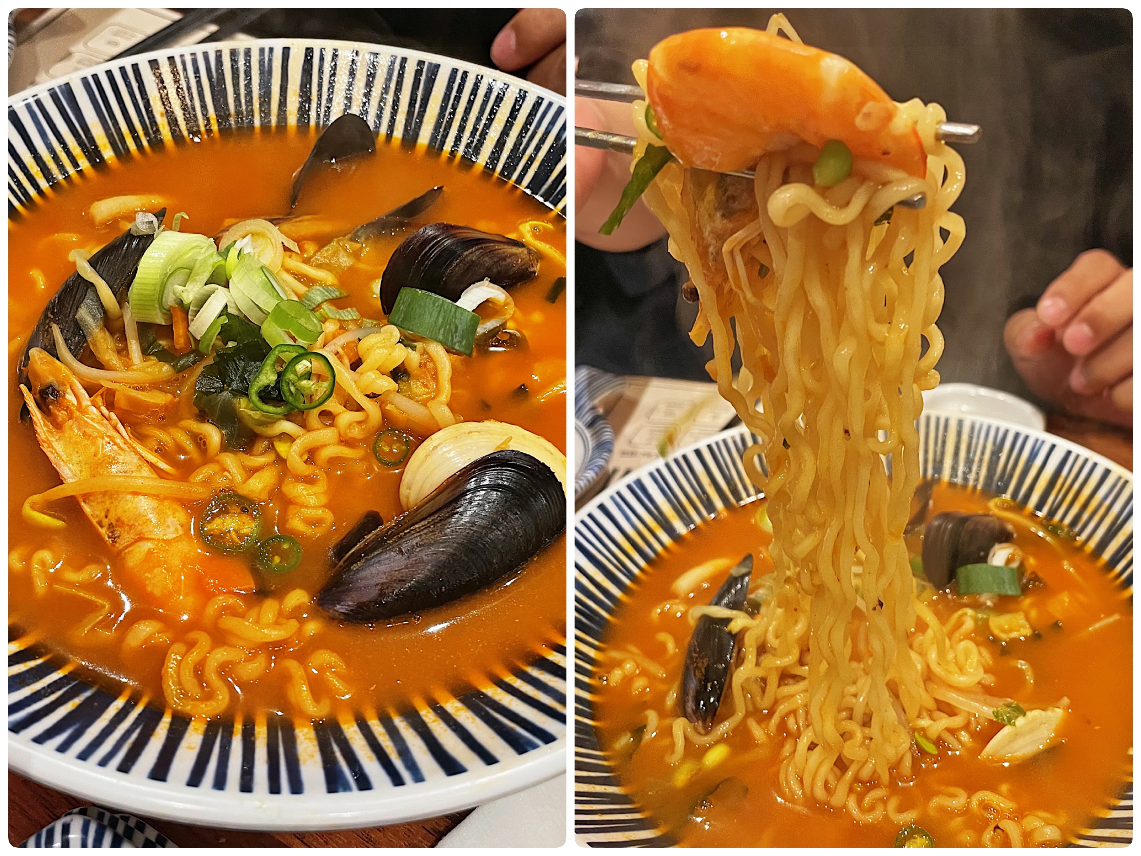 식후로 주문한 라면에는 새우, 홍합, 바지락 등 해산물이 가득 들어가 국물이 얼큰하고 시원해 모두가 극찬을 아끼지 않던 메뉴였습니다.