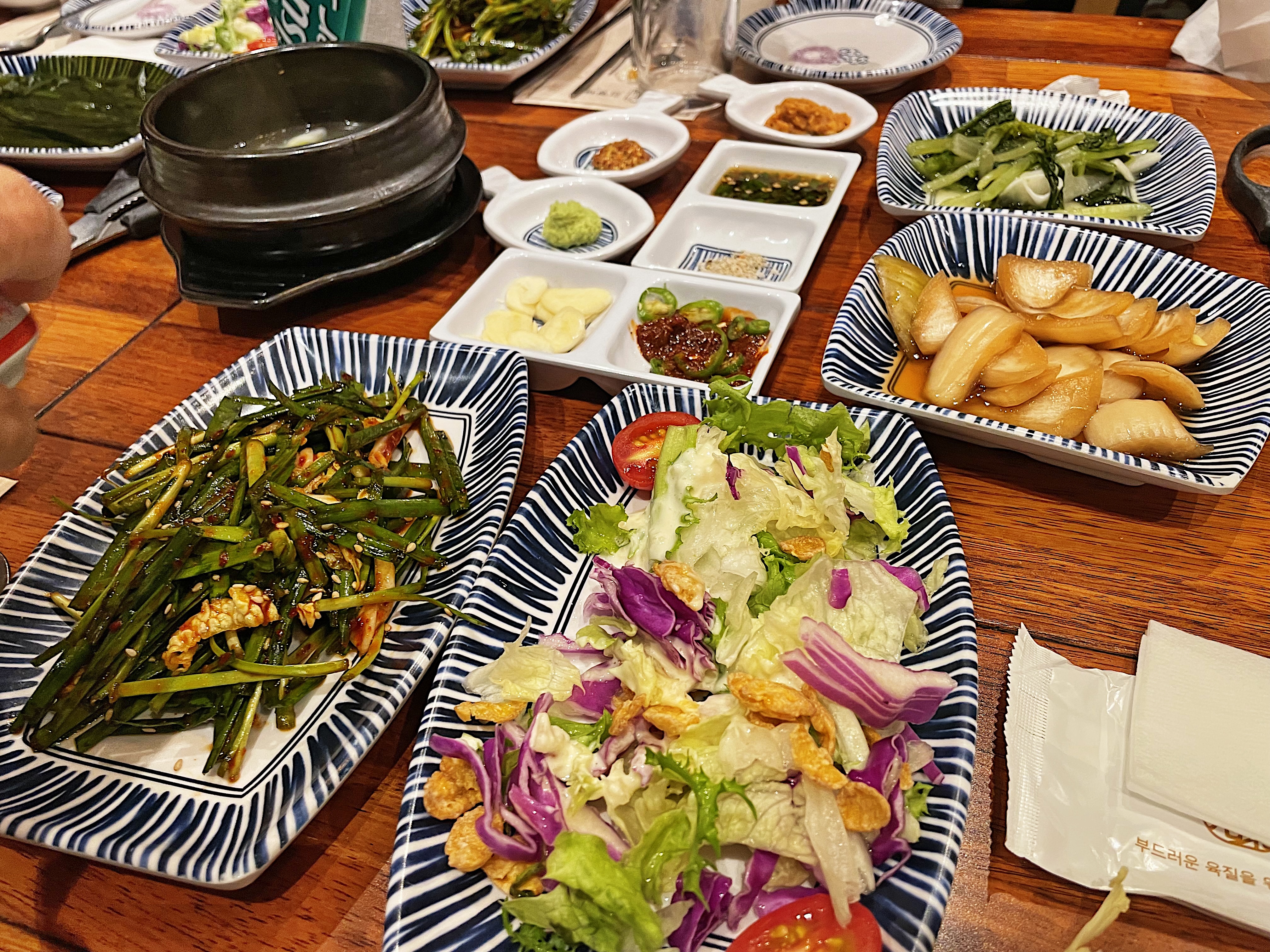 부추 겉절이, 양상추 샐러드, 열무 물김치, 명이나물, 양파 장아찌, 알배기 배추 등 깔끔하고 고기과 어울리는 반찬들이라 개인적으로 만족스러웠습니다.