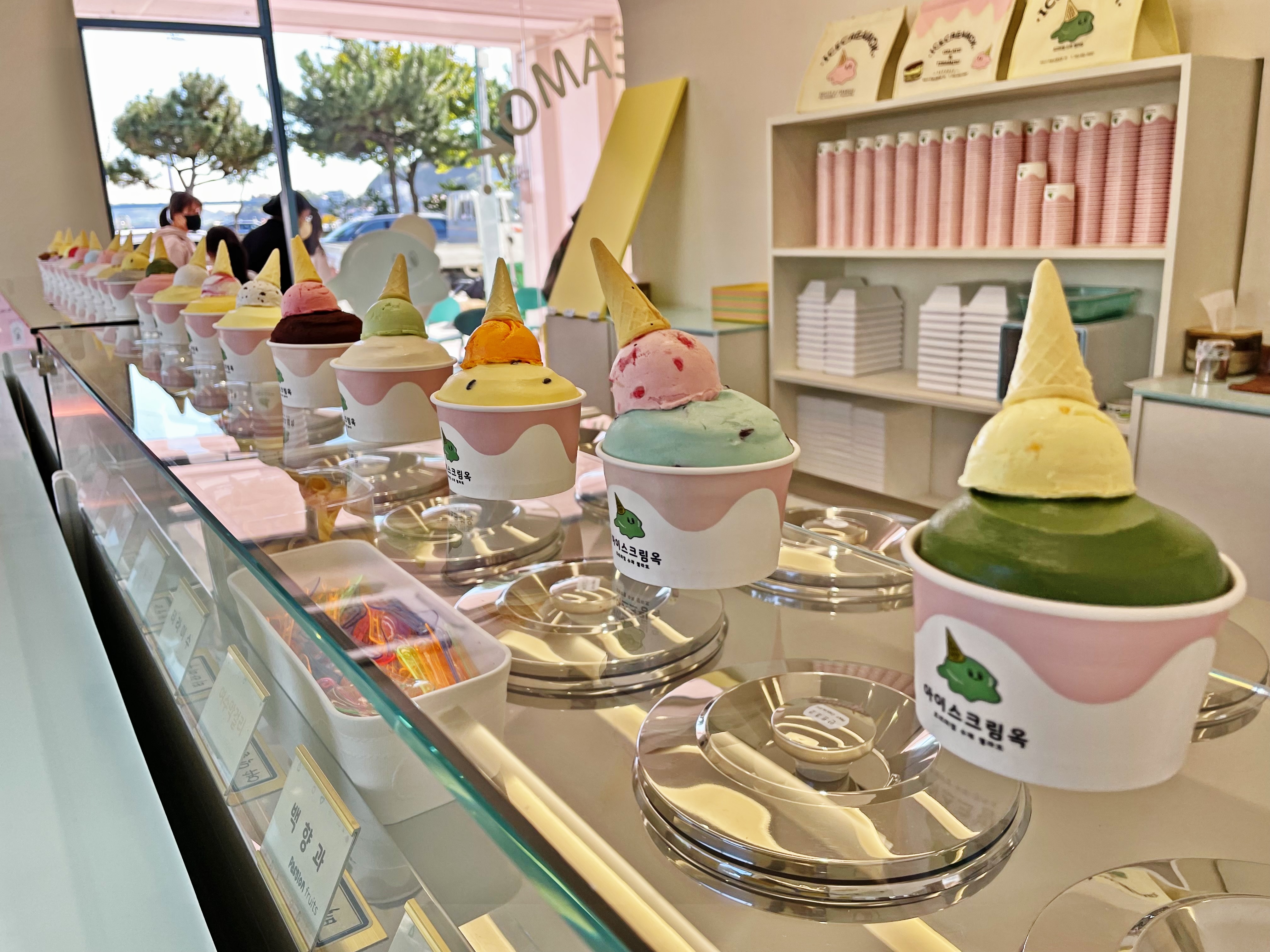 해풍 쑥, 티라미수, 딸기, 여수 핑크 생막걸리, 백향과, 페레로로쉐, 애플망고, 흑임자, 샤인 머스캣, 피스타치오, 복숭아, 초코, 블루베리요거트, 리조, 여수 유자, 레몬, 두리안, 민트 초코, 쿠앤크, 바닐라