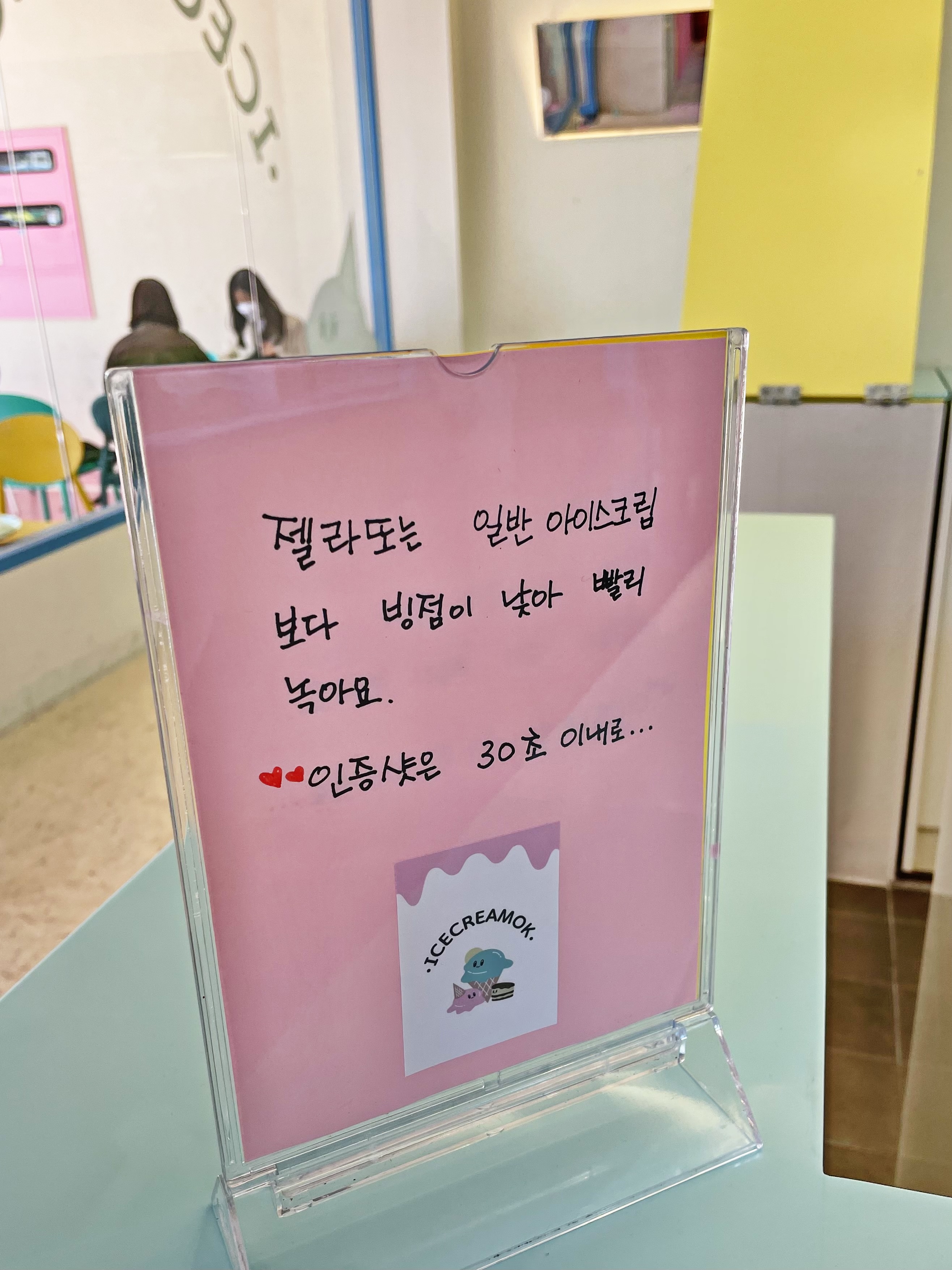 젤라또는 일반 아이스크림보다 빙점이 낮아 빨리 녹기 때문에 인증샷은 30초 이내로 찍으라는 친절한 안내문구도 있습니다.